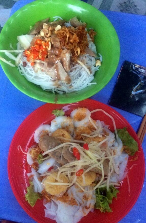 En redescendant (pieds nus pour Nhung qui a cassé ses tongs dans un des escaliers !), ils me proposent de manger avec eux avant que nos chemins se séparent. On goûte tous les 3 les spécialités de Da Nang qu’ils ne connaissent pas non plus, on est unanimes, ce n’est pas très bon. Enfin, moi, j’aime beaucoup ces petites chips frites !! “C’est quoi ?” J’ai le malheur de demander… je les vois rigoler, j’ai peur. Réponse : “c’est la couche supérieure de la peau du cochon que l’on fait cuire dans l’huile” aaaaah … bon bah c’est gras, pas de doute, mais plutôt bon !