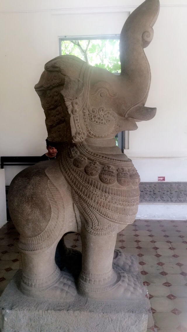 Je pensais aller au site archéologique de My Son sur la route du retour à Hoi An, mais la météo, les avis plus que mitigés sur internet (principalement lié à l’état “en ruine” des temples) et la distance ont finalement eu raison de moi. Je me suis donc rabattue sur le musée Cham de Da Nang. Un peu surprise par le prix (45 000 VND ! environ 1,80€ : cher pour un musée ici) je rentrais dans le musée et étais surprise de nouveau … par la taille minuscule du musée. De jolies pièces cependant, des sculptures Cham récupérées de tout le Vietnam du Sud. Je repartais un peu sur ma faim, à deux doigts de changer d’avis et d’aller à My Son finalement pour voir l’ensemble de cette culture Cham. Mais j’ai eu la chance de tomber sur un groupe de français en visite avec un guide ! Je me suis donc incrustée dans le groupe et ai pu bénéficier de toutes les informations super intéressantes que le guide présentait. Il a notamment expliqué la formation des frontières (par la France) entre les pays du Cambodge, du Laos et de la Chine avec le Vietnam.