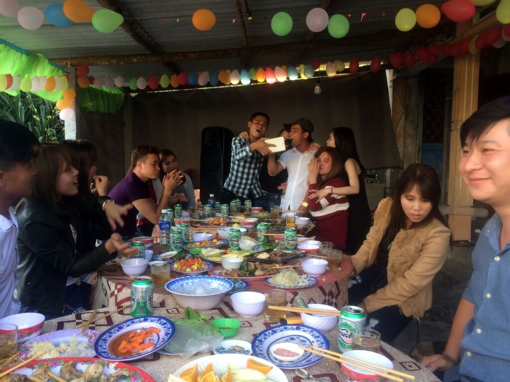 Quand les enfants rentrent dans leur famille (parents, grand parents, oncle/tante…), j’en profite pour visiter les quelques endroits restants aux alentours de Hue que je n’ai pas encore visités. Direction le lagon de Tam Giang au coucher du soleil. Je pars en scooter et admire les rizières toutes vertes. J’aperçois un chemin qui monte sur la droite et je sais que de l’autre côté de la dune se trouve la mer. Je décide d’aller voir. Arrivée en haut, il y a un petit village, je pose mon scooter et me dirige à pied vers ce qu’il me semble être la plage. Sur le chemin, un groupe d’une vingtaine de jeunes me fait coucou et crie “hello”. Je réponds pas un petit signe de la main et des sourires mais je suis vite rattrapée par un jeune homme qui m’invite à me joindre à eux. Pourquoi pas ! Je me retrouve au centre de la fête ! Le karaoké bat son plein, l’alcool coule à flot et des éclats de rire éclatent de toute part. On m’offre de la bière et à manger. Les garçons prennent des selfies et trinquent sans arrêt, je vois du coin de l’œil que les filles présentes n’apprécient pas tellement ma présence … je reprends ma route quelques instants plus tard, un sourire figé aux lèvres de cette belle expérience !
