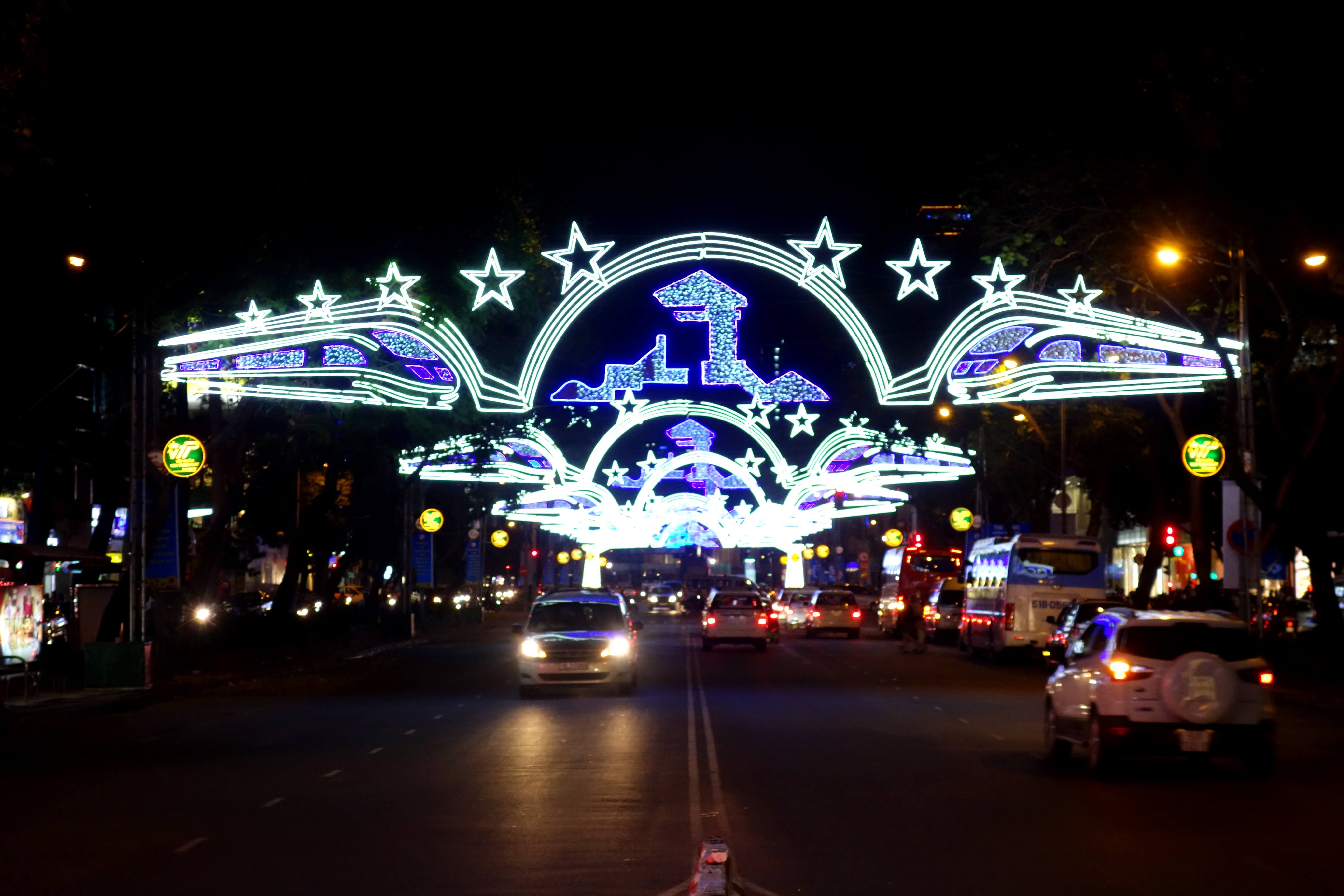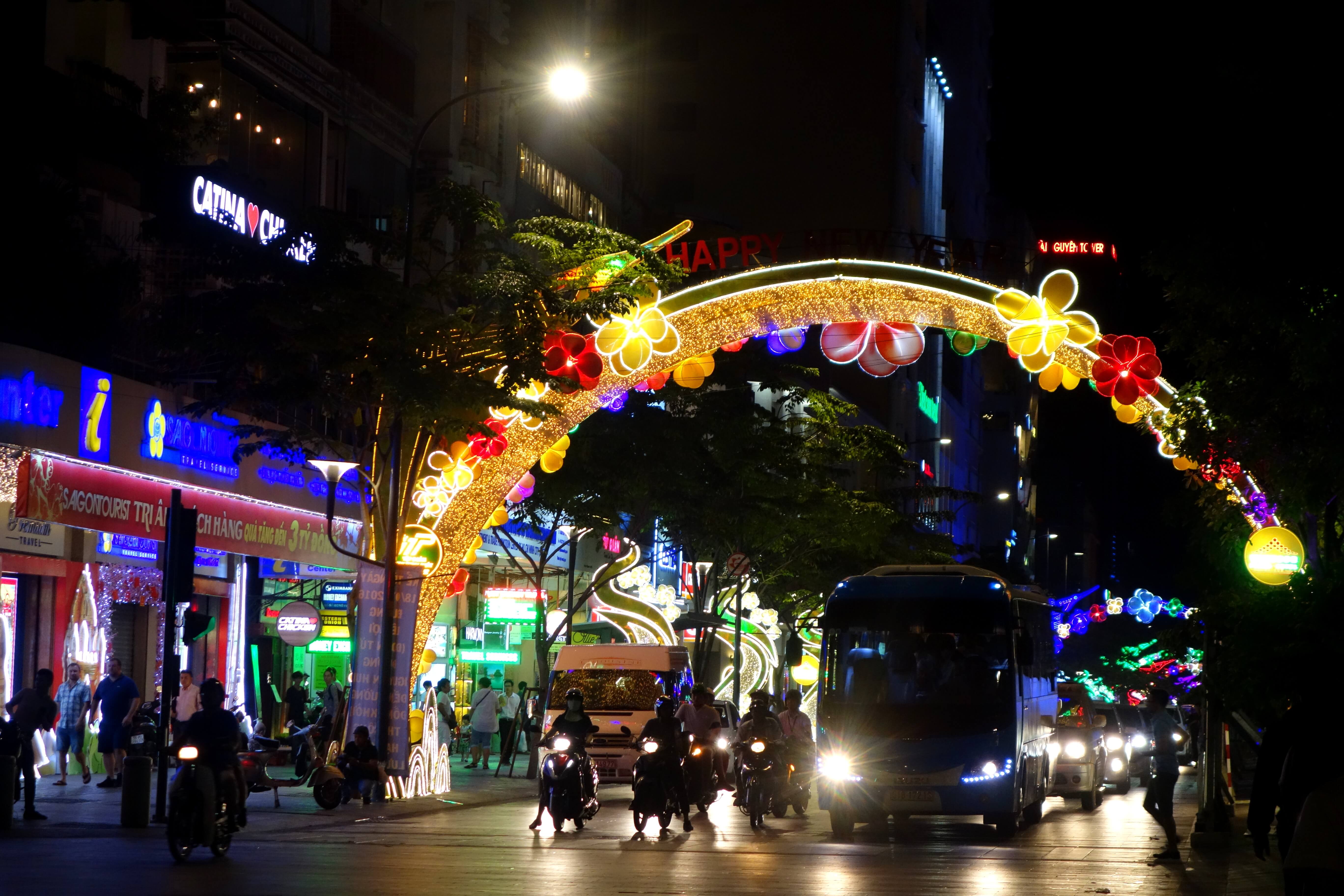 Je pars ensuite me promener, je reconnais certaines rues. Je passe devant la mairie, l’opéra, la cathédrale, la rue principale… J’admire les décorations du Tet, tout est illuminé !