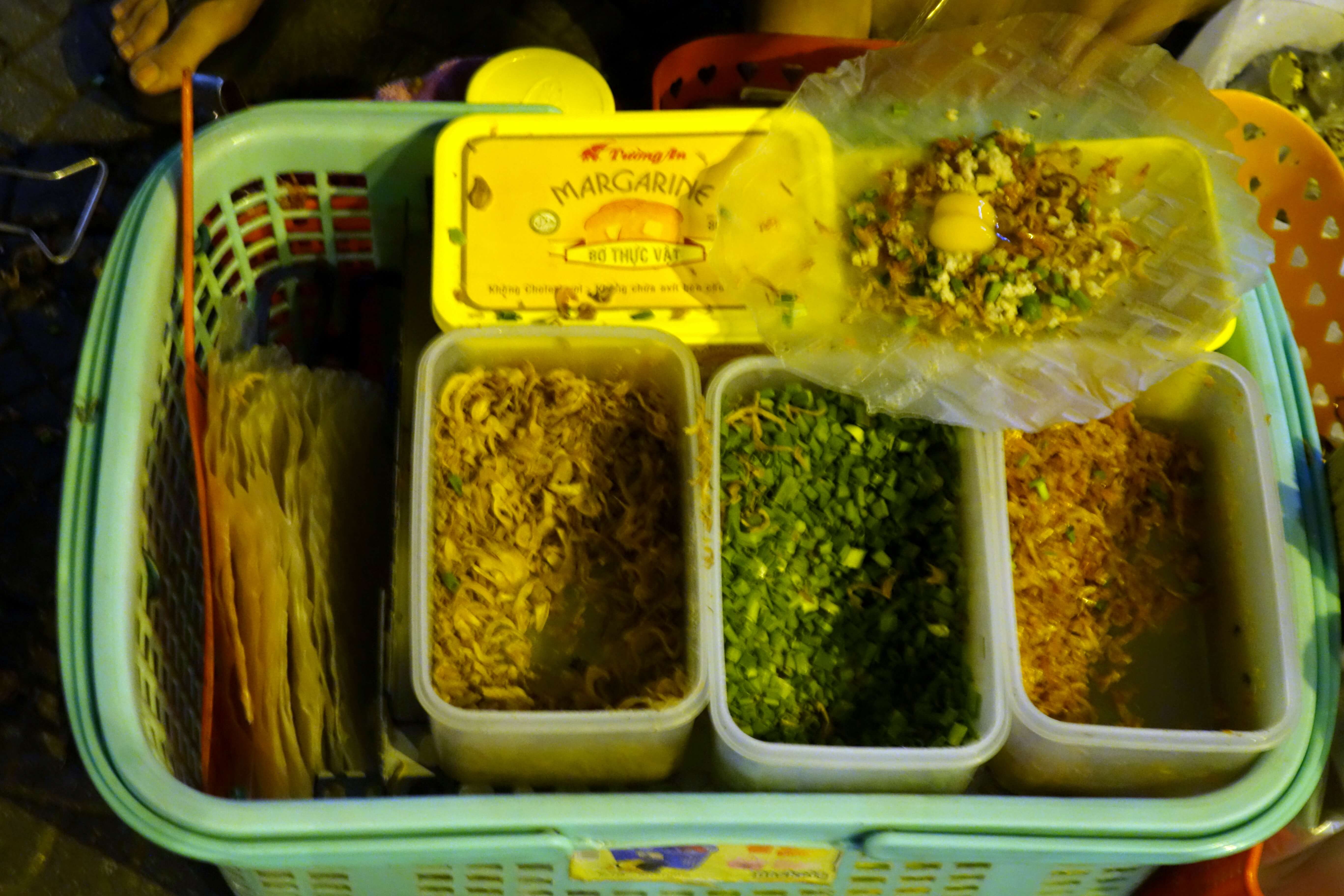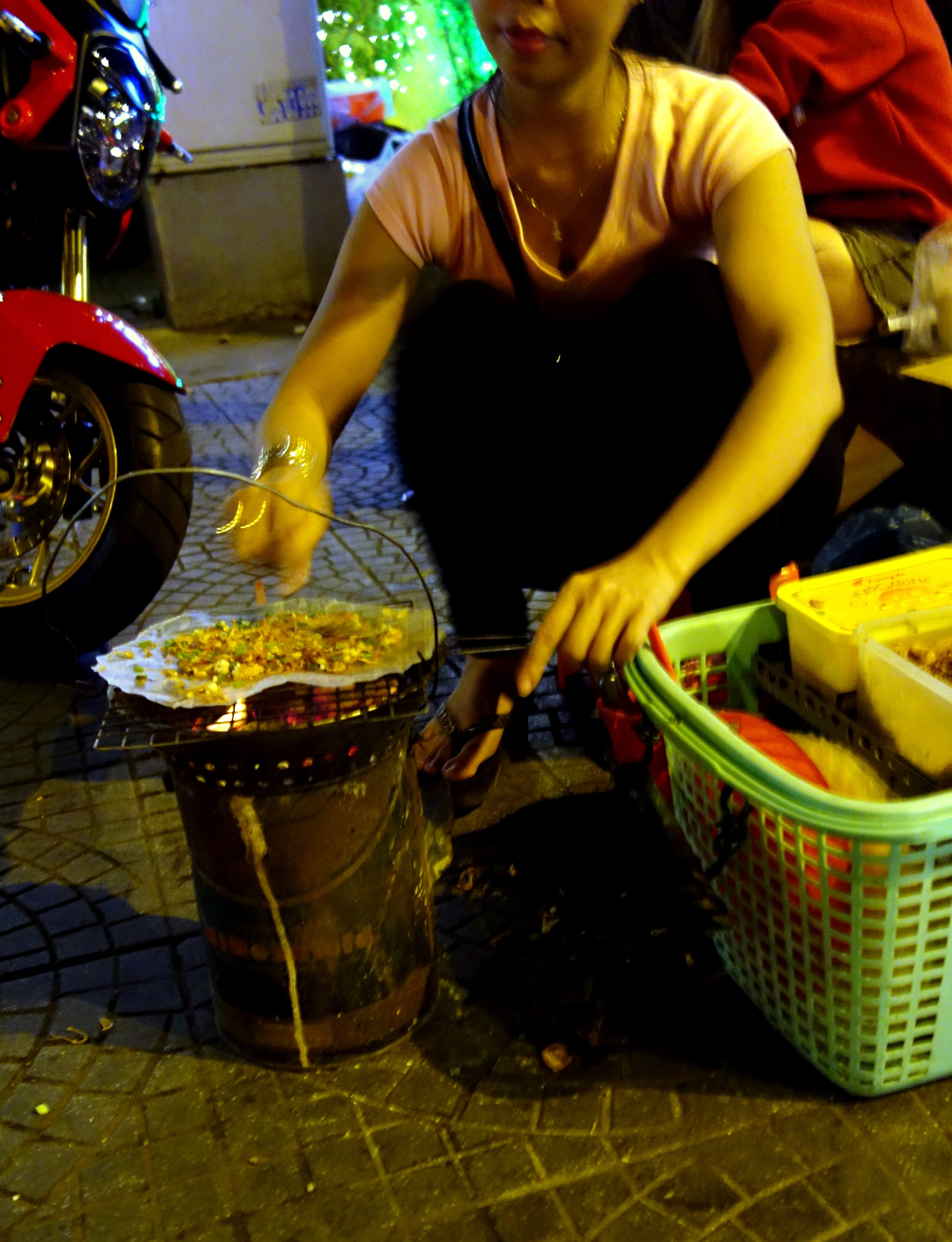 Et derrière la cathédrale se trouve une rue de librairies !!! Partout, des petits stands, shops, des cafés books… bref des livres à perte de vue ! Si vous êtes déjà venus avec moi à la Fnac, à Cultura, espace Leclerc ou tout autre librairie vous savez qu’il ne faut jamais JAMAIS me laisser seule avec des livres ! Je peux rester des heures à feuilleter des bouquins et je ne repars jamais les mains vides. Ça n’a pas manqué ! Et pourtant ce n’étaient que des livres en Vietnamien … je suis restée 2h, ai acheté des cadeaux pour les enfants à Hué, pour Tam, pour Sang … J’ai trouvé des livres de Musso et Lévy traduit en Viet ! Je me suis acheté un livre pour apprendre à parler Vietnamien (mais il n’était pas bien en fait…). Il m’en faut peu pour être heureuse haha. Sur le chemin du retour, je teste la pizza vietnamienne, une feuille de riz garnie de divers ingrédients et cuites sur le trottoir… Pas convaincue, ça sent trop les crevettes pour moi !