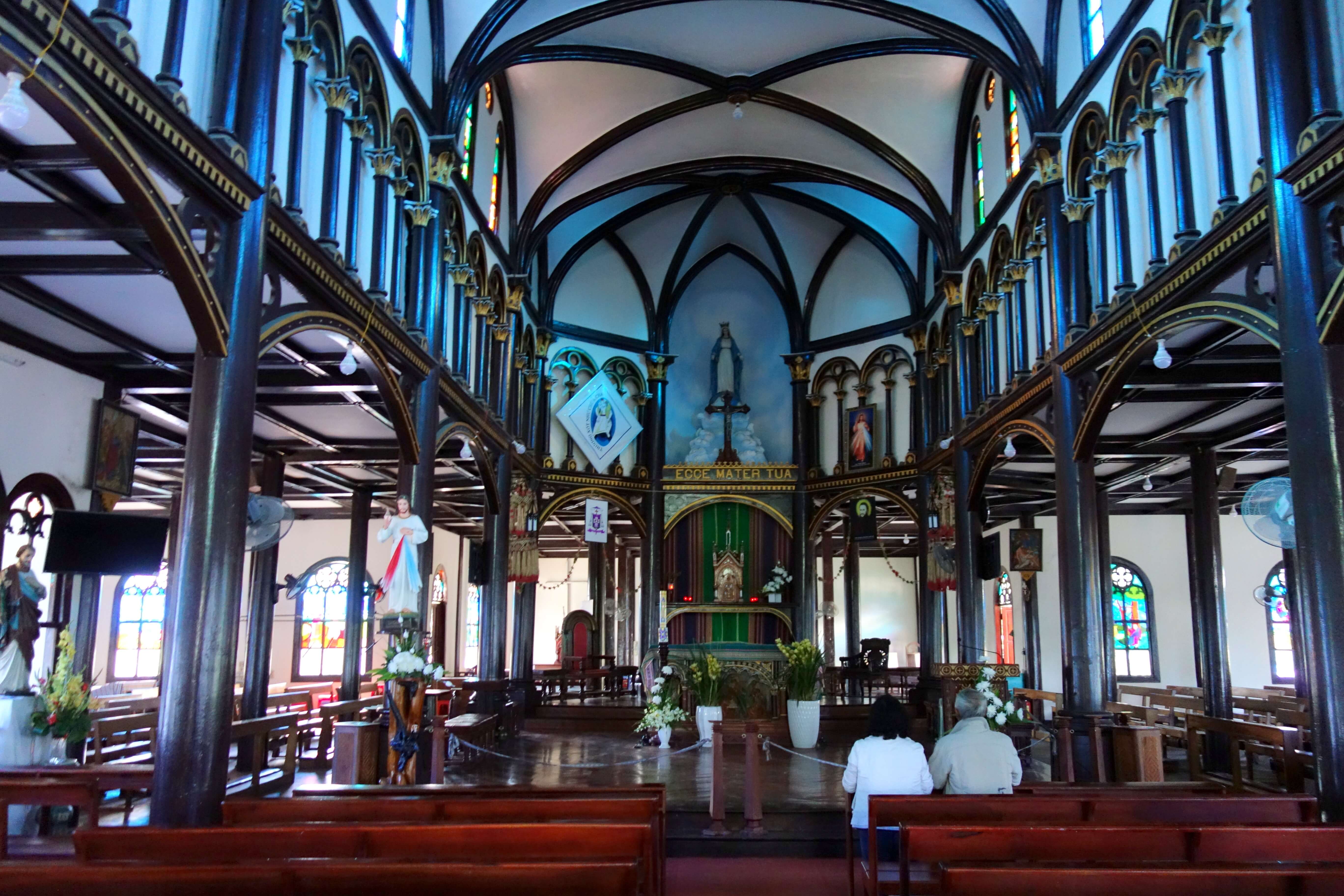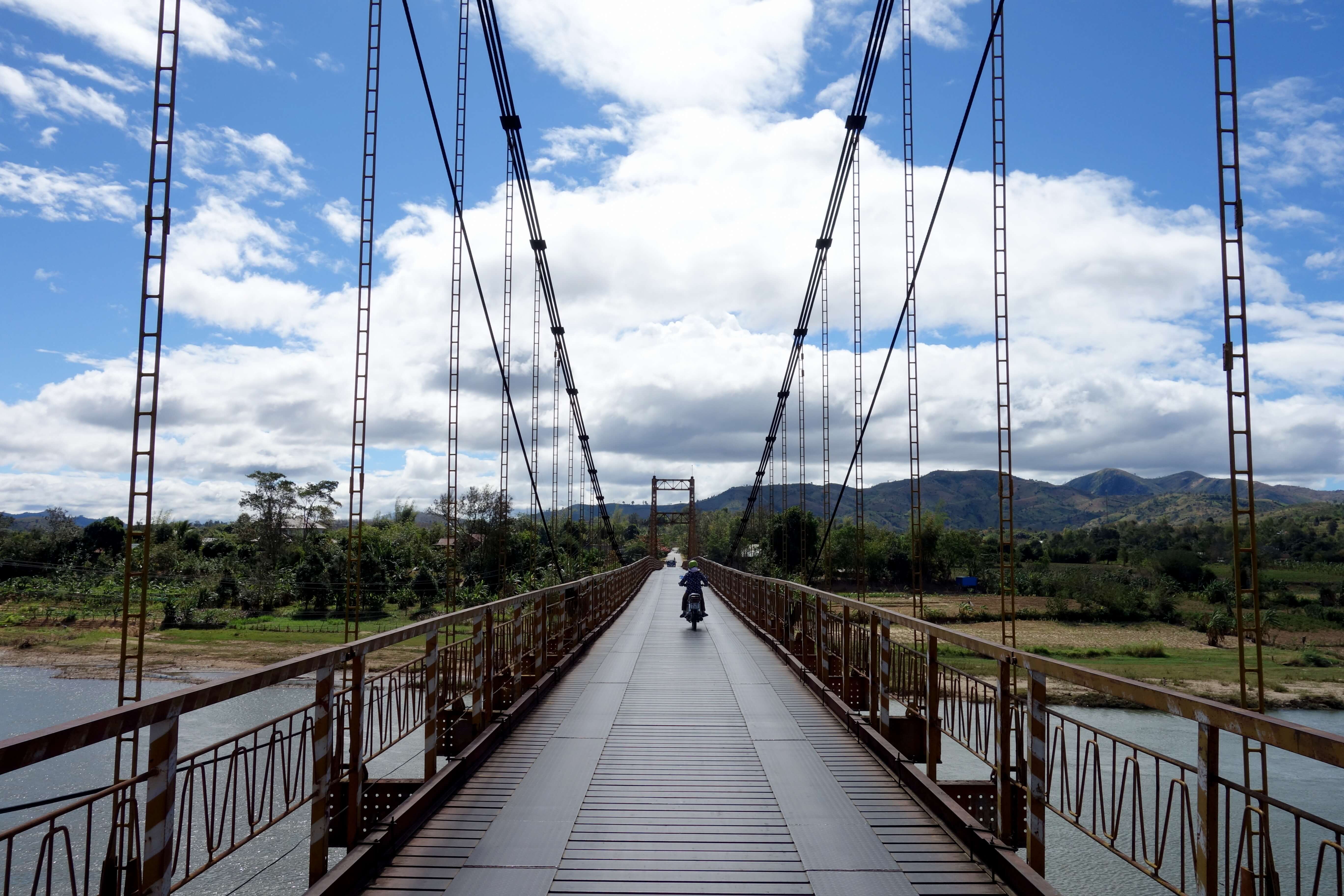 À Kontum, je visite l’église en bois, je passe le pont et traverse un petit village ethnique où je vois les maisons traditionnelles au plafond très très haut. Le pont offre une vue exceptionnelle sur les environs, j’y reste bien 20 minutes, hypnotisée par ce que je vois.