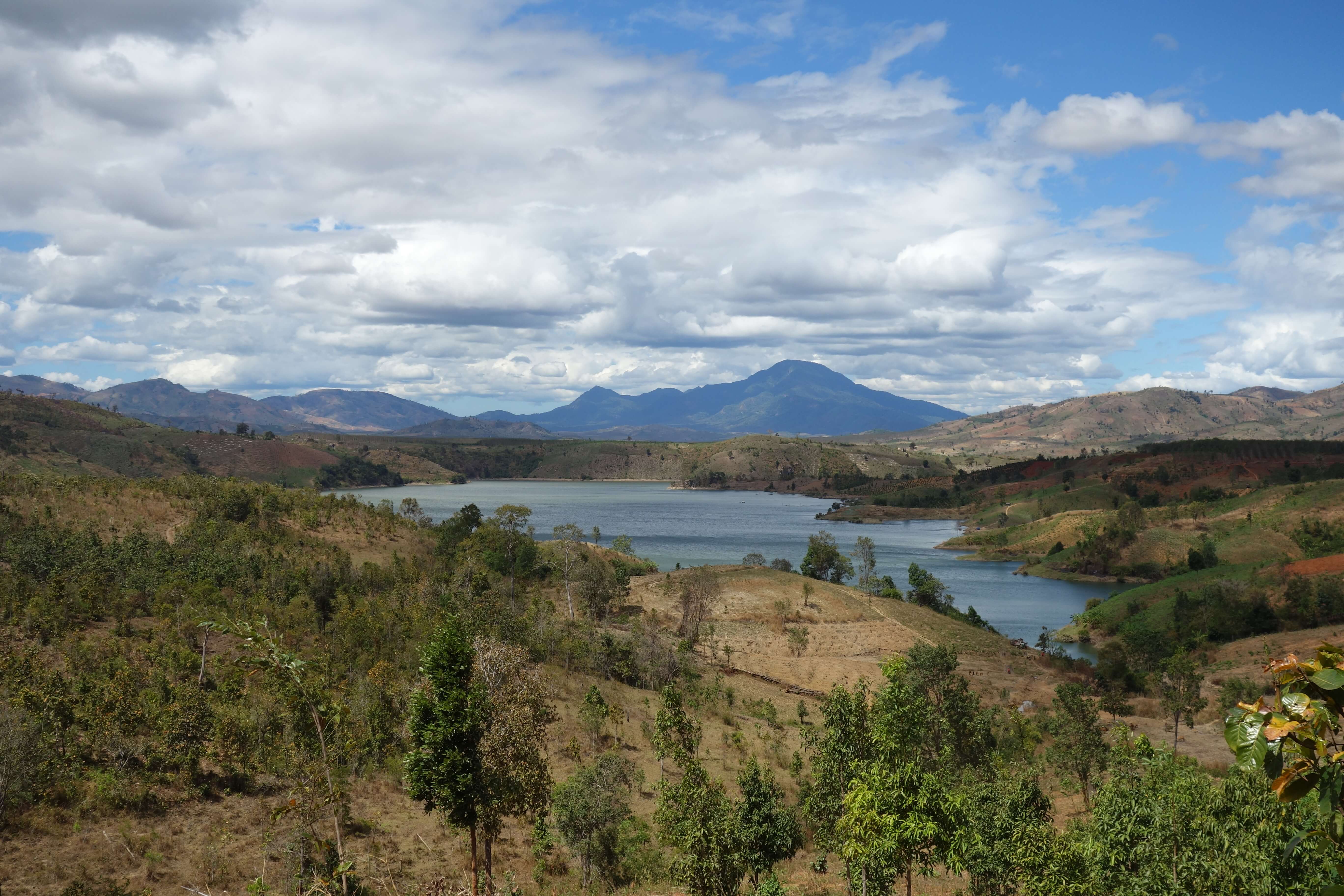 Je pars ensuite direction le lac d’Ialy. Je roule un moment sur des petites routes (20km). Je traverse les villages ethniques et je ressens une émotion bizarre. Je ne me sens pas à ma place, comme si je n’avais pas le droit d’être là… je pense à mon appareil photo, mon ordi dans le sac, j’ai le portable pas loin pour suivre mon itinéraire et je vois ces gens qui marchent pieds nus, habitent dans des maisons en bois sans fenêtre, les enfants jouent dans la poussière, les adultes travaillent. Une vieille femme marcher sous le soleil, sans chaussures avec une charge énorme sur le dos et une canne à la main. Les enfants me font coucou, les adultes des sourires mais je me sens mal à l’aise. Bien sûr, je ne prends pas de photos même si j’en meurs d’envie tellement c’est à l’opposé de tout ce que l’on connaît. J’aperçois enfin le lac et la vue est sublime ! Je pose ma moto et marche dans les plantations de café. Je vois tous les agriculteurs qui me regardent bizarrement mais pas méchamment.