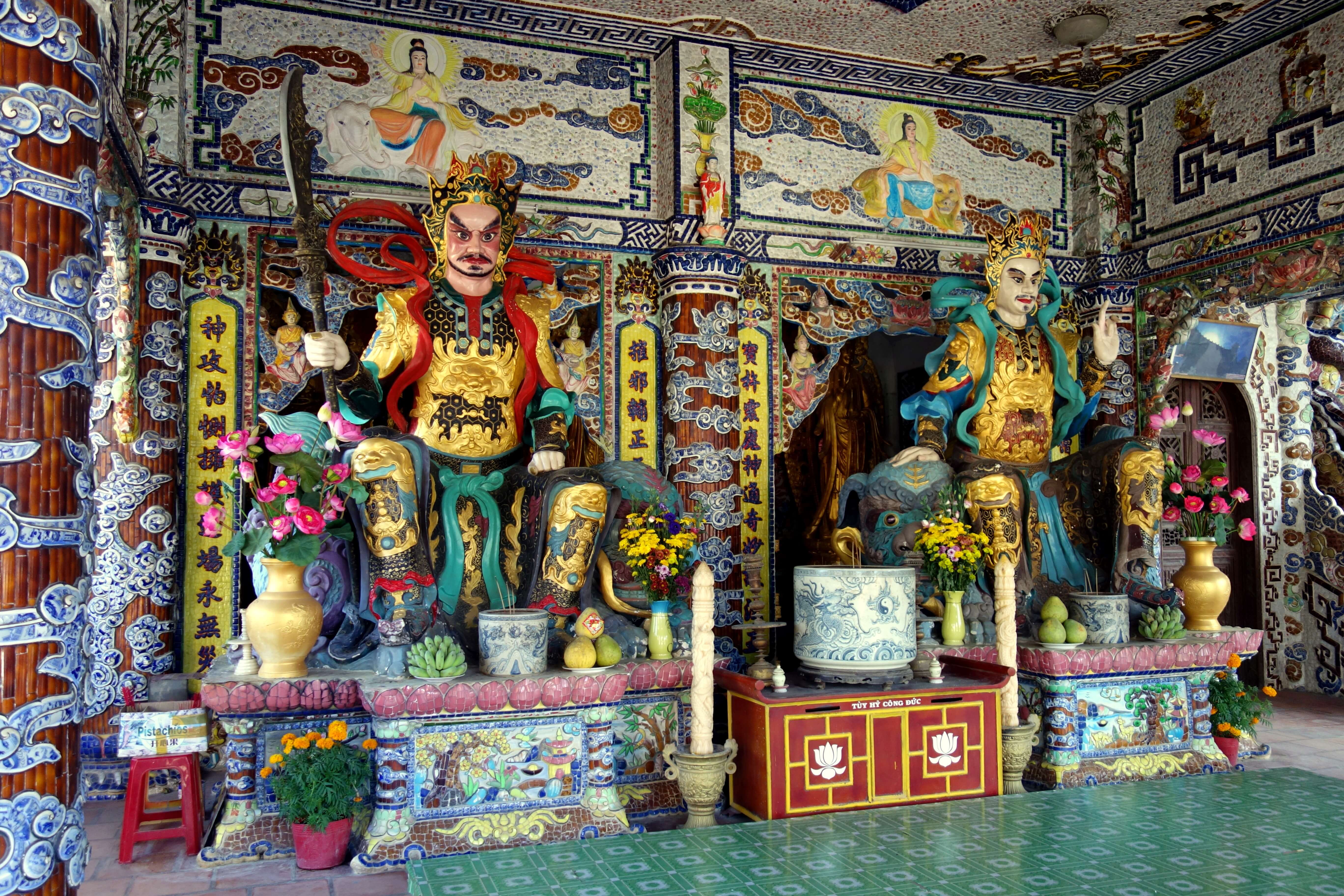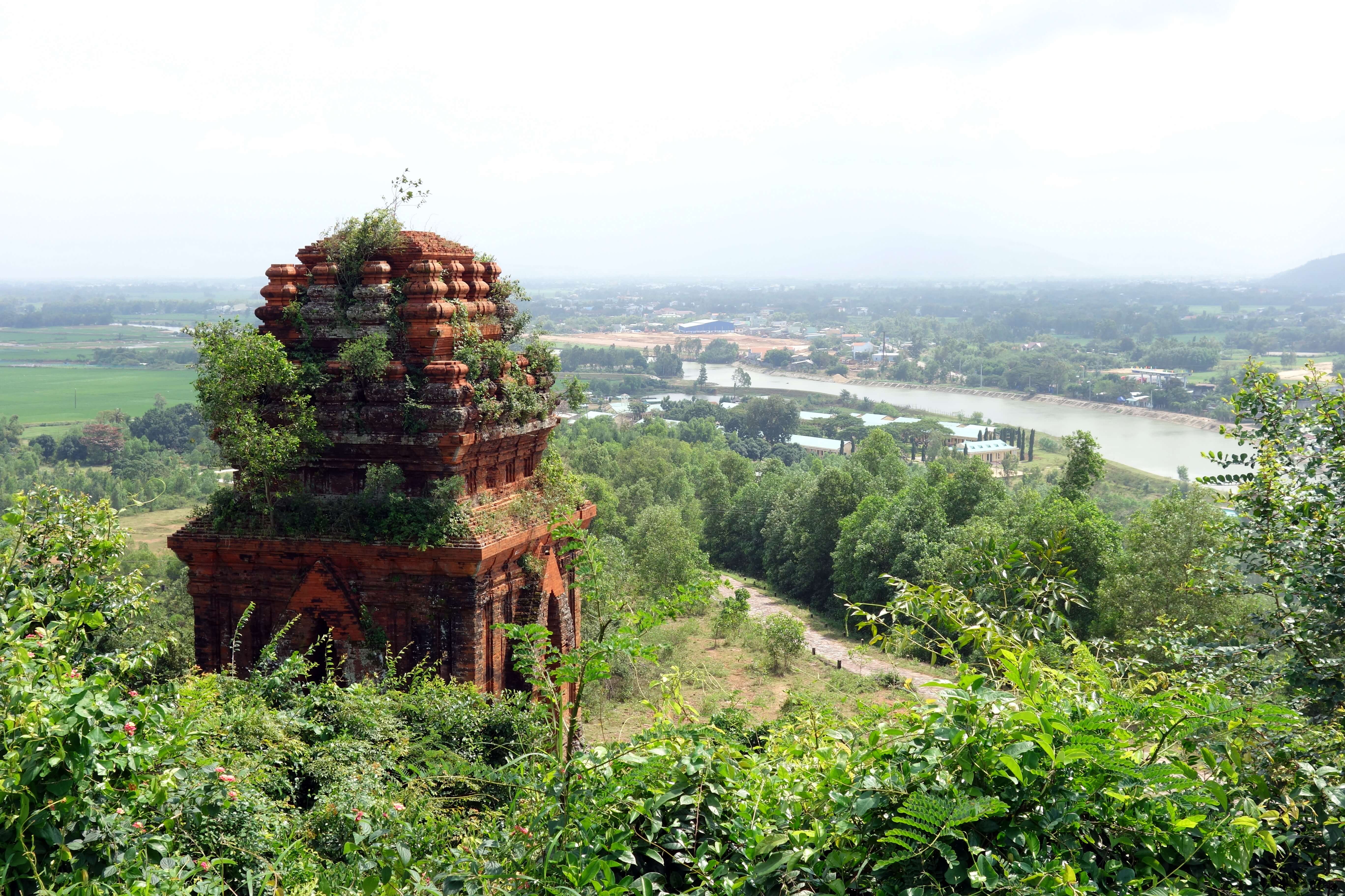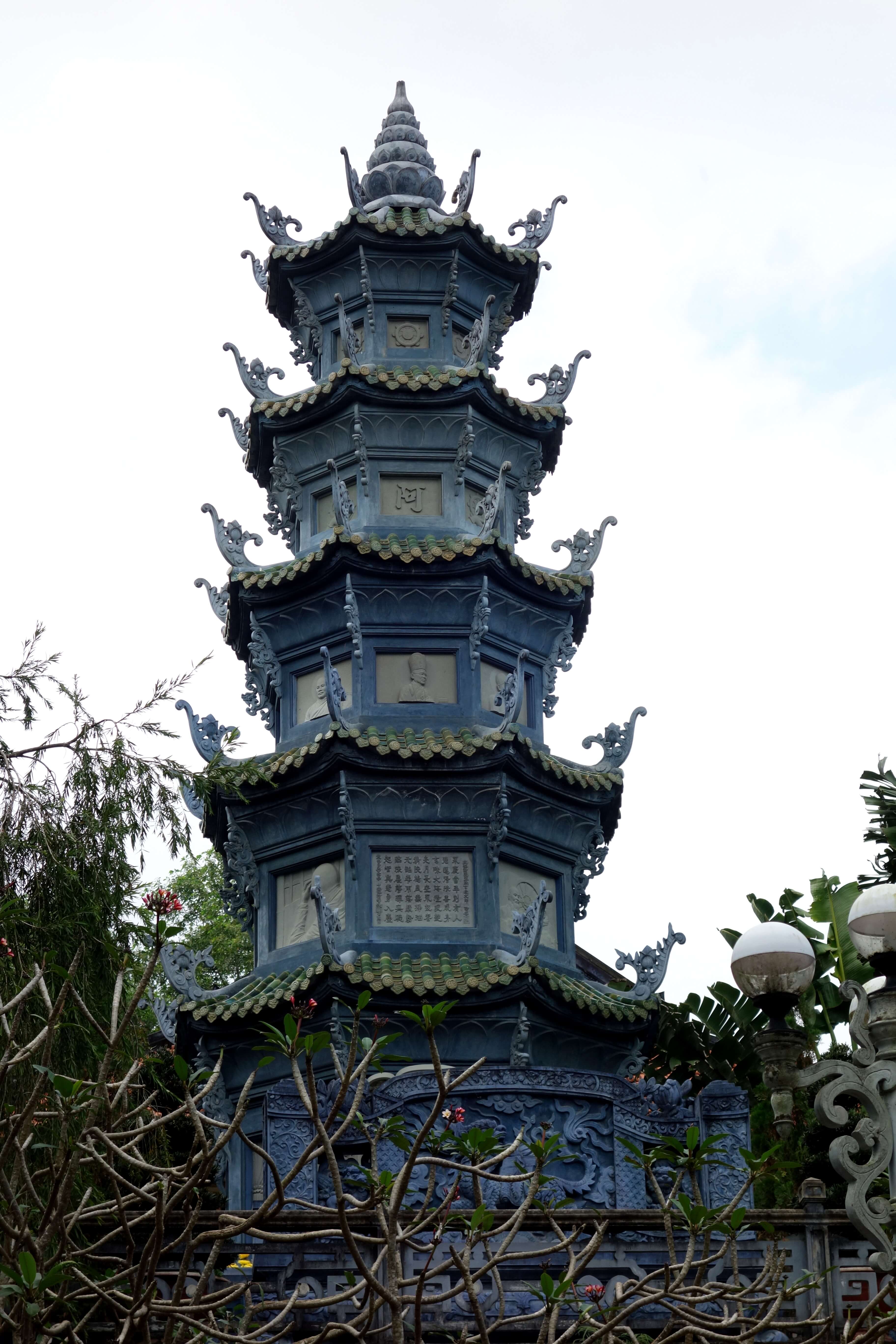 Je roule jusqu’à Quy Nhon, sur la route, j’aperçois depuis la route une tour Cham en haut de la colline, allez hop, on y va ! Il s’agit de la tour Banh It. Le panorama est sympa et la tour bien entretenue, c’est top! Contente d’avoir fait un petit détour. Dans les escaliers, j’aperçois un temple bleu, assez surprise car ce n’est pas une couleur que je vois souvent, je m’y rends avant de partir.