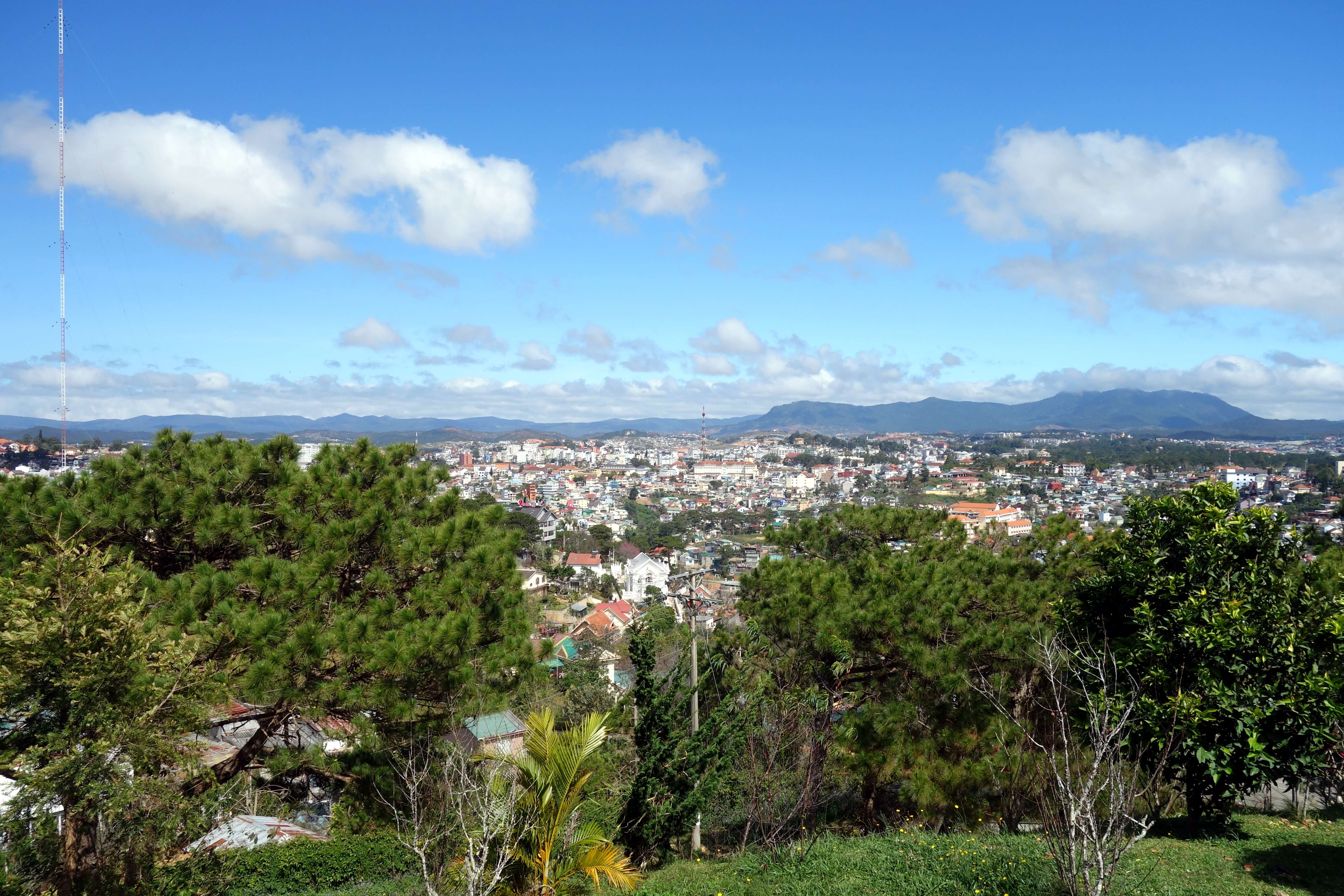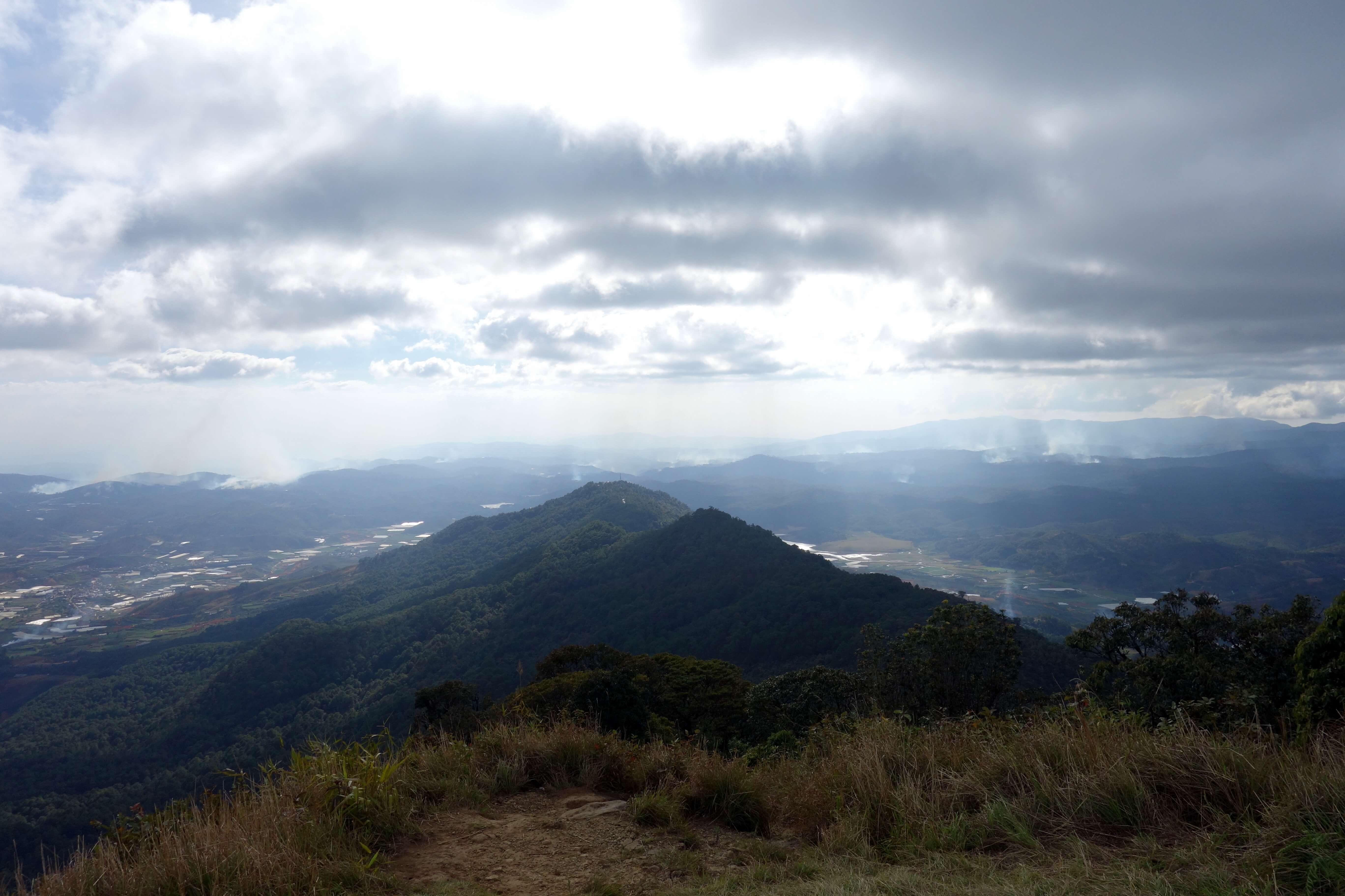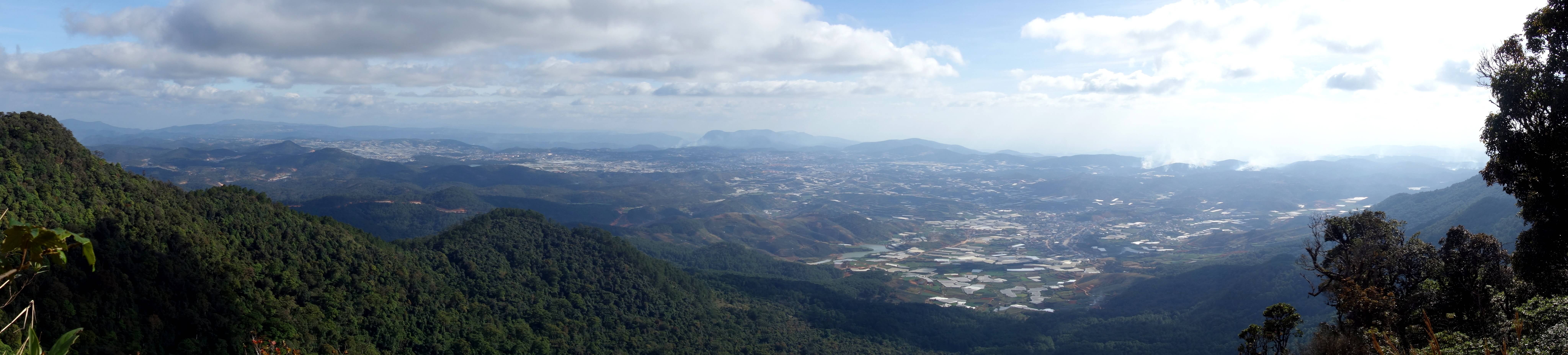Je vois l’heure tourner, plus d’1h30 que je suis partie, oulalala il va falloir accélérer ! Je croise quelques touristes qui redescendent, et deux d’entre eux me disent « good luck » moi, je me croyais presque arrivée, donc j’avais envie de leur dire « oh ça va le plus dur est fait ! » mais c’était sans compter sur ce qui m’attendait !!!!!!! Les 500 derniers mètres ont 200 mètres de dénivelés, en escalier ! Les marches sont très très hautes, parfois elles m’arrivent quasiment à la taille… Je m’accroche, je sais que j’y suis presque mais je m’arrête toutes les 25 marches pour reprendre mon souffle et mes esprits, c’est intense ! Mais quand j’arrive en haut (enfin !!) la vue est à couper le souffle. A 360 degrés, je contemple la campagne environnante. Les nombreuses serres de Da Lat, les forêts et je surplombe la chaîne de montagne environnante. Le temps de manger mes gâteaux, 10 petites minutes et il faut que je redescende pour récupérer ma moto !