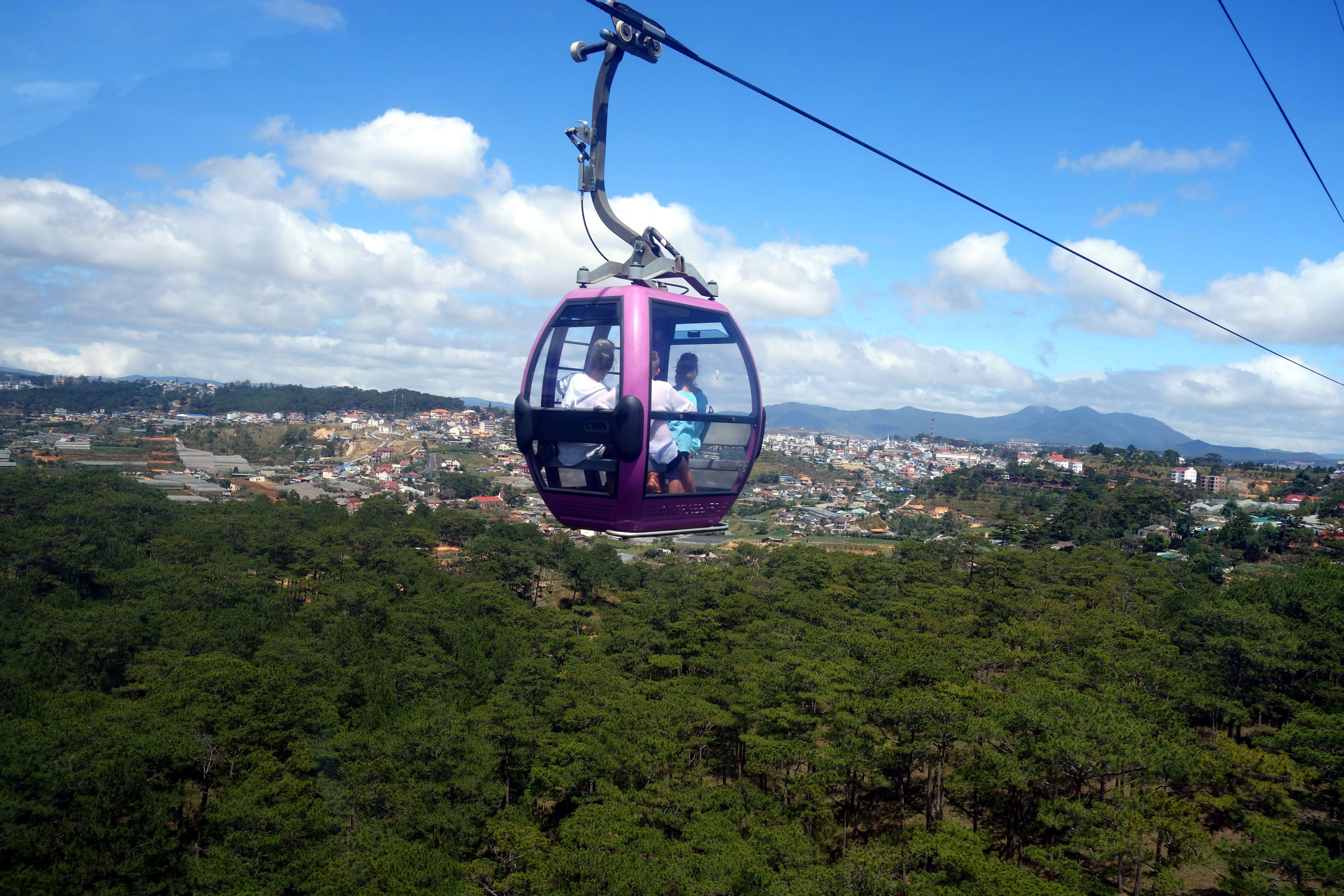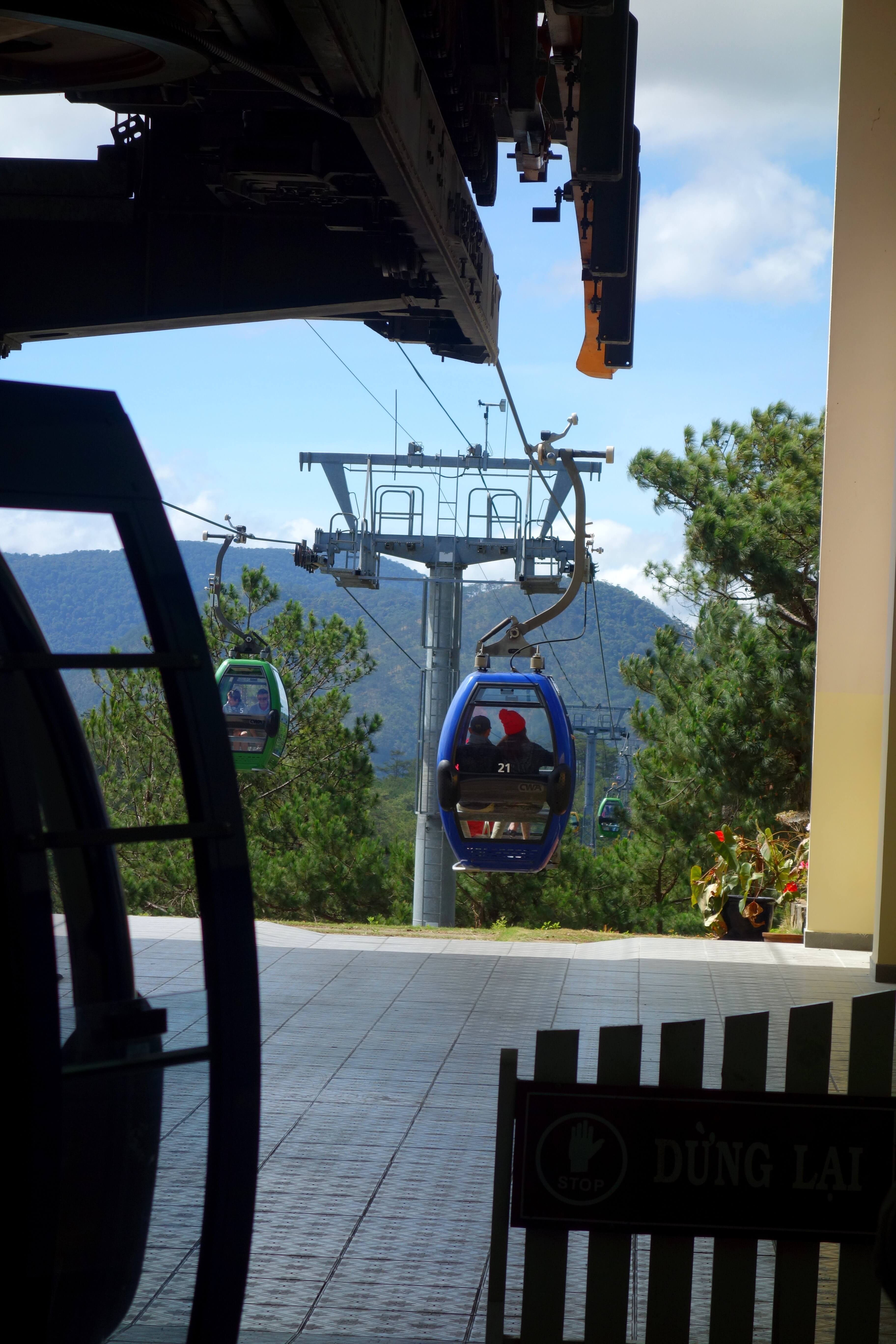 Le lendemain, dernier jour à Da Lat. Je voulais absolument tester le voyage en télécabine pour aller voir la pagode Truc Lam Zen sur un lac. C’est blindé de russes et ils sont franchement pas très sympas.. Pas le genre de touristes que je préfère ! Ils parlent fort, t’ignorent (ils ne parlent pas anglais), te poussent ou se mettent au milieu des photos sans gêne… Bon, ça me gâche un peu le trajet ! La pagode à l’arrivée n’a rien de spécial et la végétation est tellement dense qu’on aperçoit à peine le lac. Bof bof cette excursion. Le retour dans la télécabine est un peu plus agréable, j’apprécie plus la vue car je me sens moins « écrasée » par la présence des 3 autres personnes avec moi.