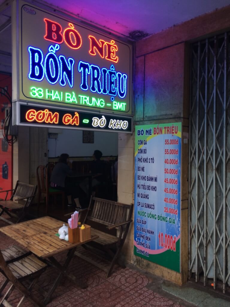 Après une nuit dans le bus de Da Nang à Buon Ma Thuot, j’arrive à 5h du matin et commence ma journée avec un café. Je suis à 4,5 km du centre ville et je décide de les faire à pied pour me réveiller et faire un peu d’exercice car dans les prochains jours je vais passer beaucoup de temps assise sur ma moto ! Je vois le lever du soleil, les vietnamiens qui font du sport dans les parcs, tout le monde est déjà bien réveillé ! En arrivant proche de la ville, je me rappelle d’un restaurant où j’avais mangé il y a presque 3 ans avec le groupe de l’Estacaide. Je me lance le défi de le retrouver. Il me semble reconnaitre une rue et c’est, en effet, pas très loin ! J’avais le souvenir d’une plaque chauffante avec œufs, viande, sauce, légumes et c’est encore mieux que dans mes souvenirs. Ça s’appelle Bo Ne et c’est servi avec un gros morceau de pain qui a vraiment un goût de pain !!!