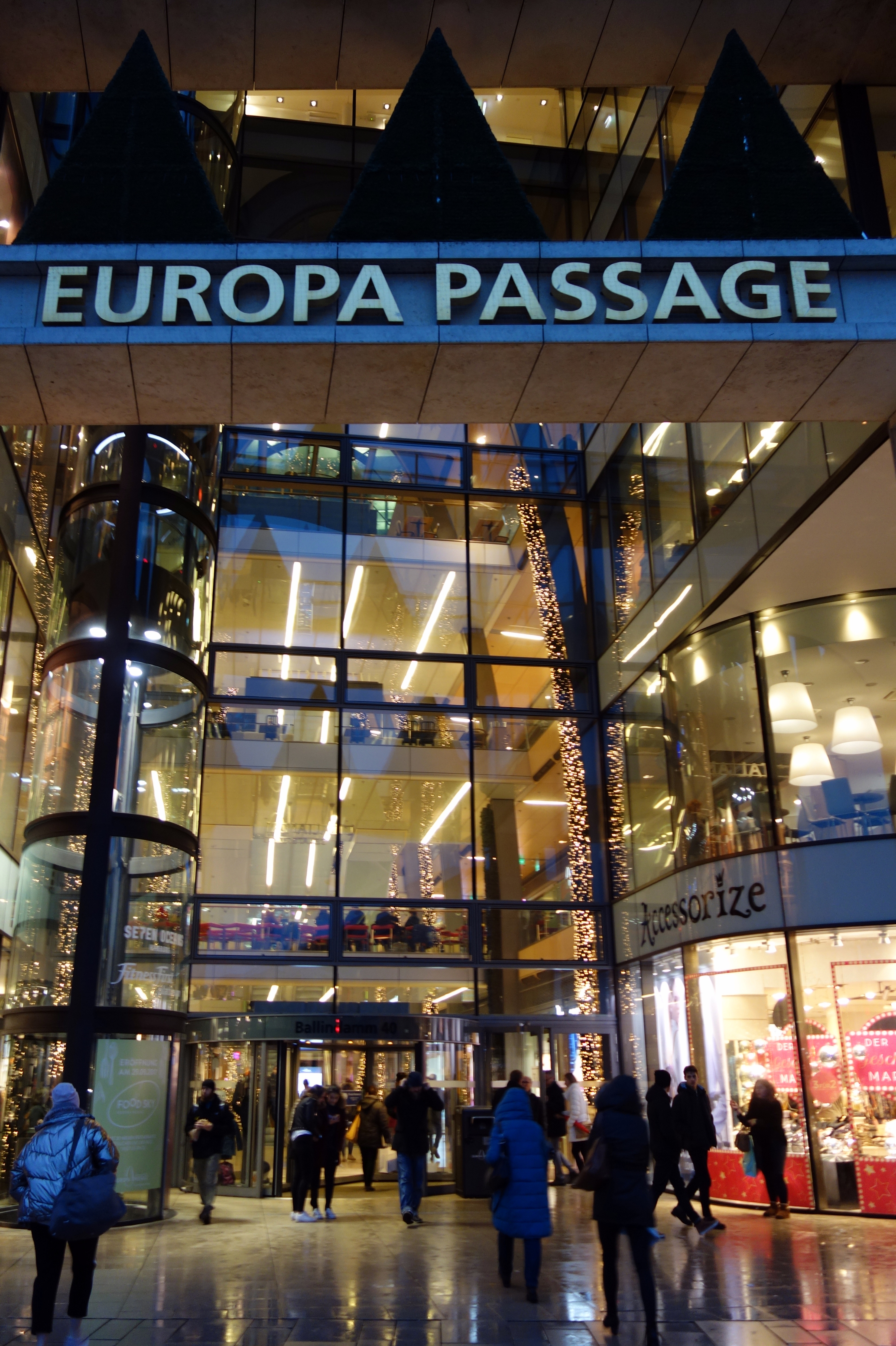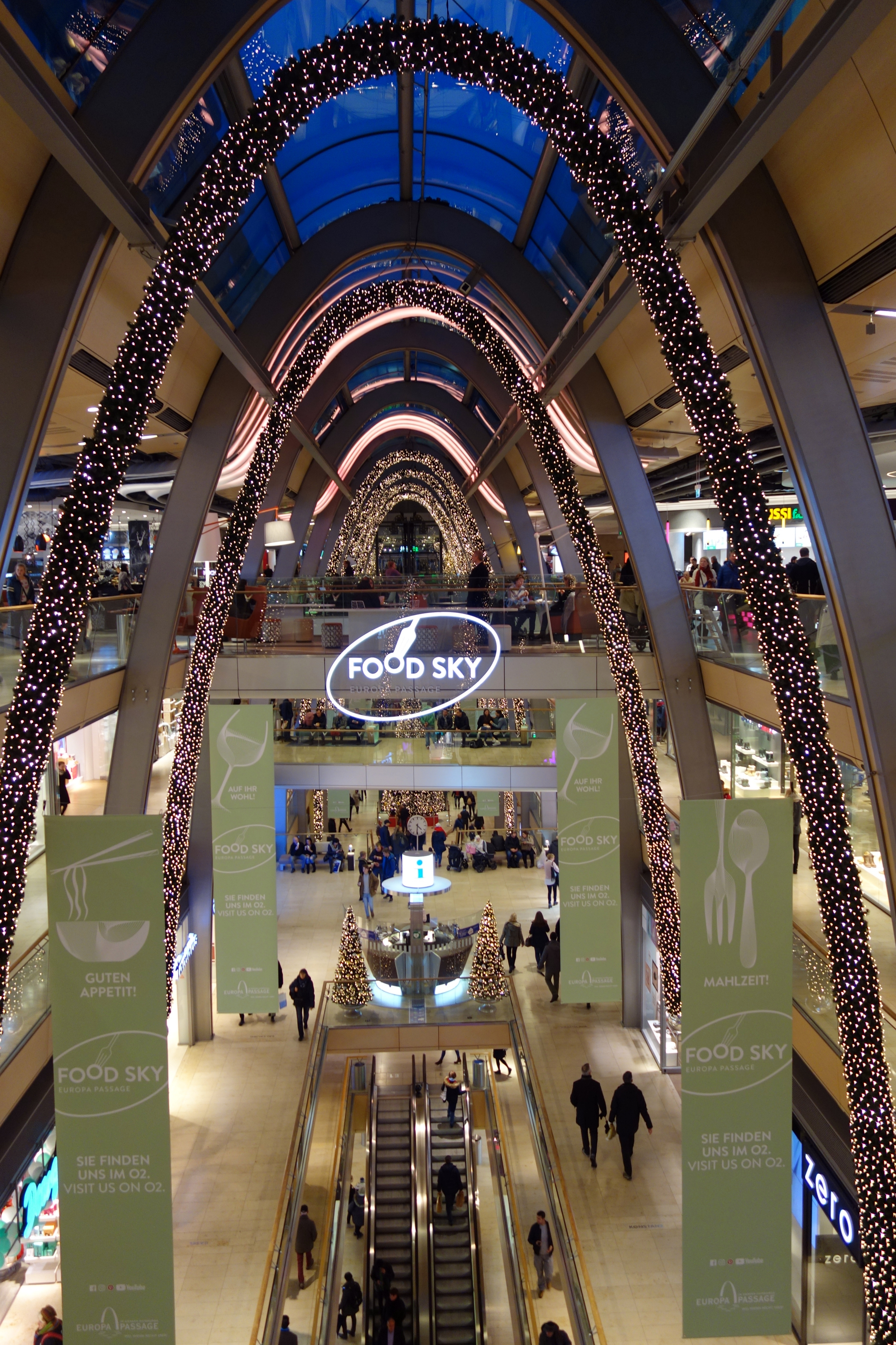 Après quoi, je bouge enfin pour aller dans le centre commercial Europa, il est grandiose avec ces décorations de noël ! Il y a un étage entier de nourriture, mon paradis ! Mais j’ai déjà fait escale pour un traditionnel curry wurst, de la saucisse avec une sauce curry et des frites, très bon, très gras, pas cher ! Alors je me contente de trouver une table et de continuer à publier mes articles depuis le dernier étage du centre commercial.