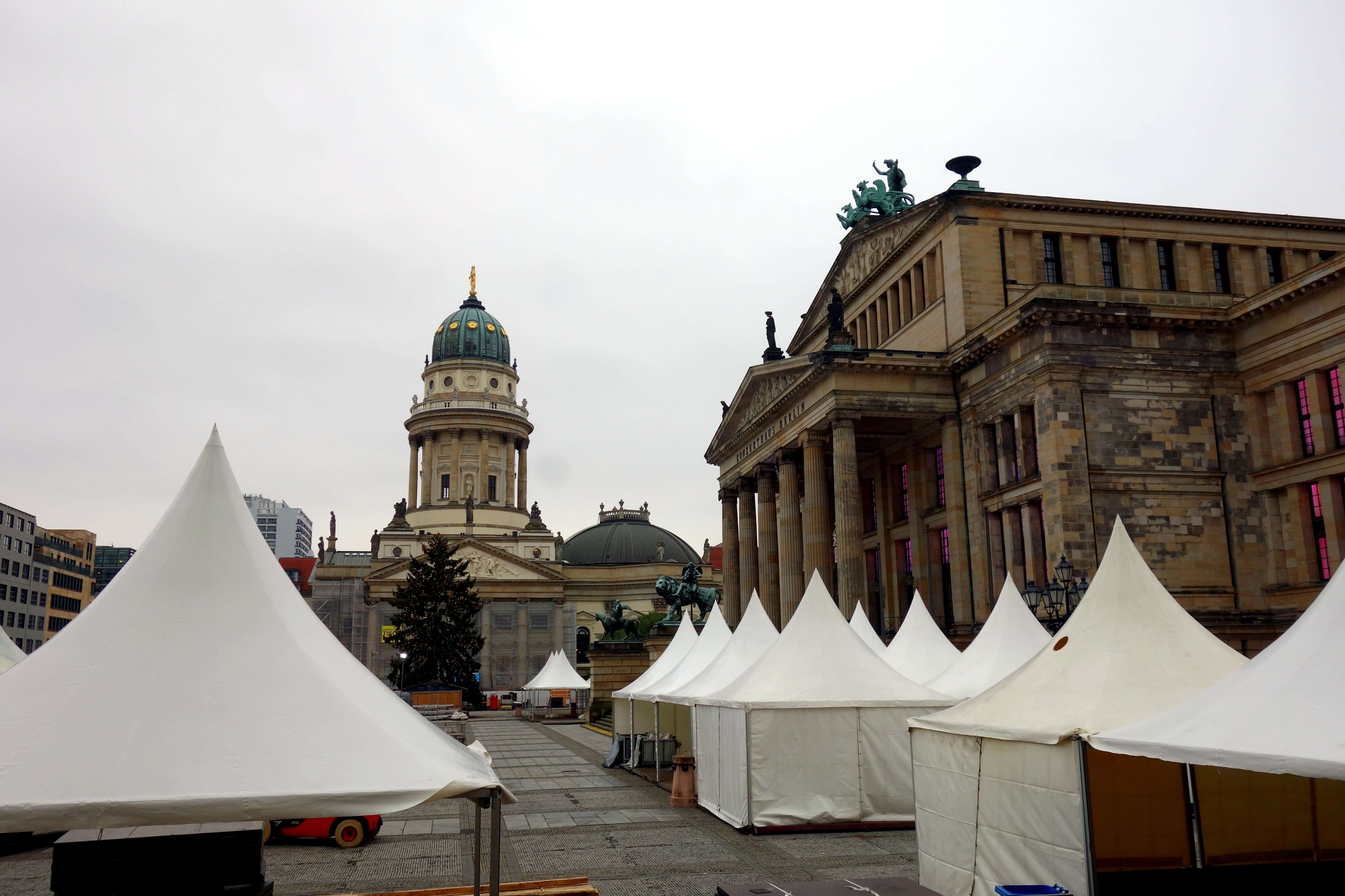 Nous arrivons ensuite sur la grande place Gendarmenmark qui va servir de marché de Noël, comme en Autriche, j’ai l’impression d’être là au mauvais moment … En pleine installation ! La place est particulière, deux immenses églises identiques se font face. L’une construite par les français, l’autre par des allemands…