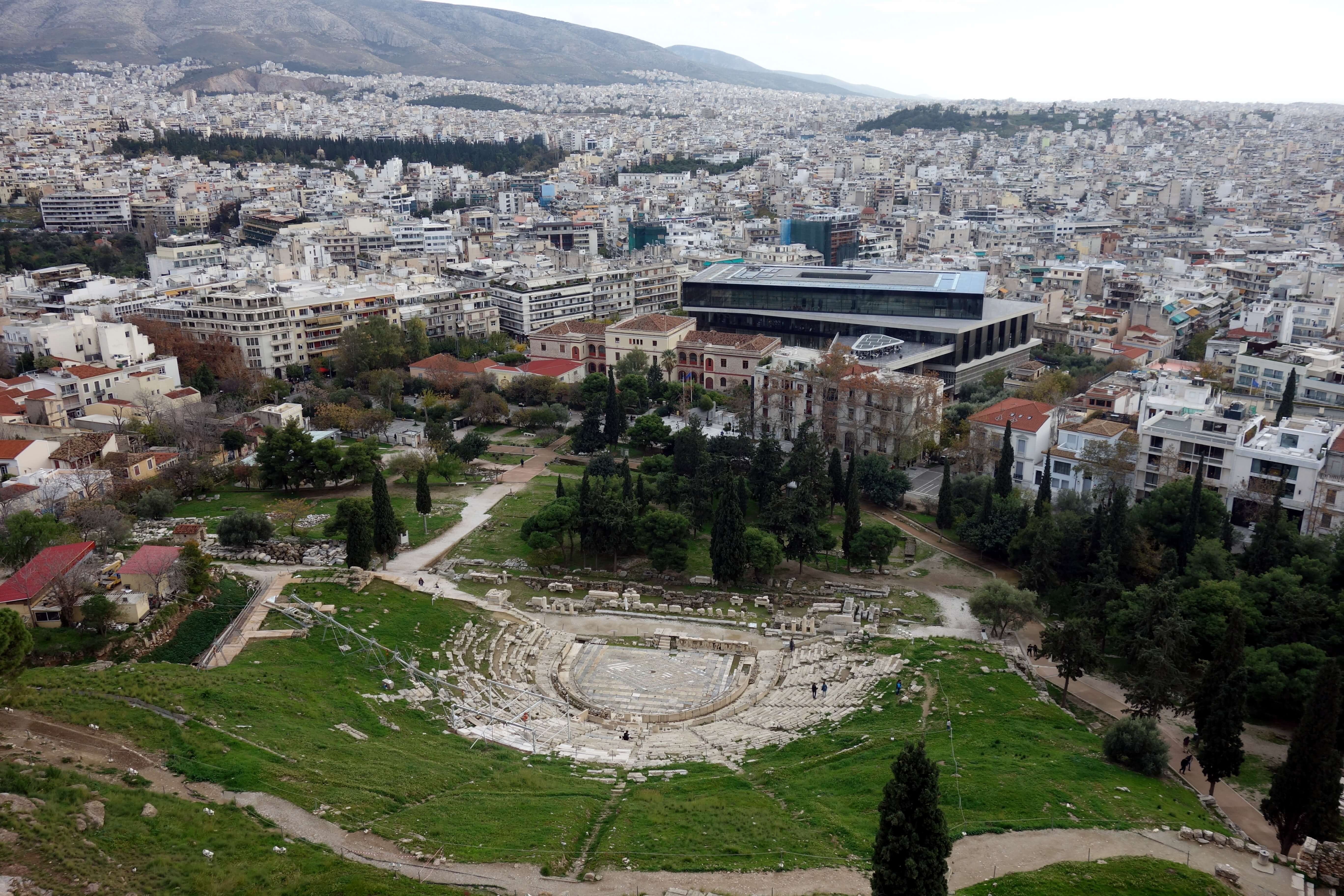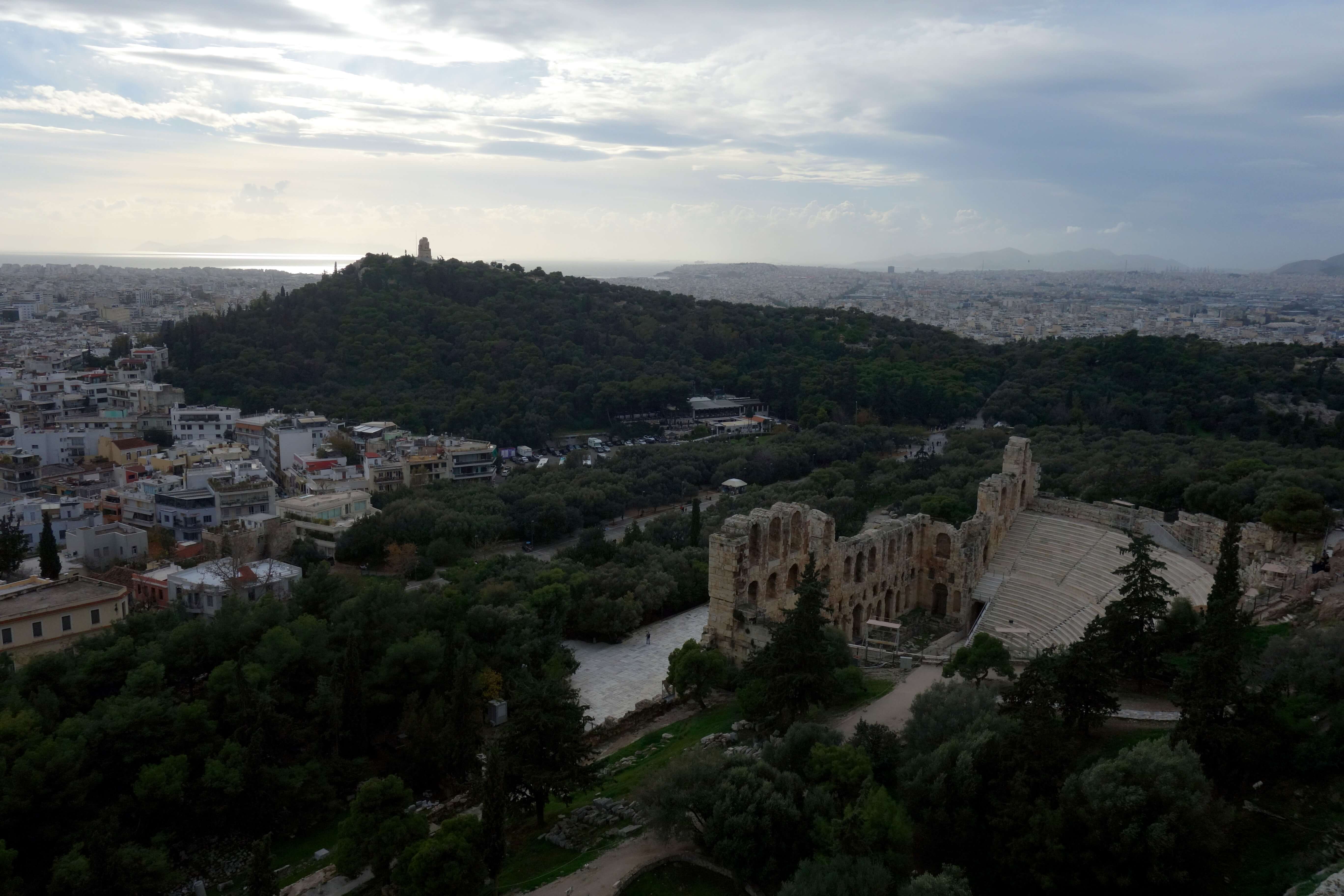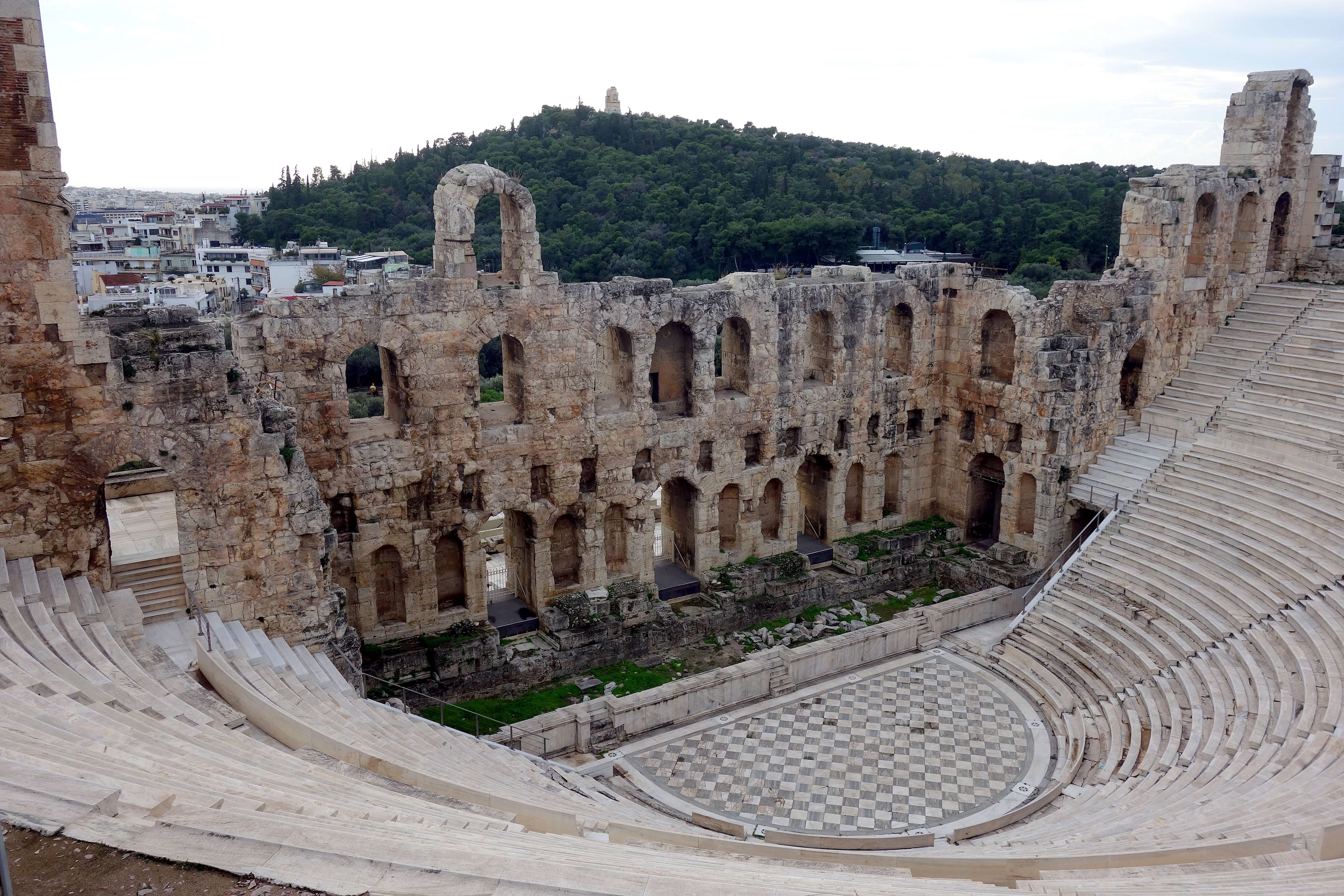 Je me promène dans le parc autour de l’Acropole, je découvre les ruines du plus grand théâtre grec en l’honneur de Dionysos, pouvant accueillir 17 000 personnes (hommes seulement, les femmes n’étaient pas autorisées à assister au spectacle). Je contourne ensuite plusieurs temples et continue de grimper. Je vois le second théâtre, celui d’Hérode, qui est parfaitement restauré, la vue est incroyable.