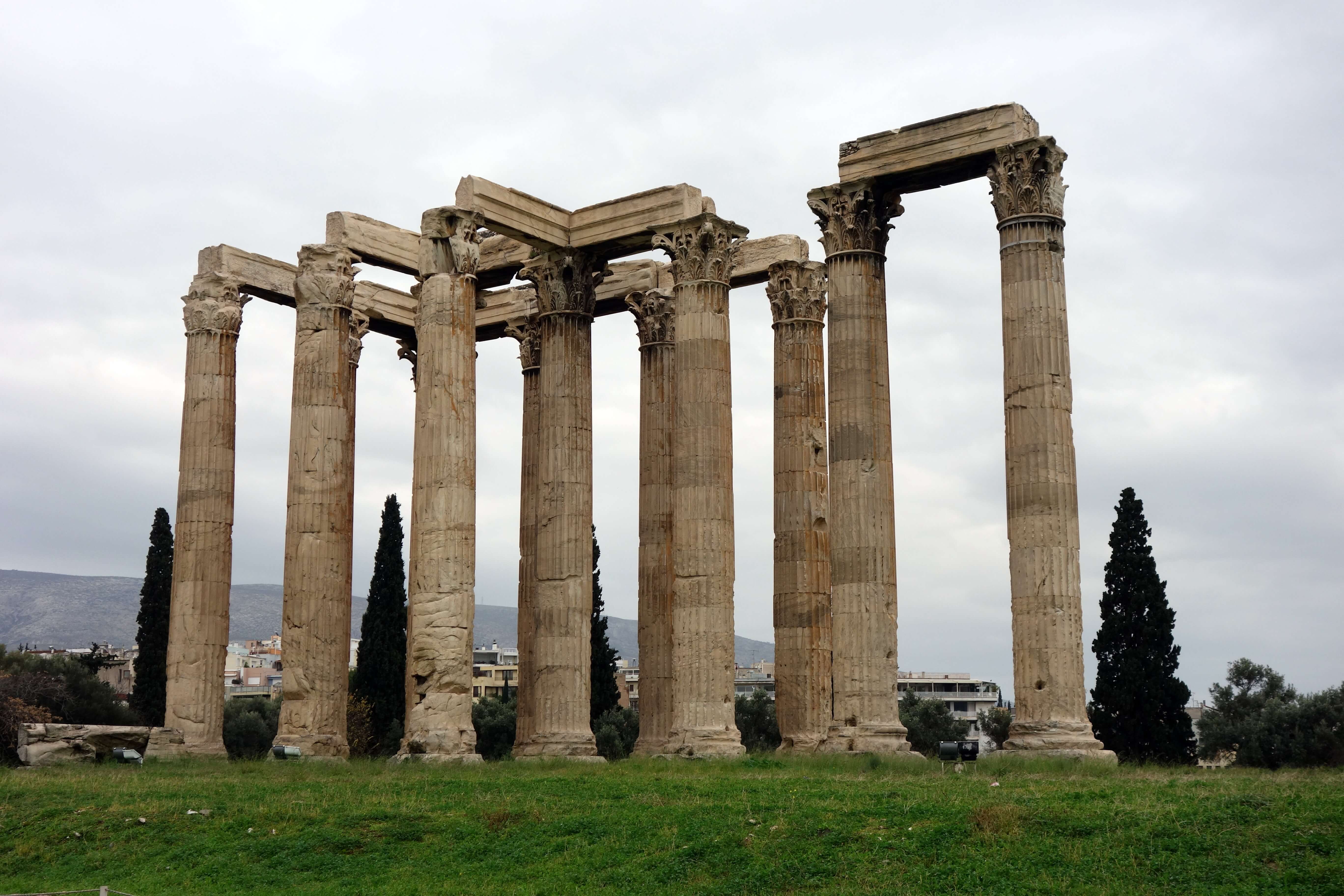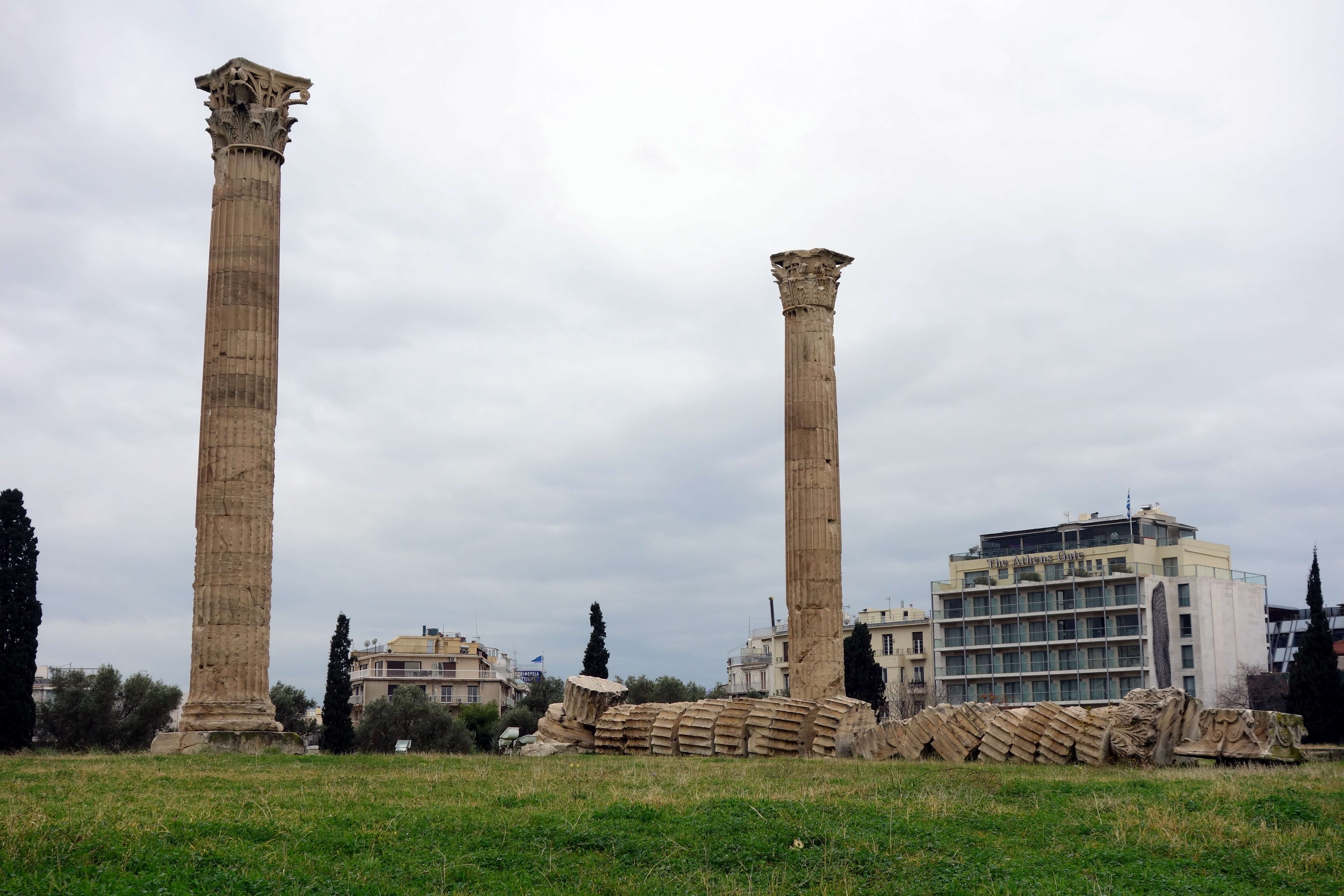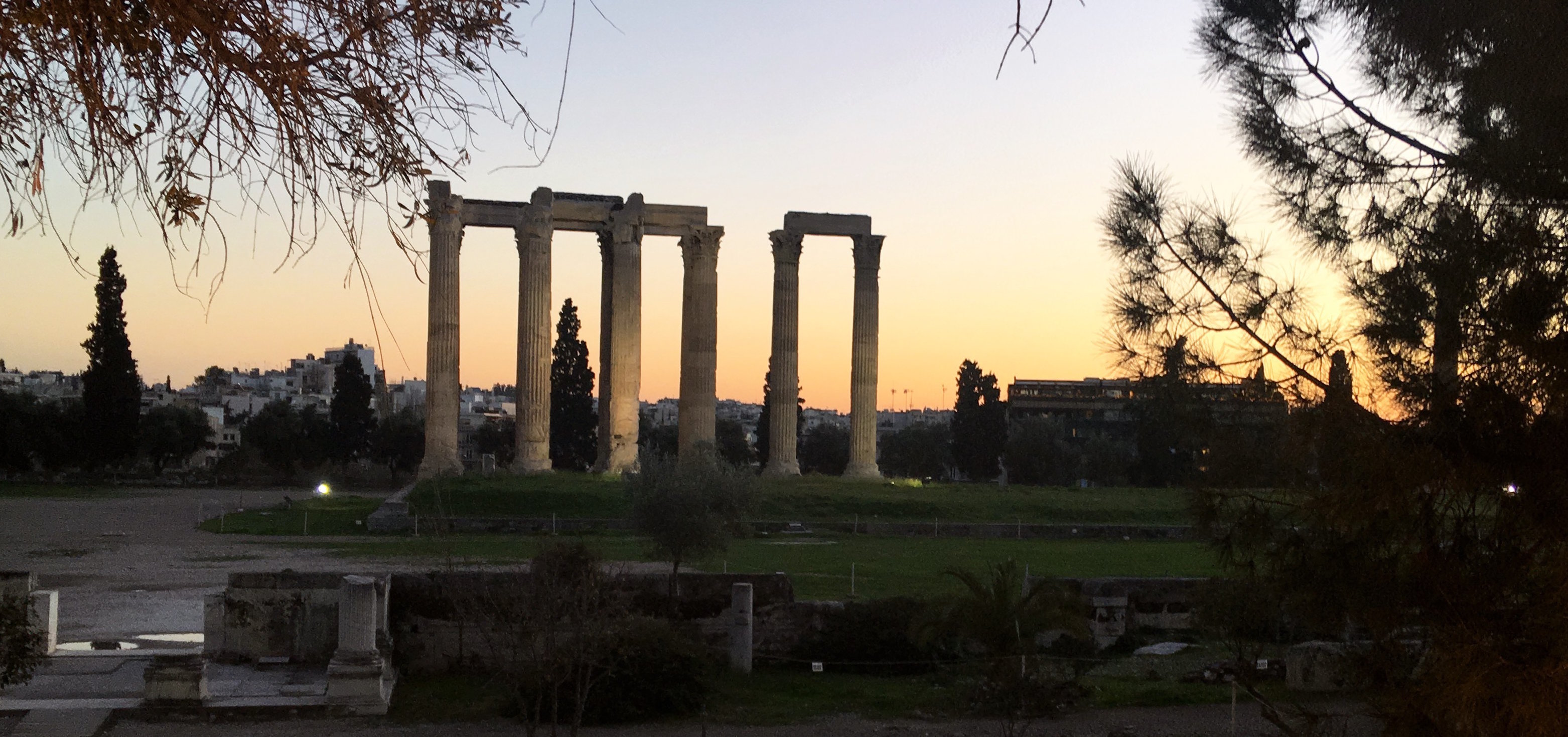 Je veux ensuite me rendre aux Jardins Nationaux mais contrairement à ce qui était indiqué sur internet, ils sont déjà fermés. Je me rends donc au temple de Zeus et à la porte d’Hadrian, fermés également mais j’aperçois le coucher de soleil derrière les colonnes et c’est plutôt sympa !
