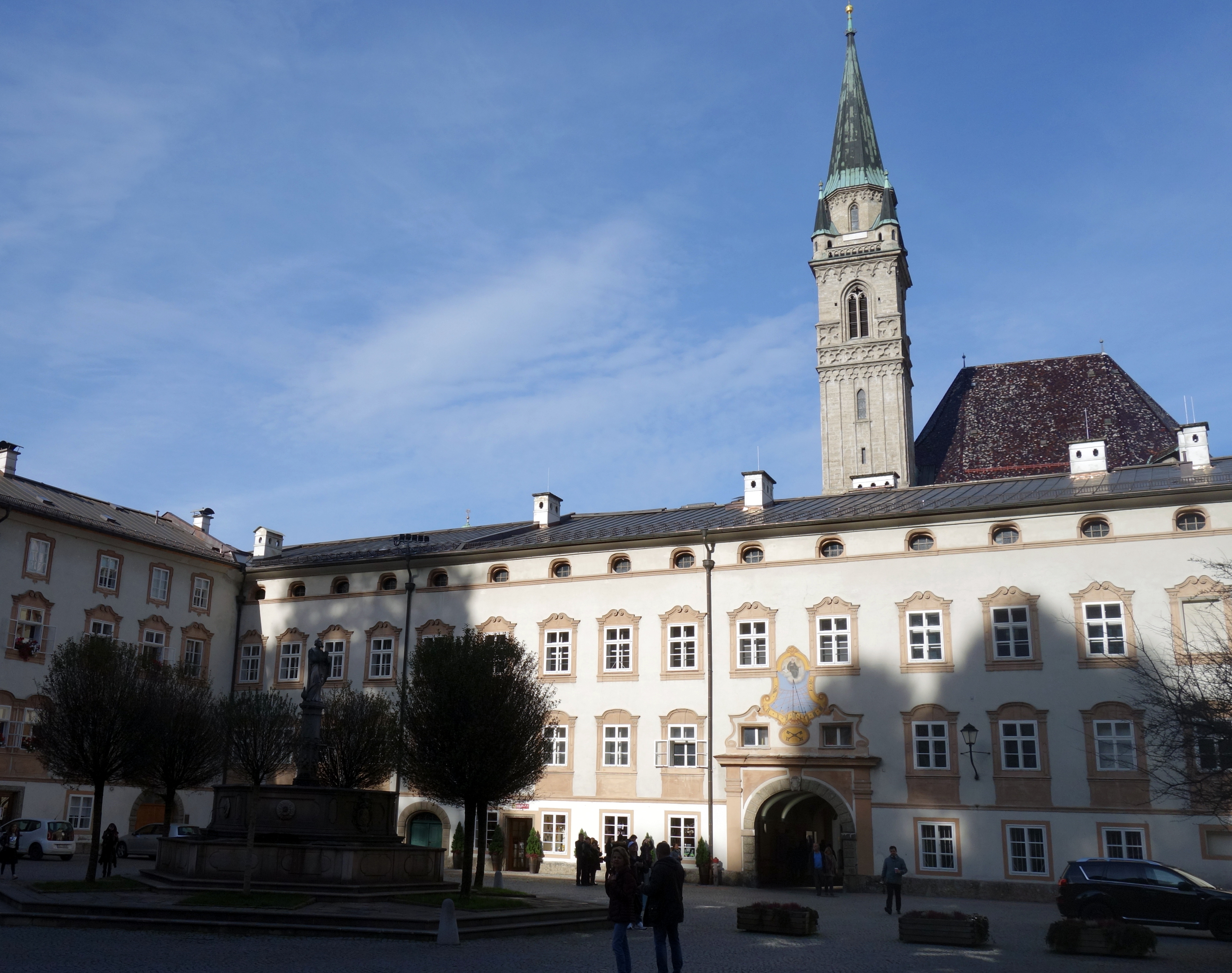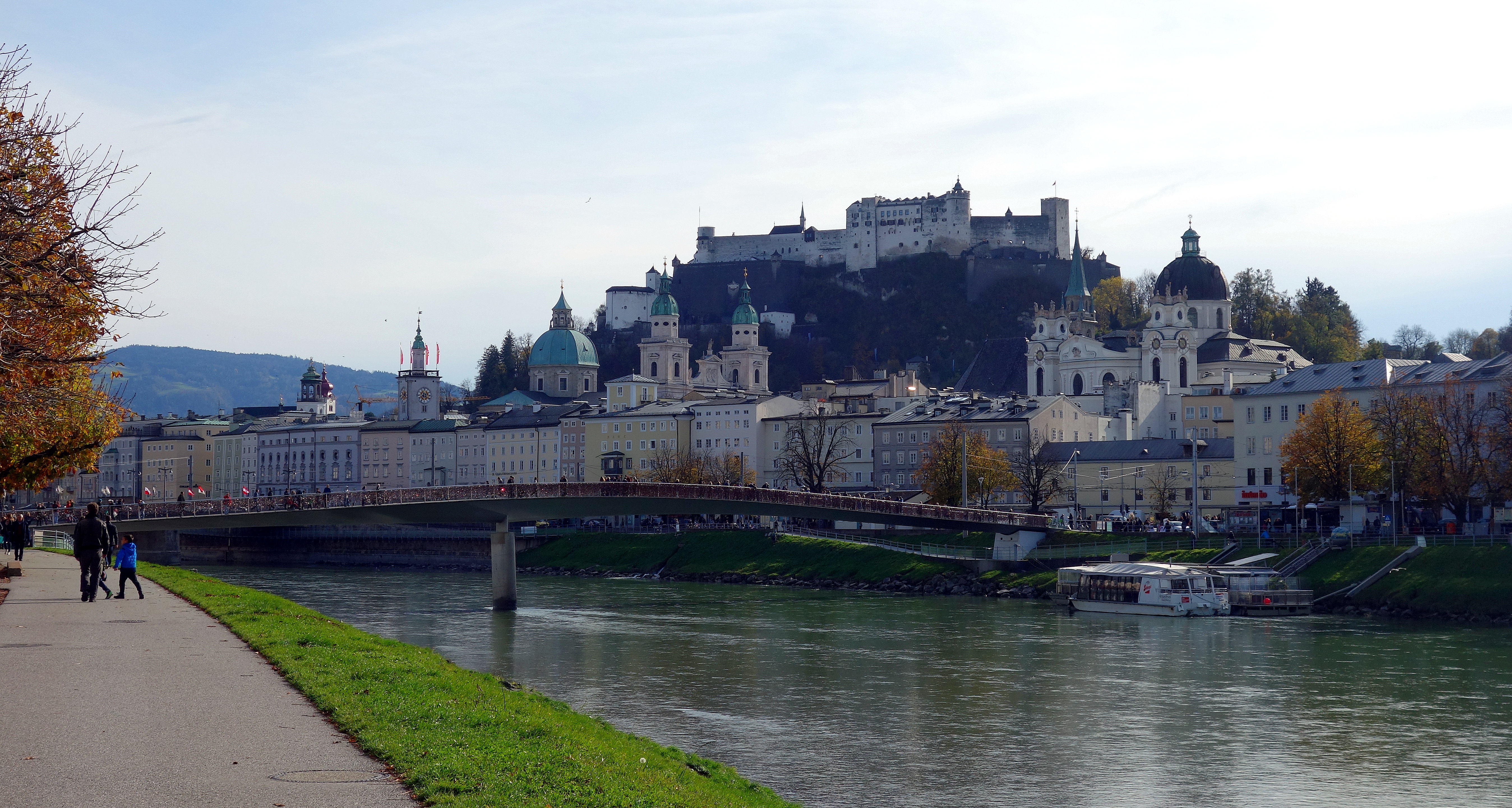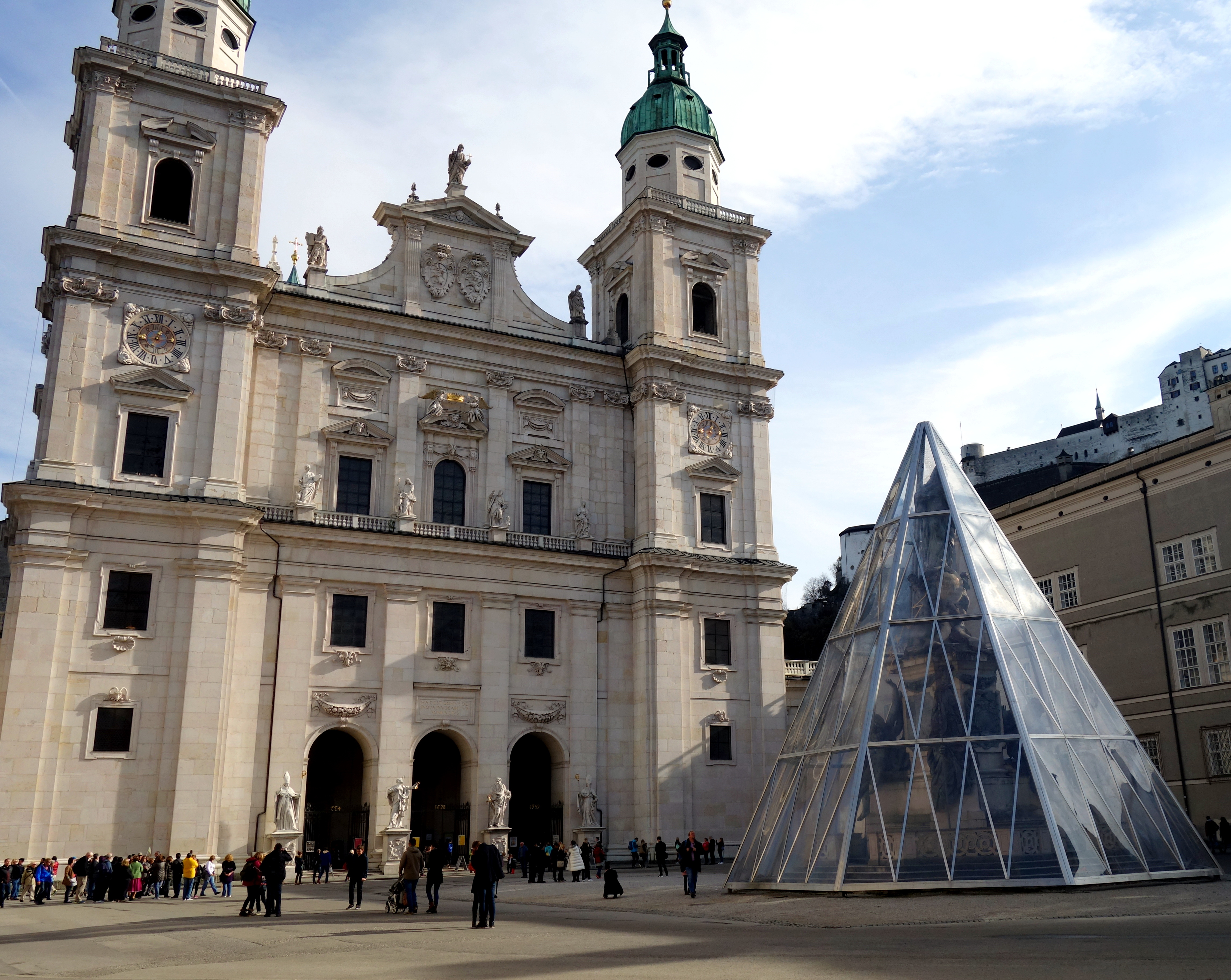 Je découvre une très jolie ville, de nombreux clochers d’églises, des petits ponts au-dessus de la rivière, des hommages à Mozart un peu partout, une immense cathédrale, une pyramide en verre comme au Louvre, des cours, des recoins…