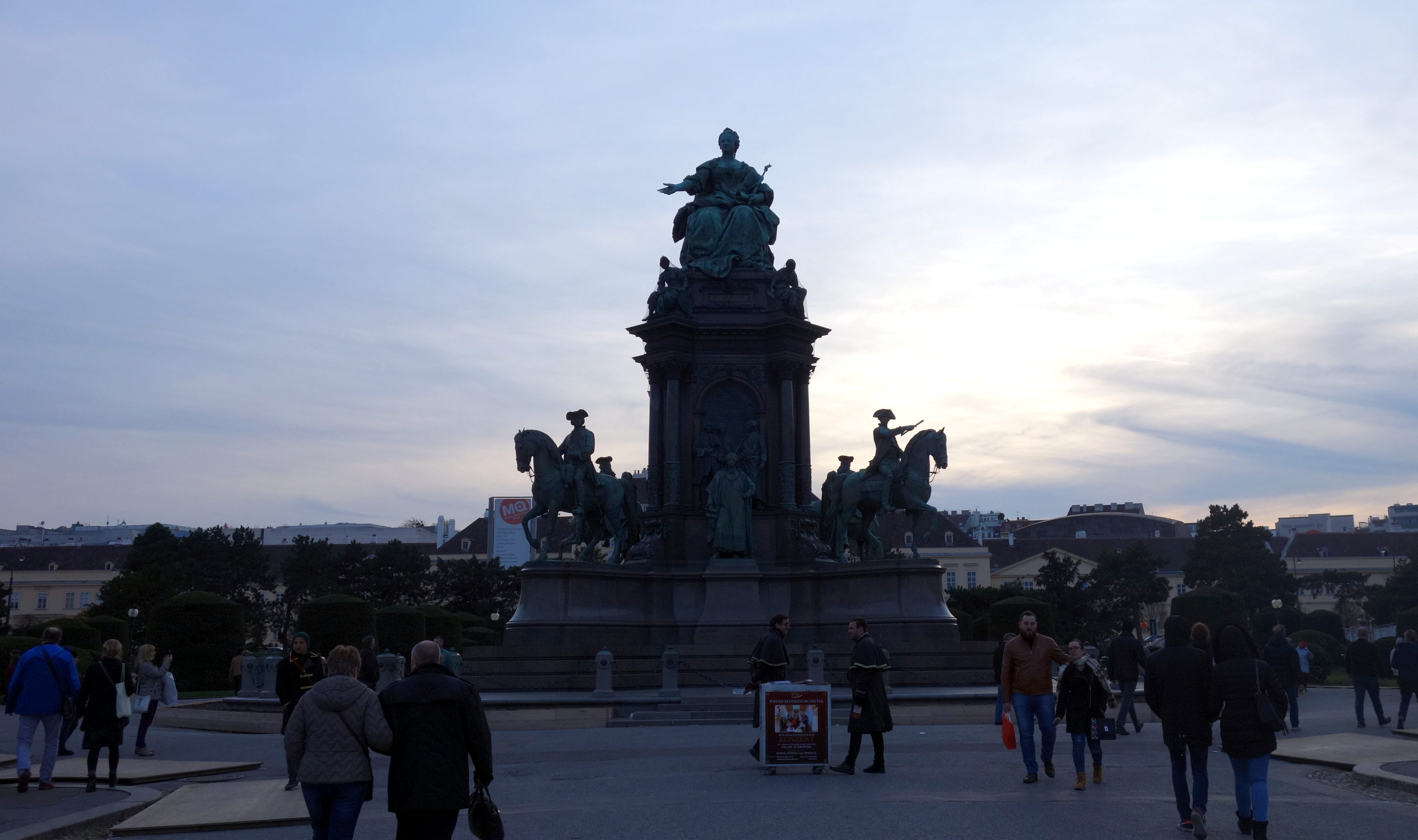 Nous sommes samedi et je pars arpenter le quartier des alentours. Je suis choquée par le monde dans les rues, les gens font du shopping, logique ! Depuis l’auberge, je marche 3 km sur une rue piétonne commerçante et suis vraiment sous le charme. De jolis bâtiments bien rénovés, plein de petites et grosses enseignes, c’est vivant et propre ! Je marche dans le centre-ville à la recherche des bâtiments qui m’avaient le plus marquée l’année dernière. Je suis un peu déçue, le parc du Karlskirche qui avait été mon gros coup de cœur est fermé pour l’installation du marché de noël et ils ont vidé l’eau du petit bassin dans lequel l’opéra se reflétait si bien. Dommage ! Je passe au crépuscule par le Museumsquartier et rentre à l’auberge.