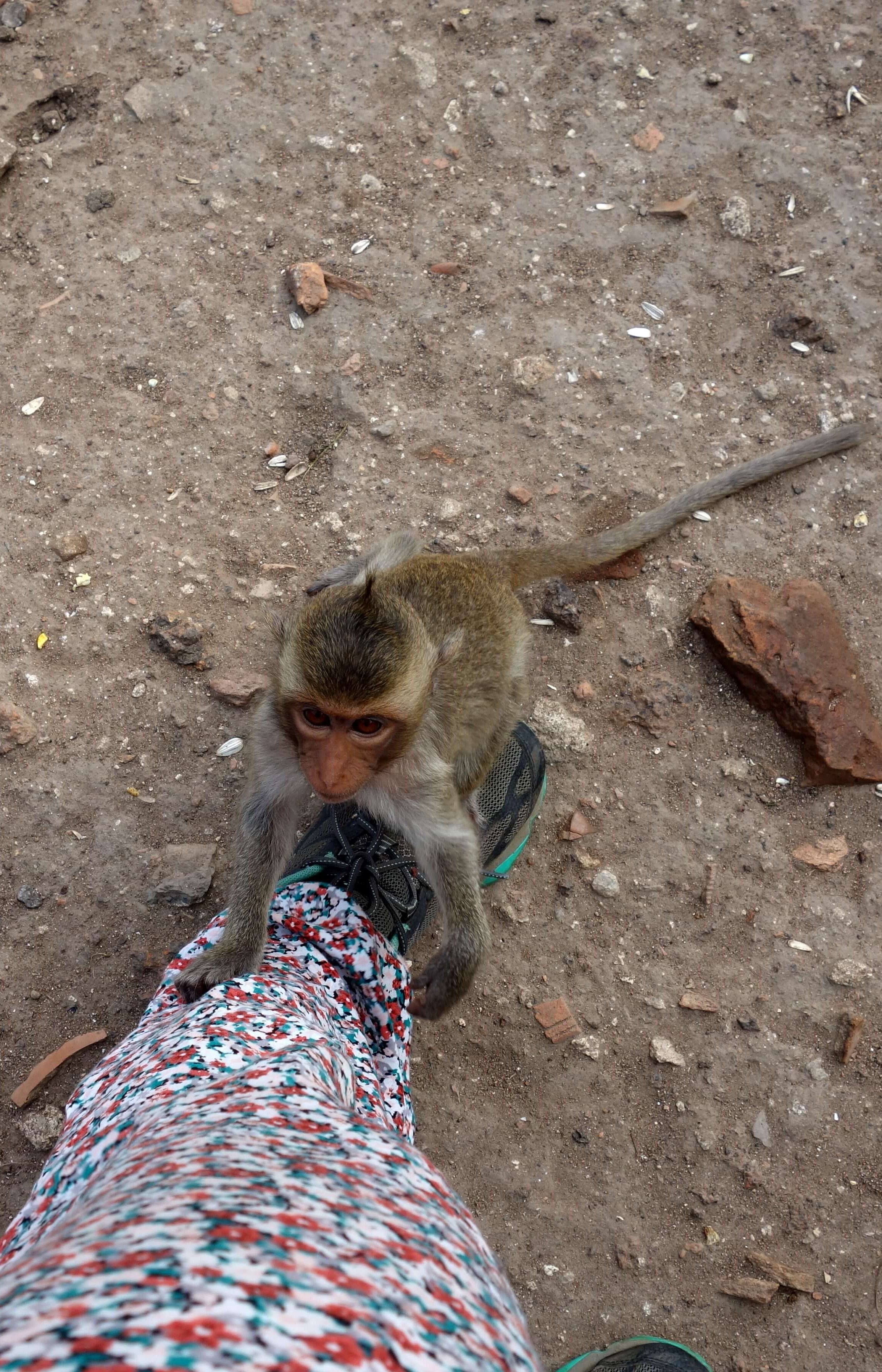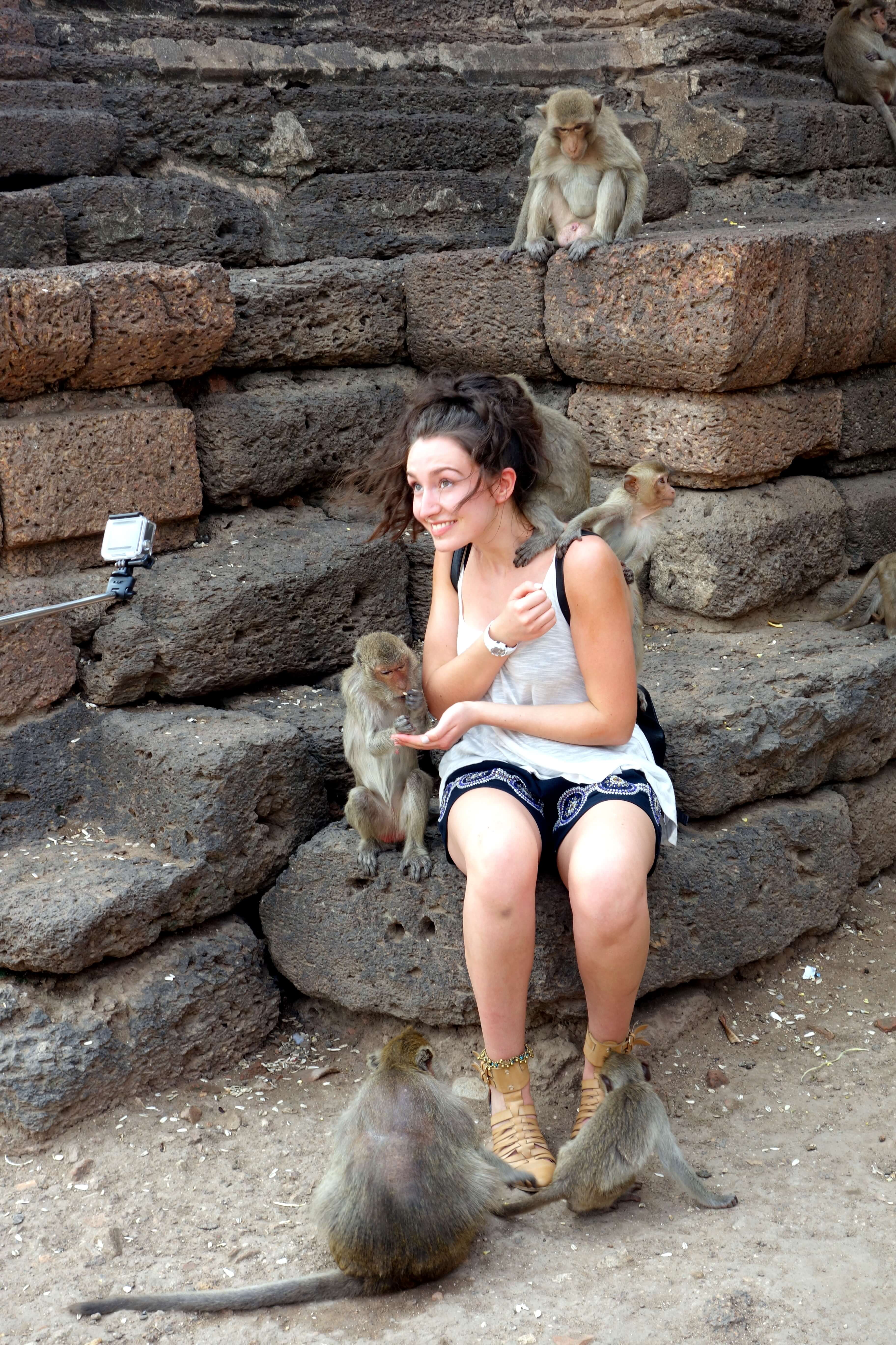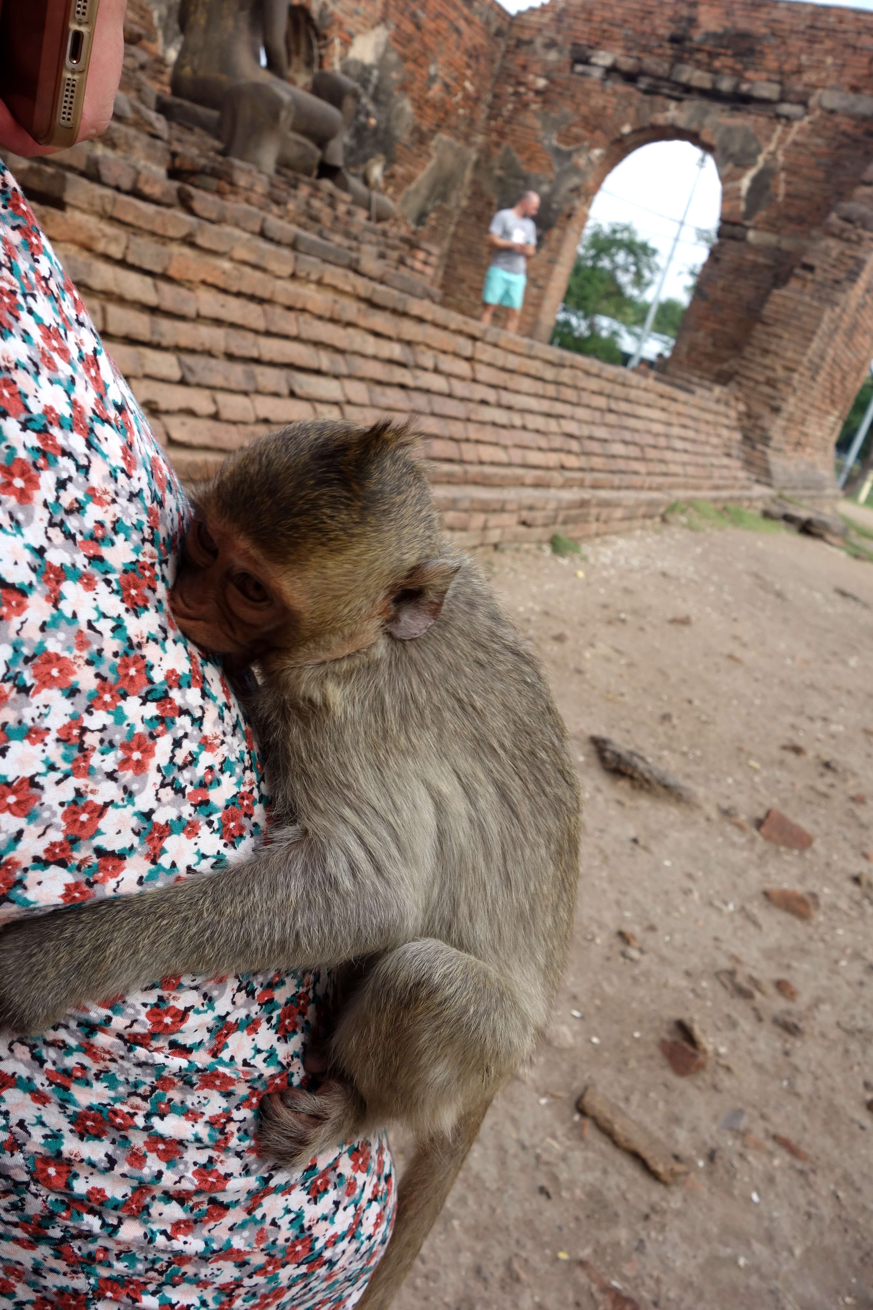 Lors de la visite de mon dernier temple de la journée, le Phra Prang Sam Yot je suis projetée au cœur du film du livre de la jungle. Des centaines de singes ont envahi le lieu. Les panneaux “don’t feed the monkey” ne semblent pas déranger la police qui donne (gratuitement !) des gâteaux apéros aux touristes pour qu’ils puissent faire approcher les singes. Bien sûr, ça marche ! Les singes leur mangent dans la main… je reste un peu choquée, les singes sont en train de fouiller les poubelles, de “faire la manche” auprès des touristes, de boire aux bouteilles de lait qui traînent par terre, on est loin de l’aspect sauvage ! Et d’un coup, 3 singes me grimpent dessus ! Je n’ai rien vu venir. Je n’ai rien à leur donner à manger mais ça n’a pas l’air de les déranger, ils jouent avec mes cheveux. Je suis pas super rassurée mais c’est quand même marrant. J’ai surtout peur de choper des puces/poux. J’essaye de les faire redescendre mais je ne sais pas comment faire. L’un d’eux restera percher sur mon sac à dos le temps de la visite.