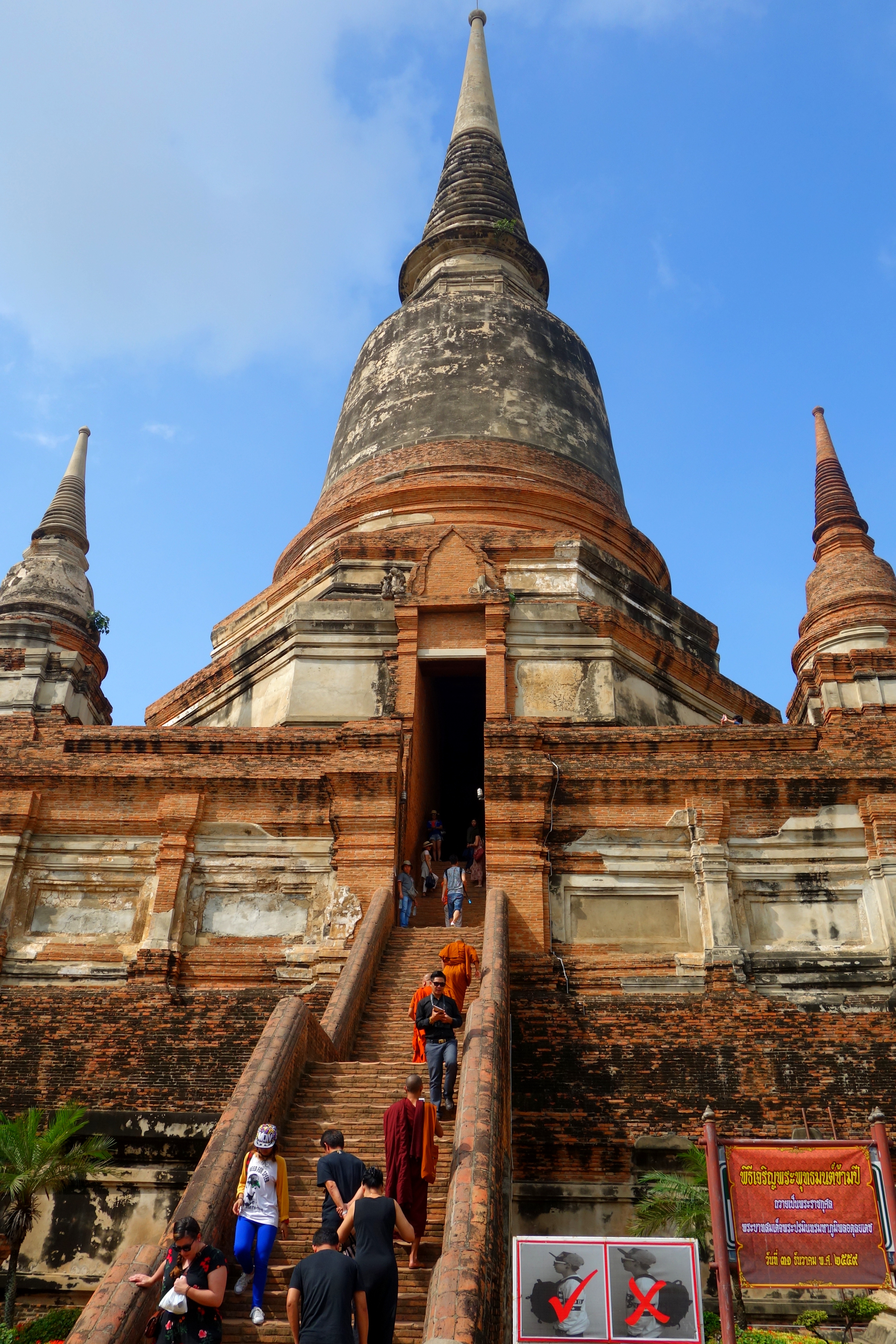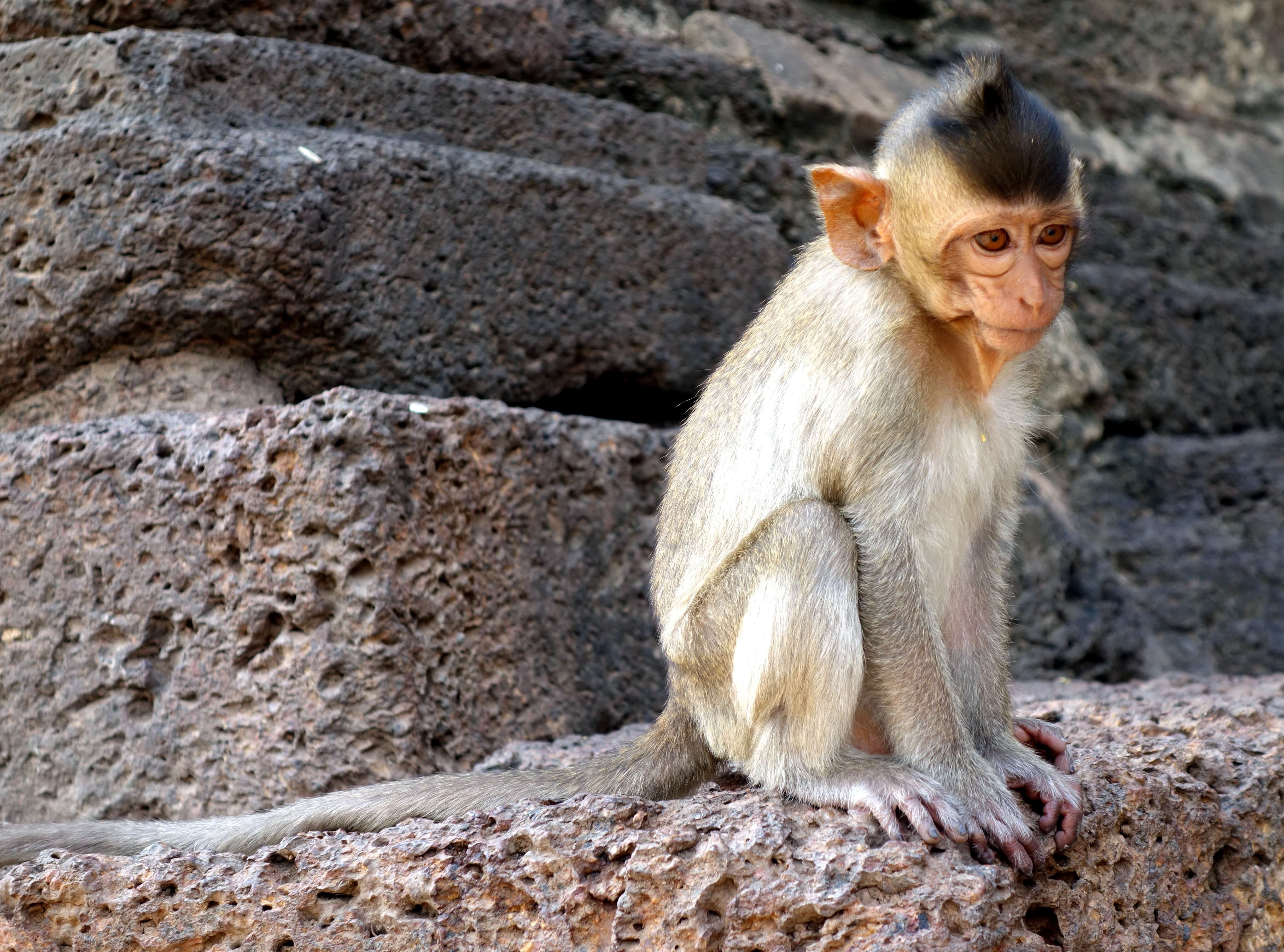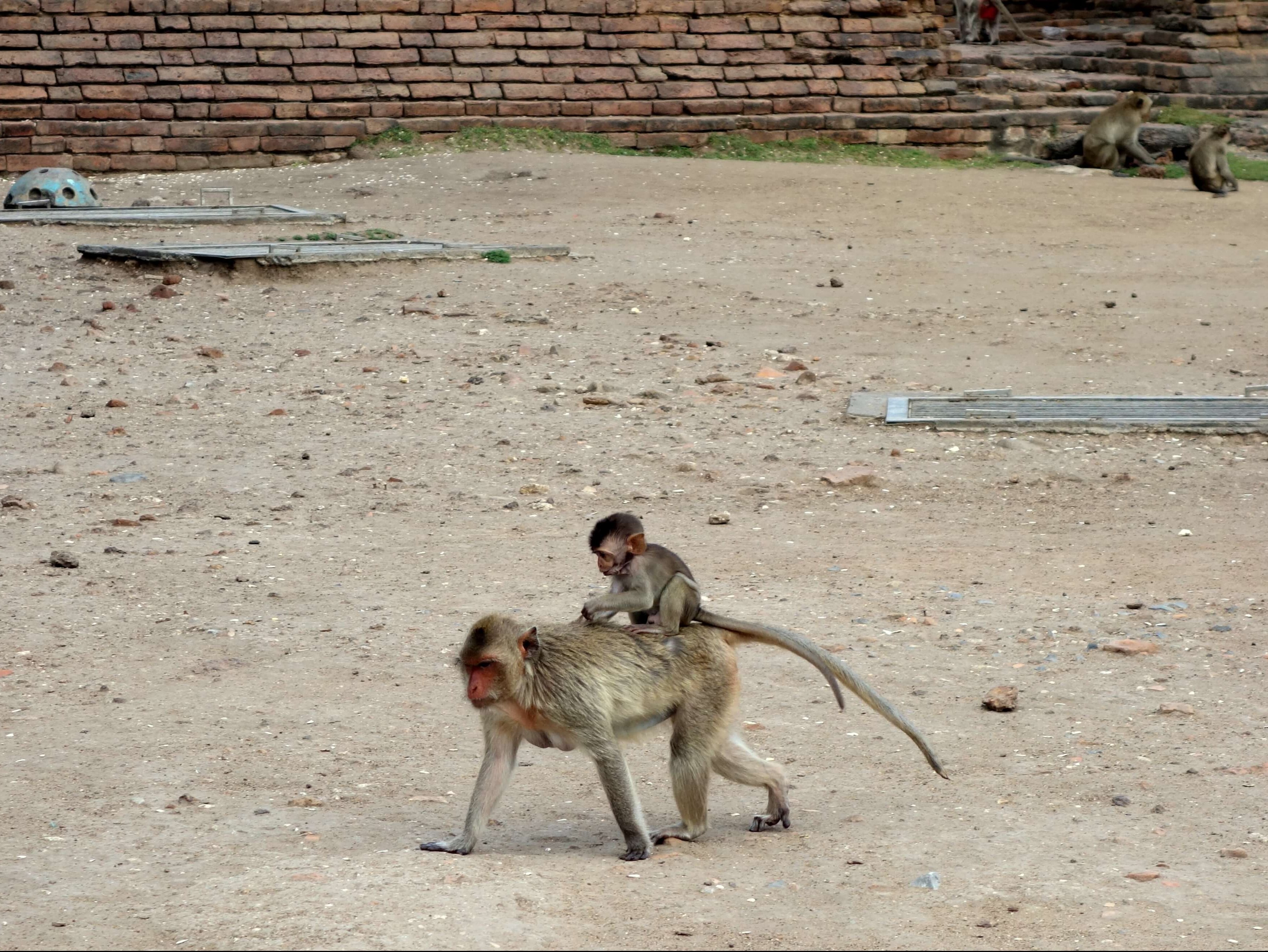 Lors de la visite de mon dernier temple de la journée, le Phra Prang Sam Yot je suis projetée au cœur du film du livre de la jungle. Des centaines de singes ont envahi le lieu. Les panneaux “don’t feed the monkey” ne semblent pas déranger la police qui donne (gratuitement !) des gâteaux apéros aux touristes pour qu’ils puissent faire approcher les singes. Bien sûr, ça marche ! Les singes leur mangent dans la main… je reste un peu choquée, les singes sont en train de fouiller les poubelles, de “faire la manche” auprès des touristes, de boire aux bouteilles de lait qui traînent par terre, on est loin de l’aspect sauvage ! Et d’un coup, 3 singes me grimpent dessus ! Je n’ai rien vu venir. Je n’ai rien à leur donner à manger mais ça n’a pas l’air de les déranger, ils jouent avec mes cheveux. Je suis pas super rassurée mais c’est quand même marrant. J’ai surtout peur de choper des puces/poux. J’essaye de les faire redescendre mais je ne sais pas comment faire. L’un d’eux restera percher sur mon sac à dos le temps de la visite.