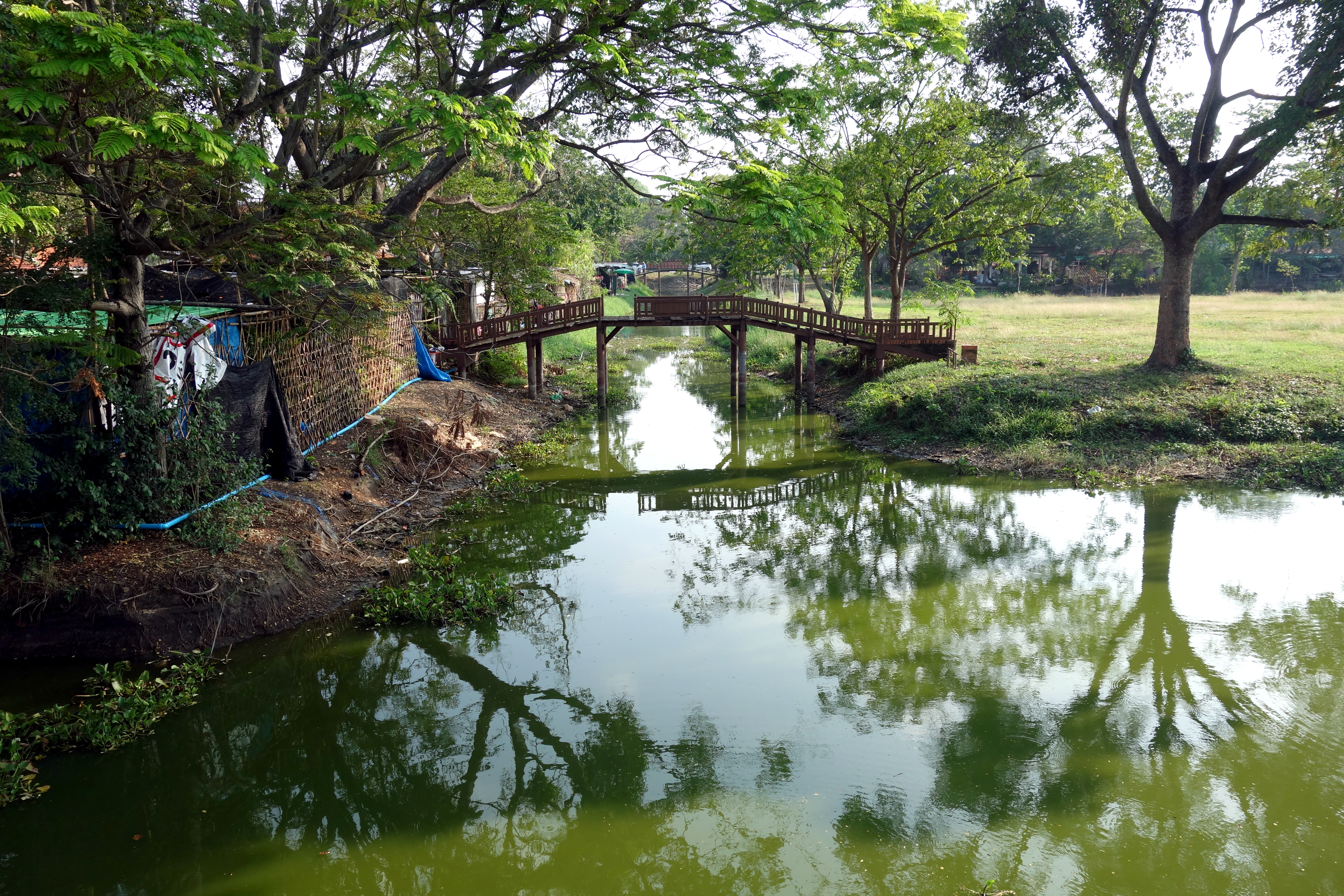 Puis, c’est déjà le départ. Je reprends le train dans l’autre sens jusqu’à Ayutthaya. En arrivant, je pars à la recherche d’une moto à louer car cette fois les temples sont aussi à l’extérieur de la ville. Je mange dans un petit restaurant végétarien dans la rue qui descend à l’embarcadère en face de la gare. La femme qui gère le lieu est très gentille. Elle a l’air exténuée, me raconte qu’elle a eu énormément de clients toute la journée. Malgré ça, elle reste hyper disponible, me donne un plan des environs et me loue un scooter à moitié prix pour le soir et le lendemain matin. Je pars ensuite à la recherche d’un endroit où passer la nuit. J’arrive dans un petit homestay du nom de Moradok Thaï, situé au cœur d’un petit jardin, c’est super joli ! La femme qui m’accueille est trop mignonne. Elle a 3 dents, une en haut et deux en bas. Je suis incapable de lui donner un âge mais elle me pose plein de questions, me présente à sa clientèle d’habitués et vient s’asseoir avec moi pour discuter pendant que je mange ma salade achetée sur le marché. Je décide de rester deux nuits pour prendre le temps de bien visiter.