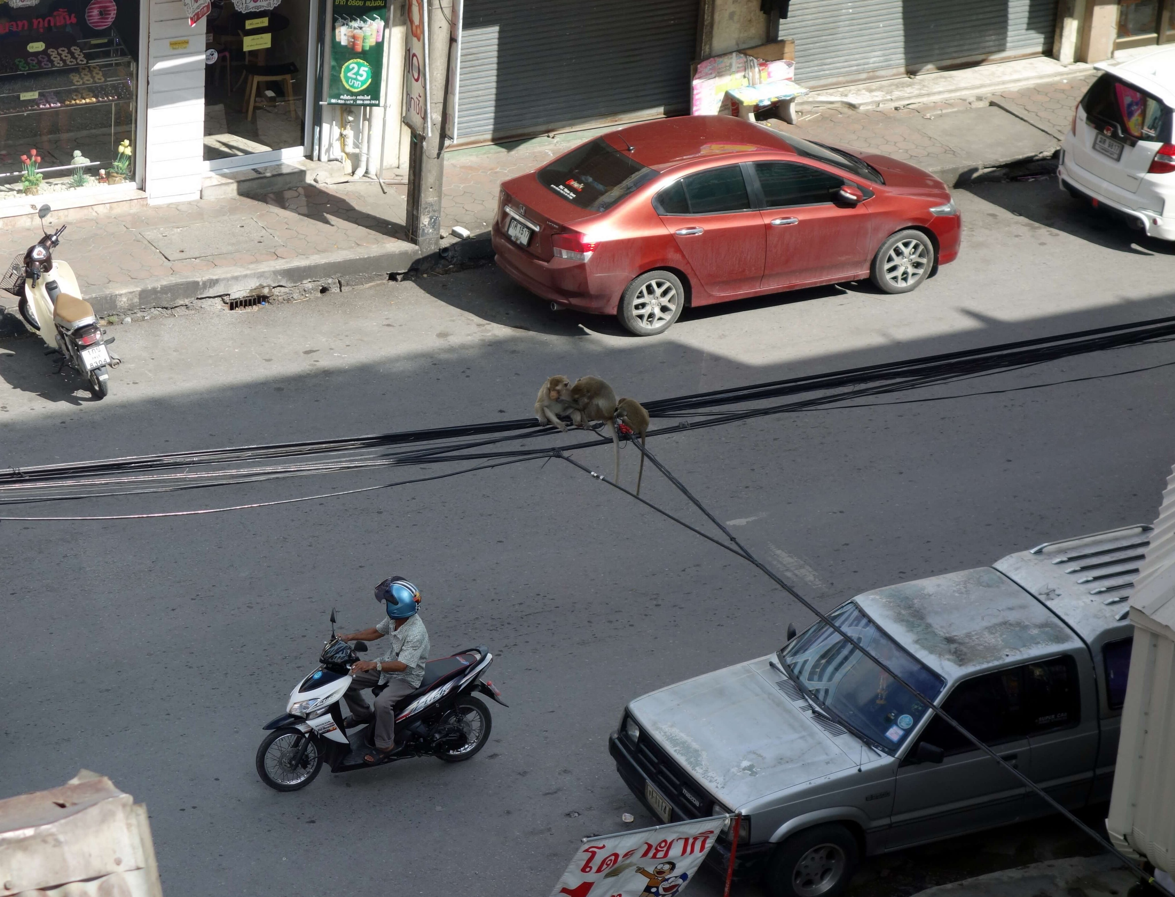 Le premier hôtel que j’avais repéré, Noom Guesthouse, est complet, dommage, ça avait l’air super sympa ! Beaucoup de touristes en terrasse, vraiment bonne ambiance. Un marché de nuit est installé dans tout le centre, c’est super accueillant ! Je vais vite chercher un hôtel pour avoir le temps d’en profiter. Je finis par trouver une chambre au Nett hôtel. La chambre est petite mais propre et ça me suffit amplement. Au dernier étage sur le toit, la terrasse est grillagée. On est en cage. C’est super bizarre mais en fait, c’est pour se protéger des singes qui sont eux en liberté (à l’état sauvage) dans la ville !!! Les rôles sont inversés, ils peuvent nous observer et on s’attend presque à ce qu’ils nous envoient des cacahouètes ! Partout dans les rues, les singes courent sur les fils électriques, tentent de voler dans les épiceries, traversent la route au milieu des scooters, escaladent les maisons…