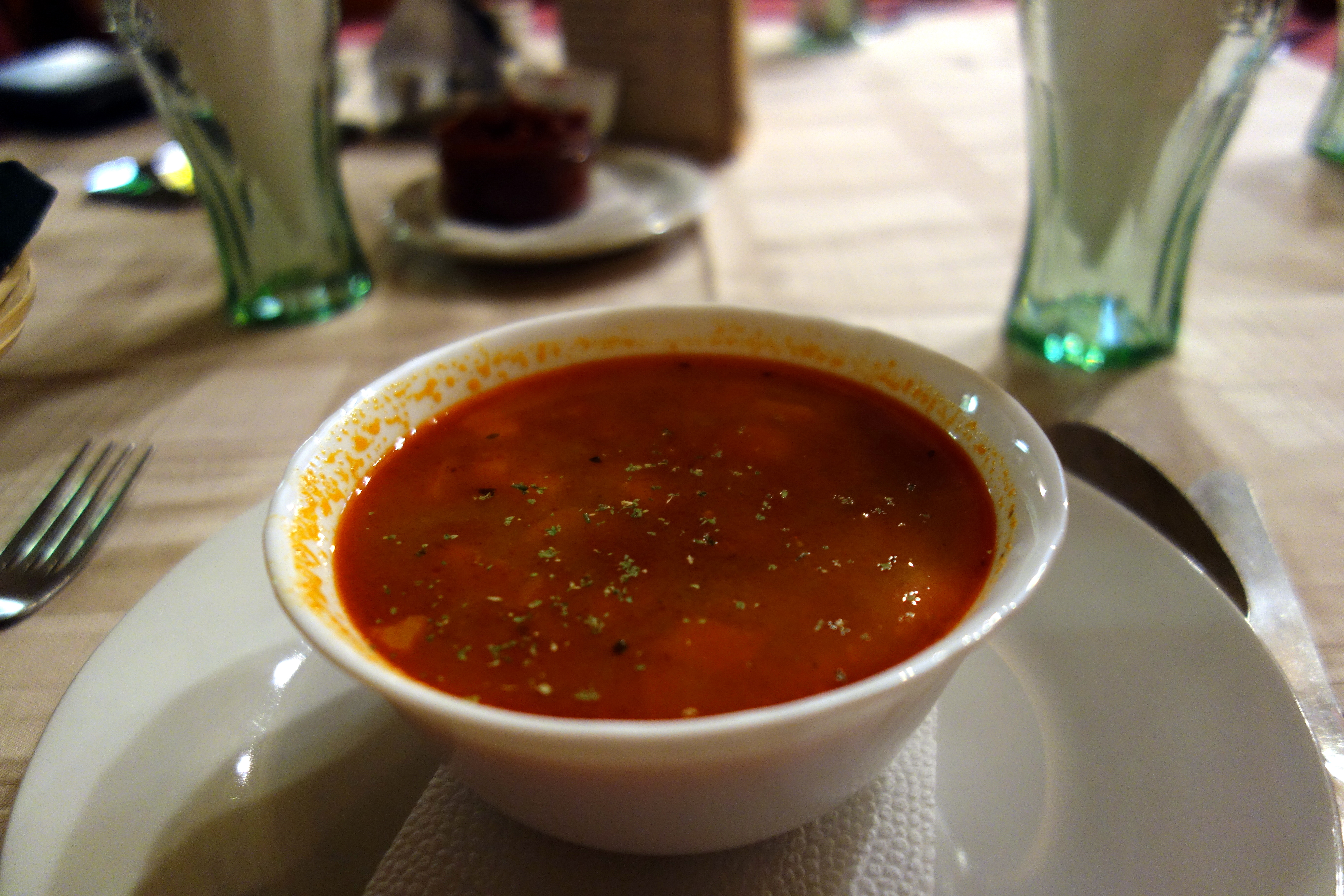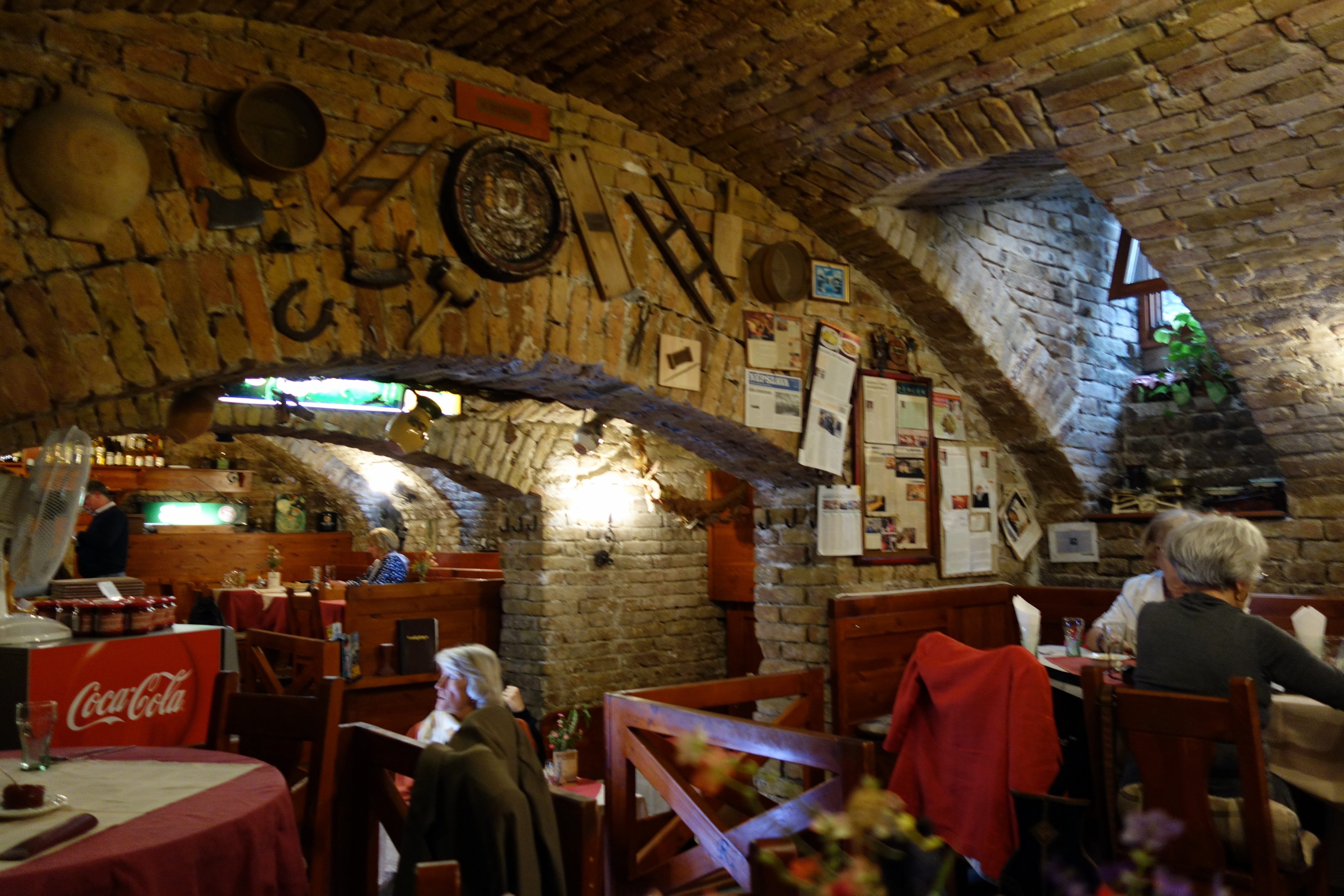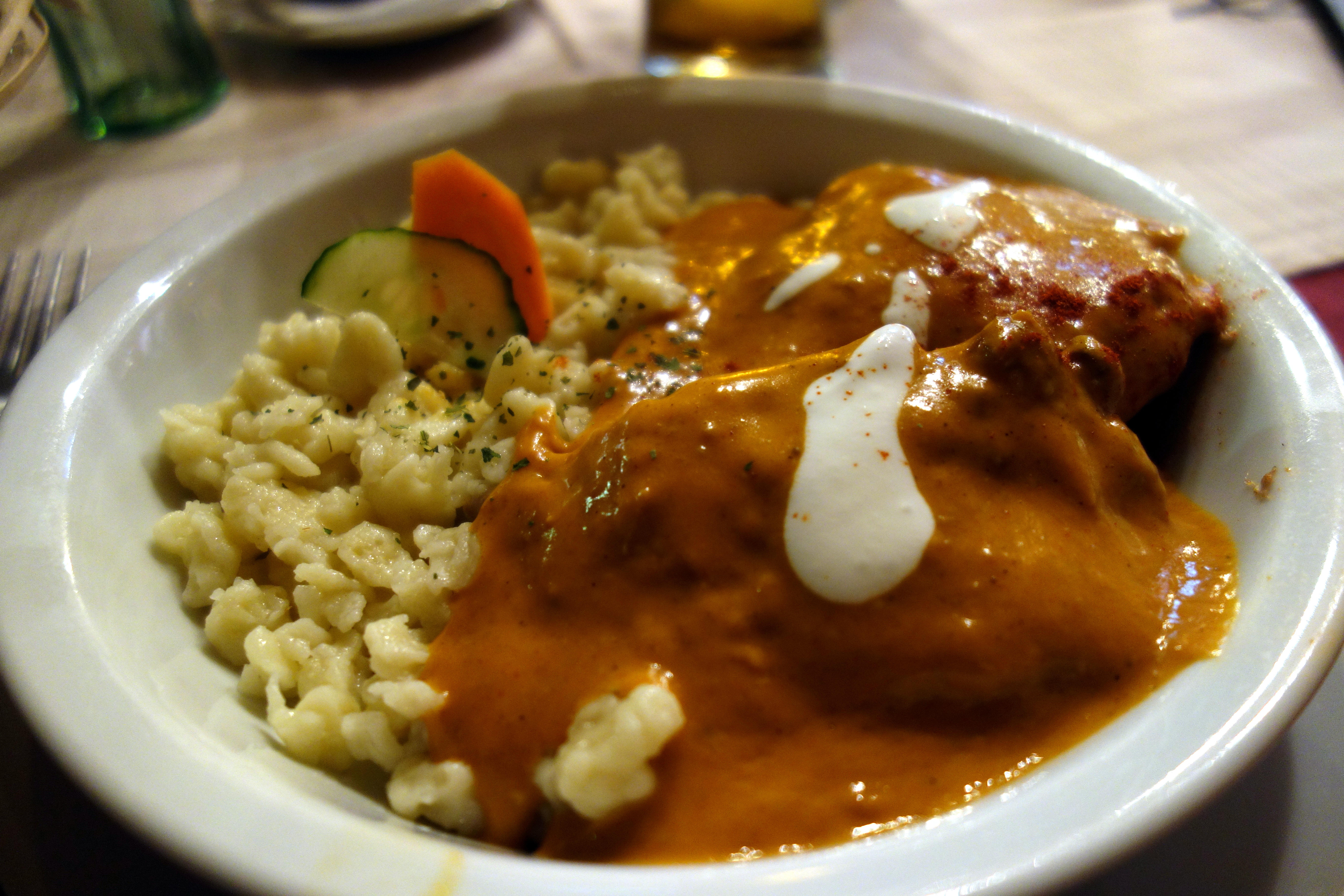 On va donc à Regos restaurant,  le numéro 1 sur Trip Advisor de bouffe locale et pas chère. On arrive devant une porte qui mène au sous-sol, bizarre… On commande un peu au pif, une soupe de Goulasch, THE spécialité et on fait confiance au serveur sur le choix du plat. Ce sera donc du poulet sauce paprika avec un genre de gnocchis (? aucune idée de comment définir cela…). Les plats sont conséquents, on n’a plus de place pour un dessert… On a payé 5€ pour entrée + plat avec une pinte ! Et c’était super bon, je recommande !