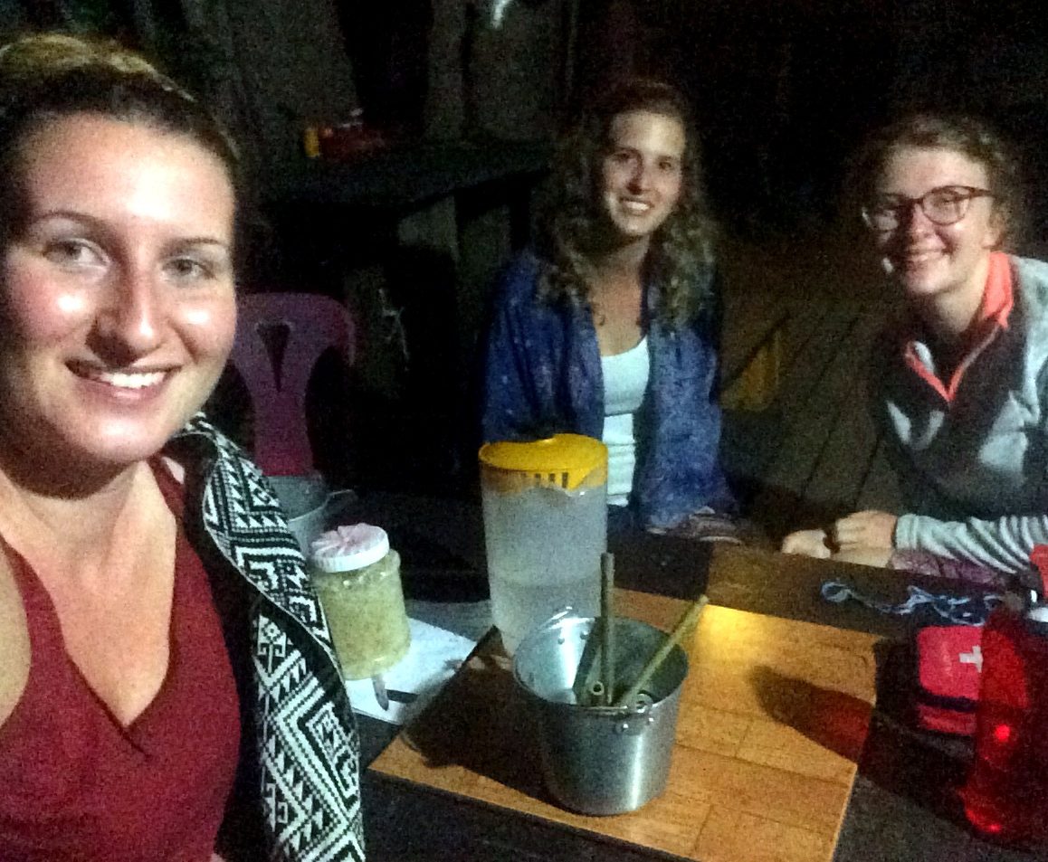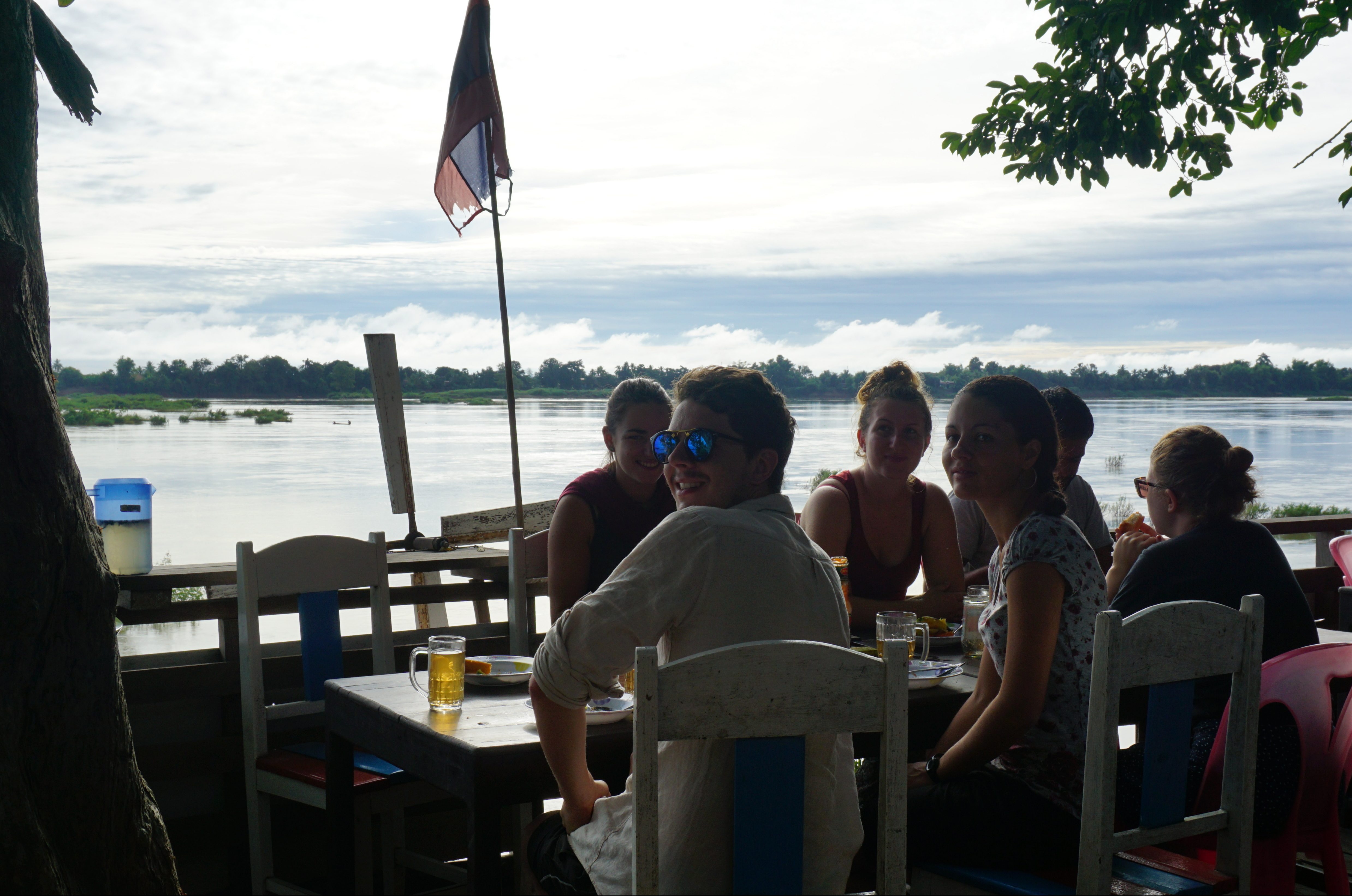 Je pars à la recherche du restaurant Sabaidee où Khamla, avec qui j’ai échangé des mails, m’a donnée rendez vous. En fait, il m’avait dit de passer quand je voulais pour des infos mais n’ayant plus de nouvelles depuis plusieurs jours j’ai débarqué un peu à l’improviste. La localisation sur Maps.Me est erronée alors je mets du temps à trouver le lieu. J’arrive alors que la nuit est déjà tombée. Il est 18h, j’ai mon sac sur le dos quand j’aperçois les lumières du restaurant. Khamla m’accueille “Oh Léna, I wasn’t expecting you tonight” le tout avec un shot de Lao Lao ! Bienvenue ! La soirée s’annonce arrosée… on me trouve une place dans une chambre et on passe directement à table. Ici le dîner à lieu à l’heure du coucher du soleil, entre 17h30 et 18h ! Ça va changer de mon rythme de Don Det….