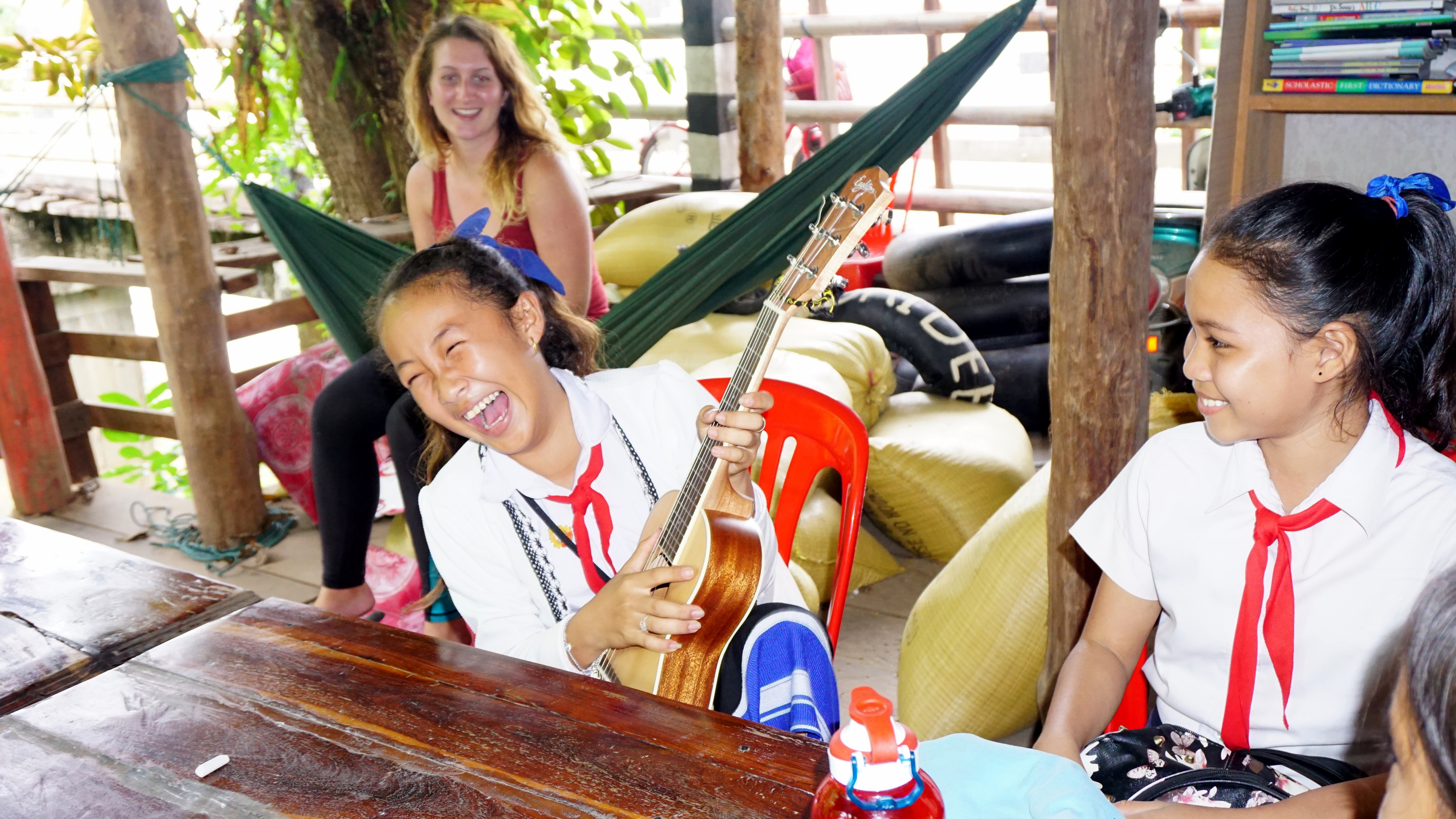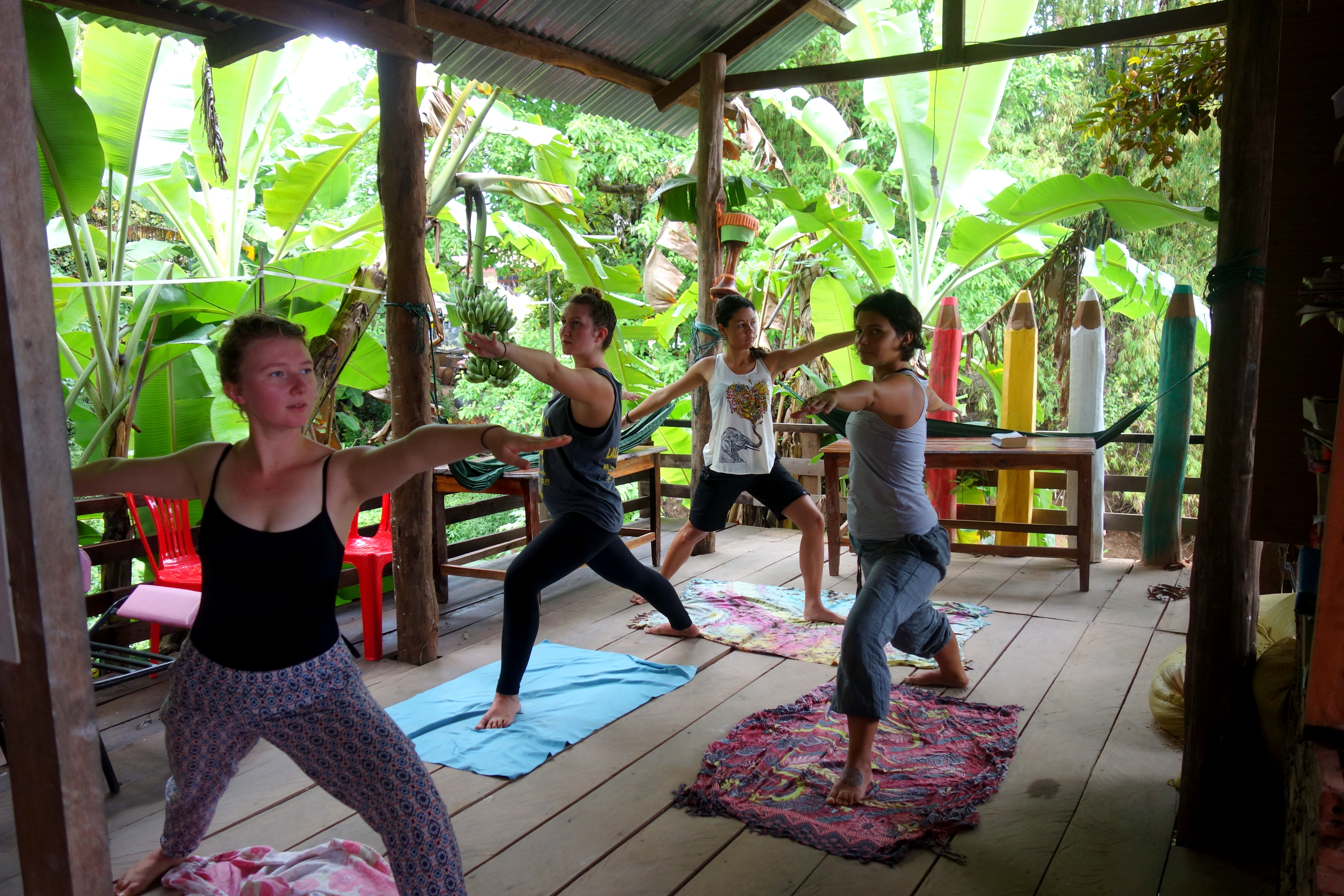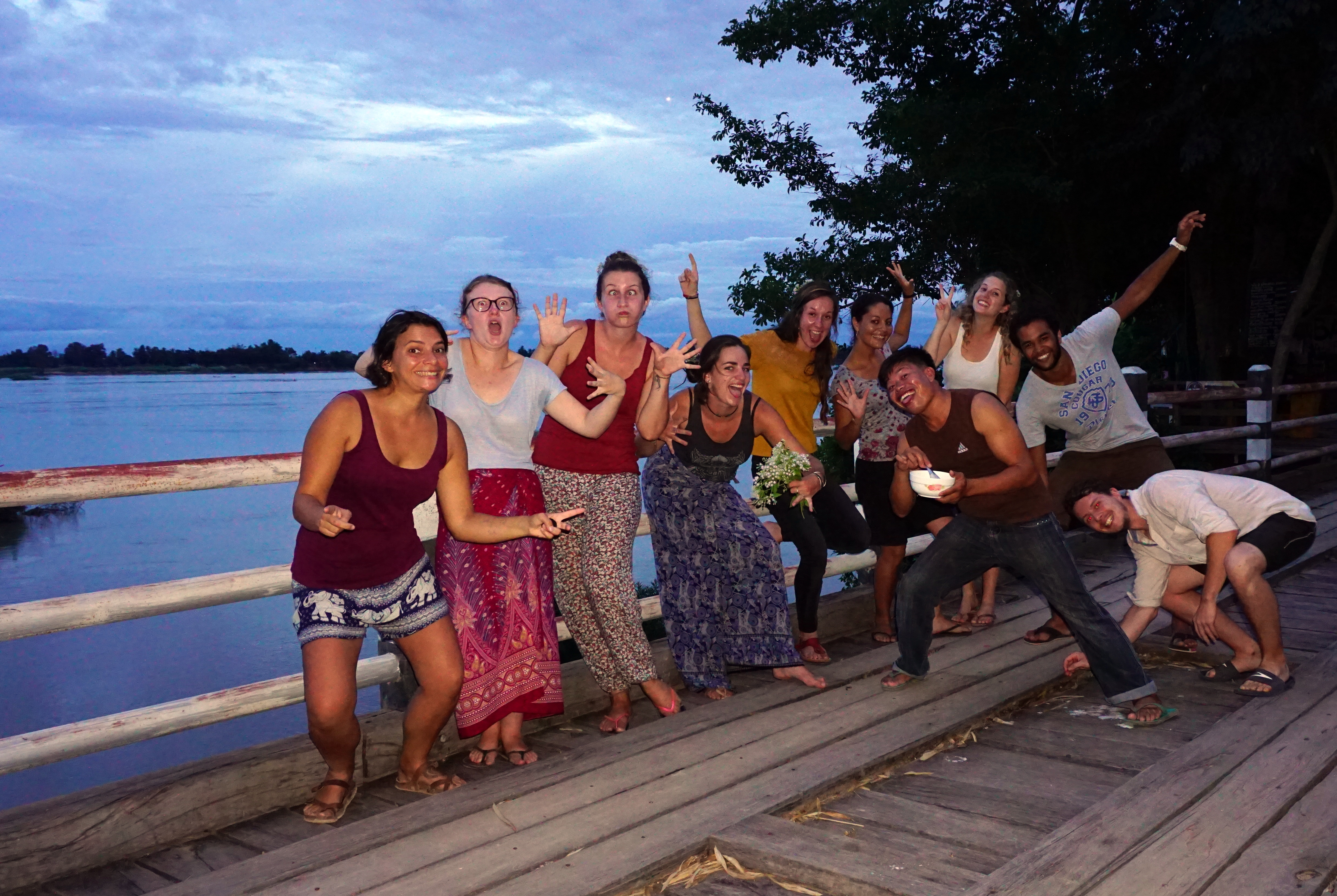 Je vous entends venir, “1 à 2 heures de cours par jour, mais c’est rien !!”. Effectivement, ça nous laisse beaucoup de temps libre. Enfin ça, c’est ce qu’on croyait ! Le premier jour, on décide de se faire une to do list pour être sûrs de ne pas s’ennuyer. Au programme : cours de yoga avec Teacher Elisa, coucher de soleil de l’autre côté de l’île, piscine dans un hôtel à proximité, visite de Don Khong à scoot/vélo, aller au marché du matin (entre 5 et 7h ), faire un concert car on a des musiciens, mettre à jour nos carnets de voyage (mon blog…..), cuisiner des pizzas et des crêpes (ce qui implique de trouver de la farine…), se baigner dans le Mékong, apprendre à jouer de la musique, faire des bracelets brésiliens, … ET SURTOUT, créer un programme pour les cours d’anglais.