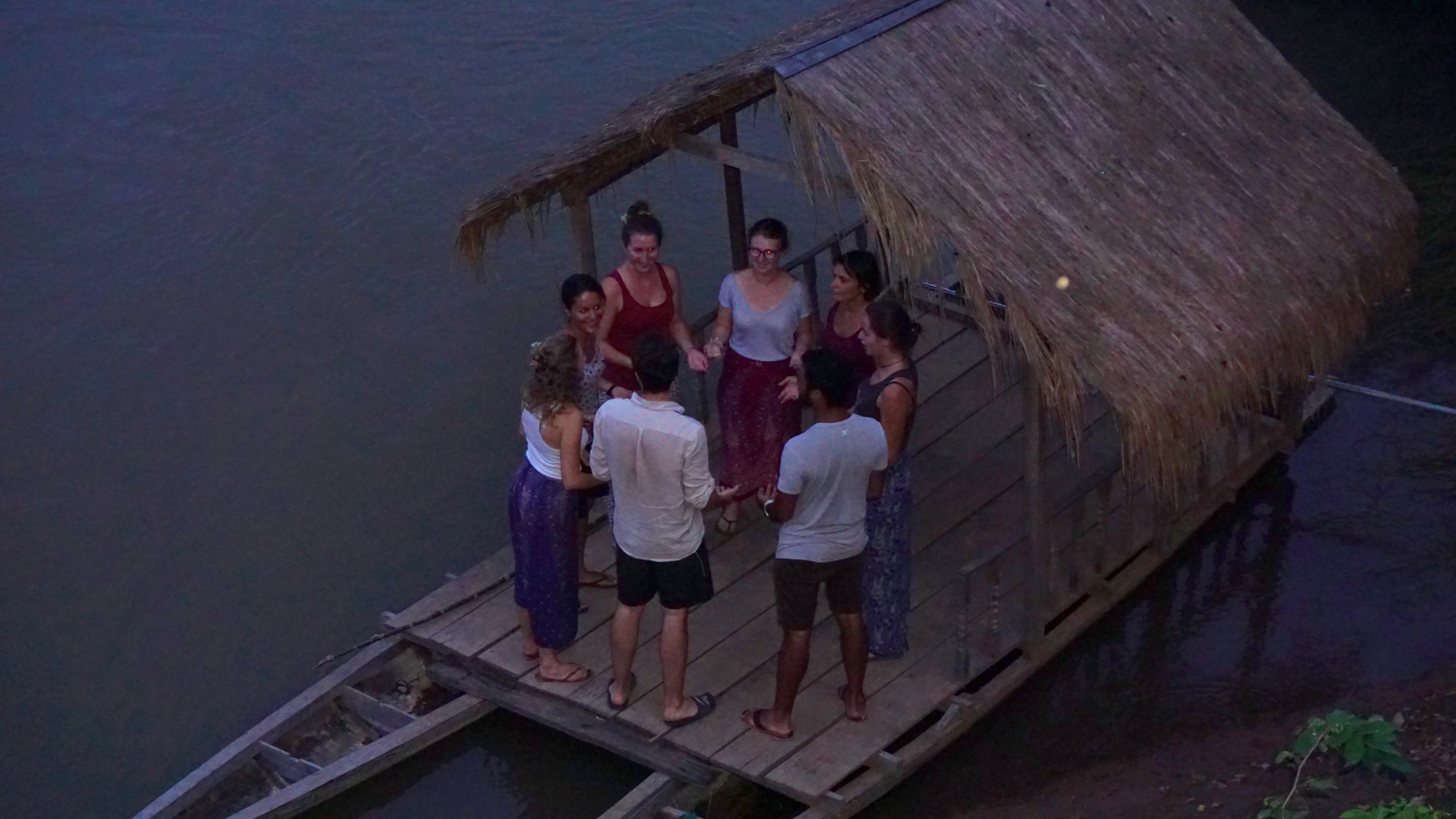 On est allés sur le bateau-maison (donc sur l’eau) dans le noir et, installés en cercle on s’est mis à “chanter” des “aaaaaaaaaaaah” et des “oooooooooooooh” …. Malgré les rires, ou devrais-je dire les fous rires, on a fini par y arriver et c’était vraiment beau ! Les frissons et l’échange étaient bien présents. Un super moment !!