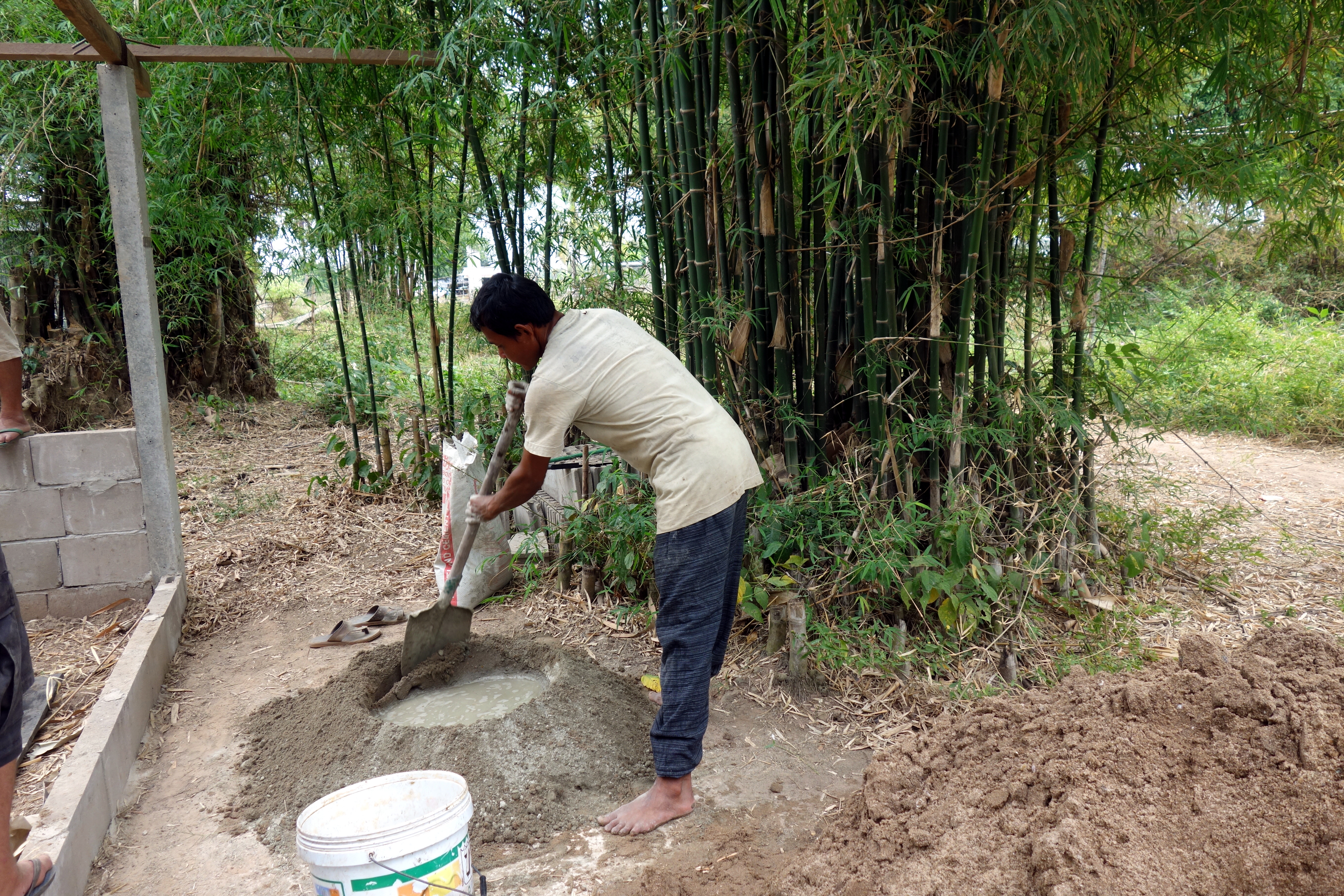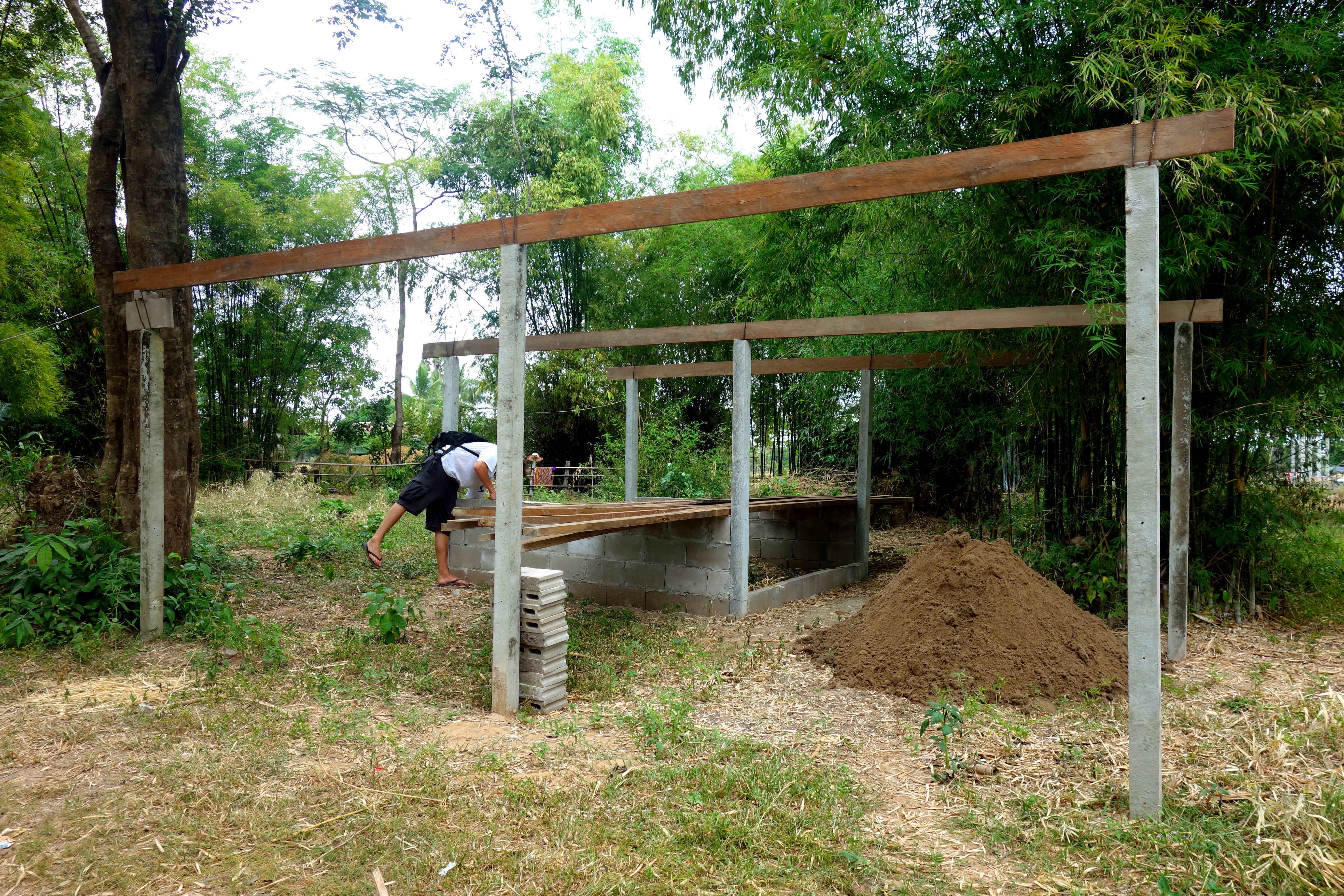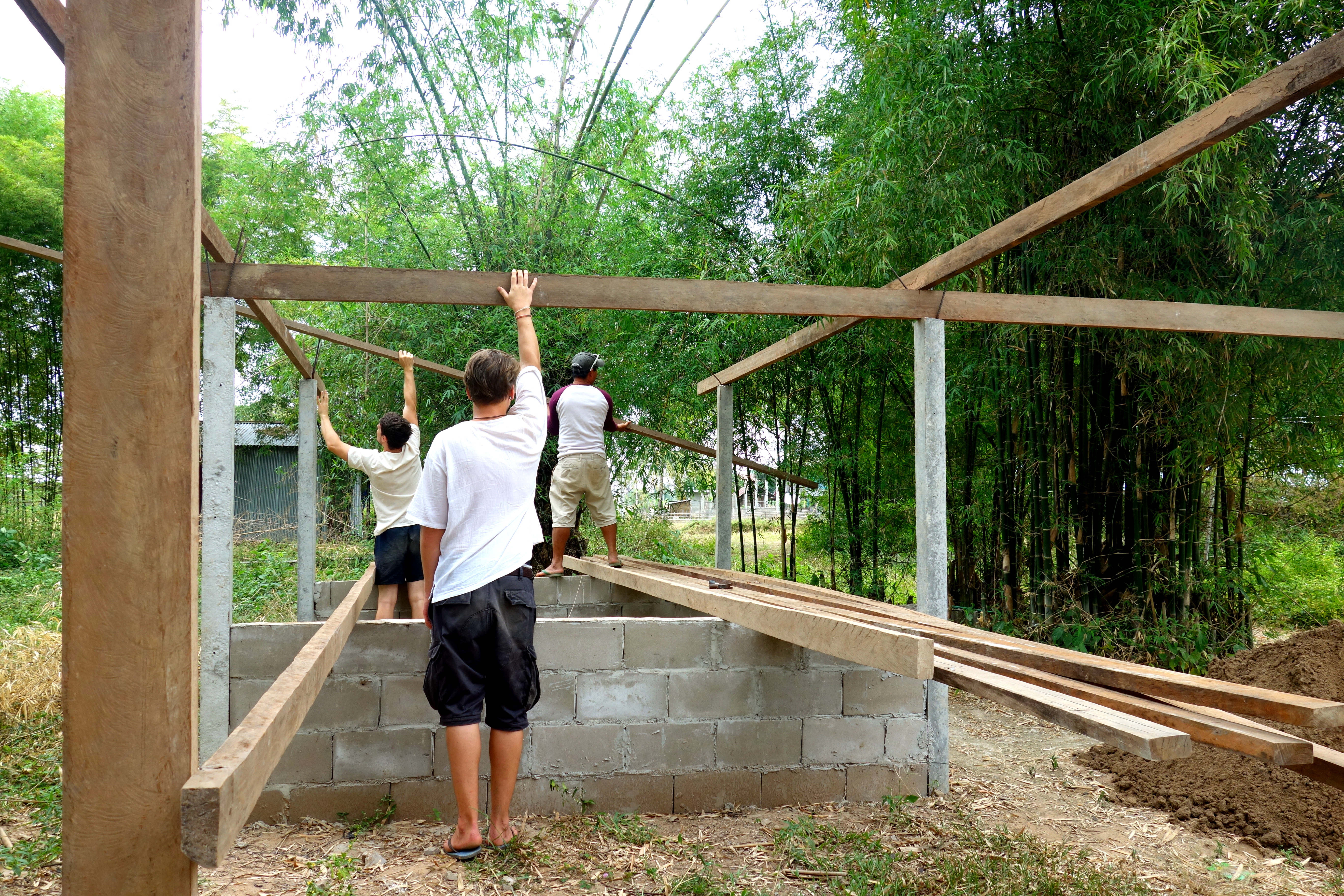 Nous étions censés l’aider mais on n’a malheureusement pas trop su comment se rendre utile. Heureusement les garçons étaient plus efficaces ! Pour ma part, j’ai quand même appris à faire du ciment 😉 on a découvert le mode de construction façon Lao, pas très rassurant de savoir qu’on dort dans une maison construite de la même façon…. je vous mets des photos, c’est encore ce qui sera le plus parlant !