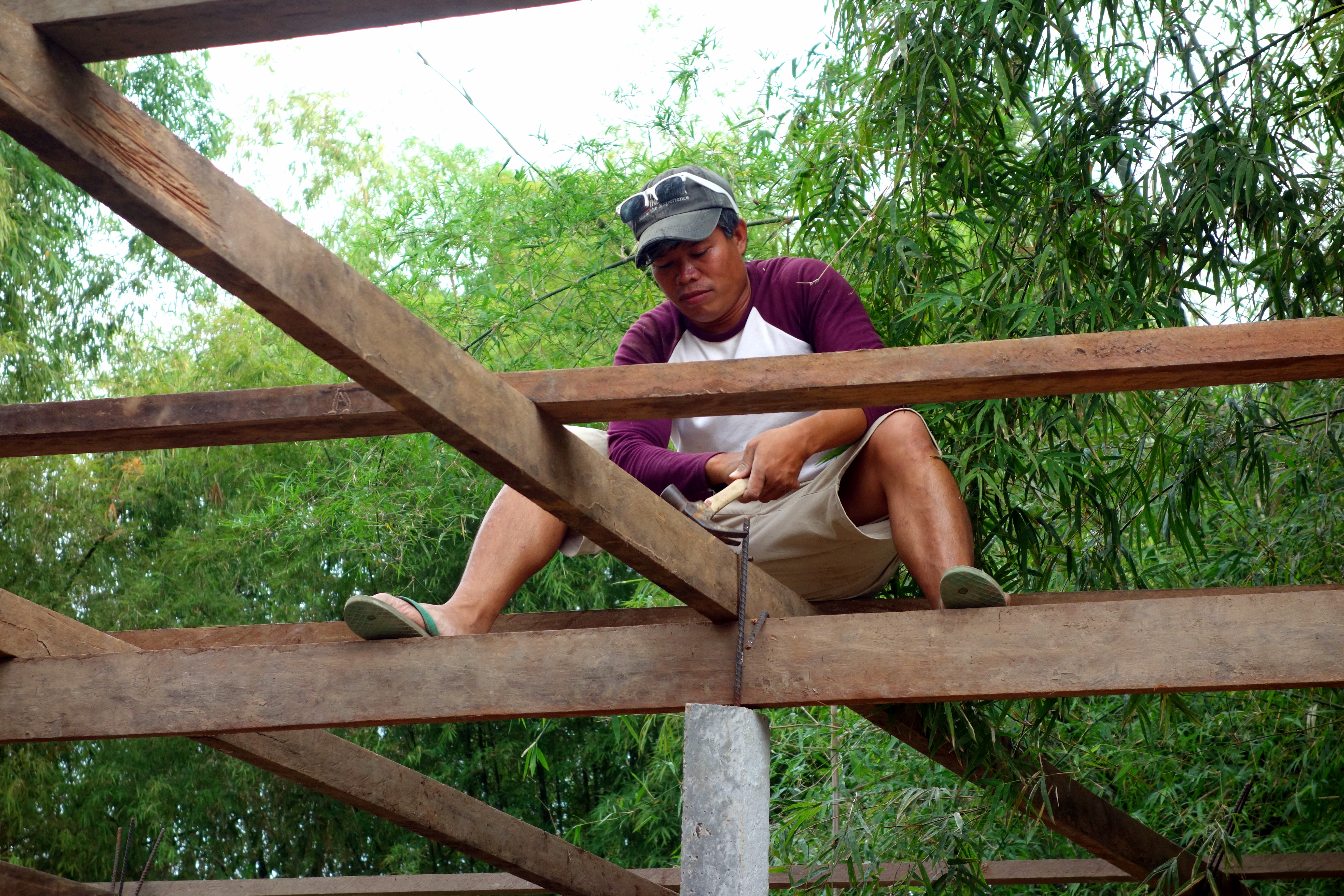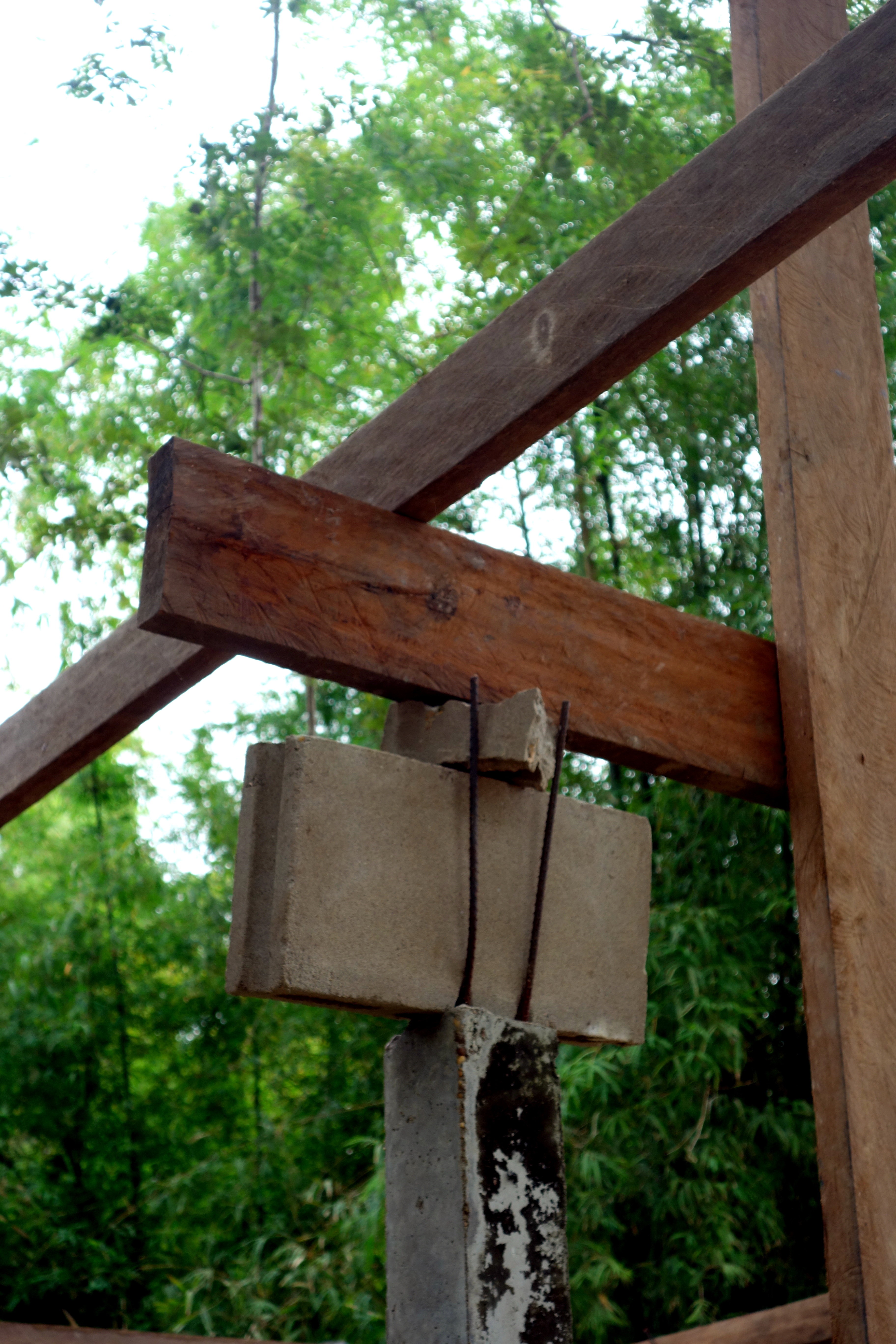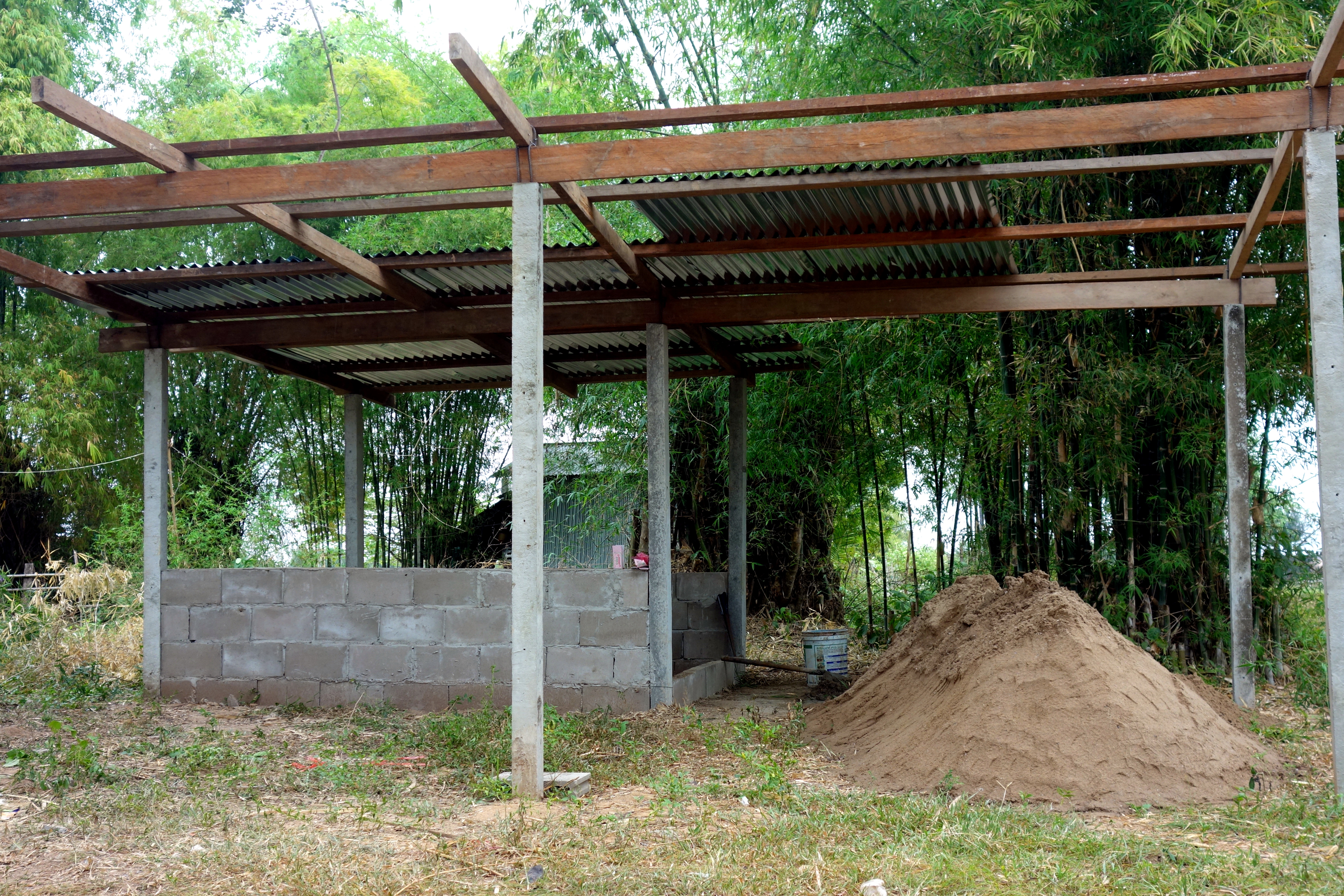 Nous étions censés l’aider mais on n’a malheureusement pas trop su comment se rendre utile. Heureusement les garçons étaient plus efficaces ! Pour ma part, j’ai quand même appris à faire du ciment 😉 on a découvert le mode de construction façon Lao, pas très rassurant de savoir qu’on dort dans une maison construite de la même façon…. je vous mets des photos, c’est encore ce qui sera le plus parlant !