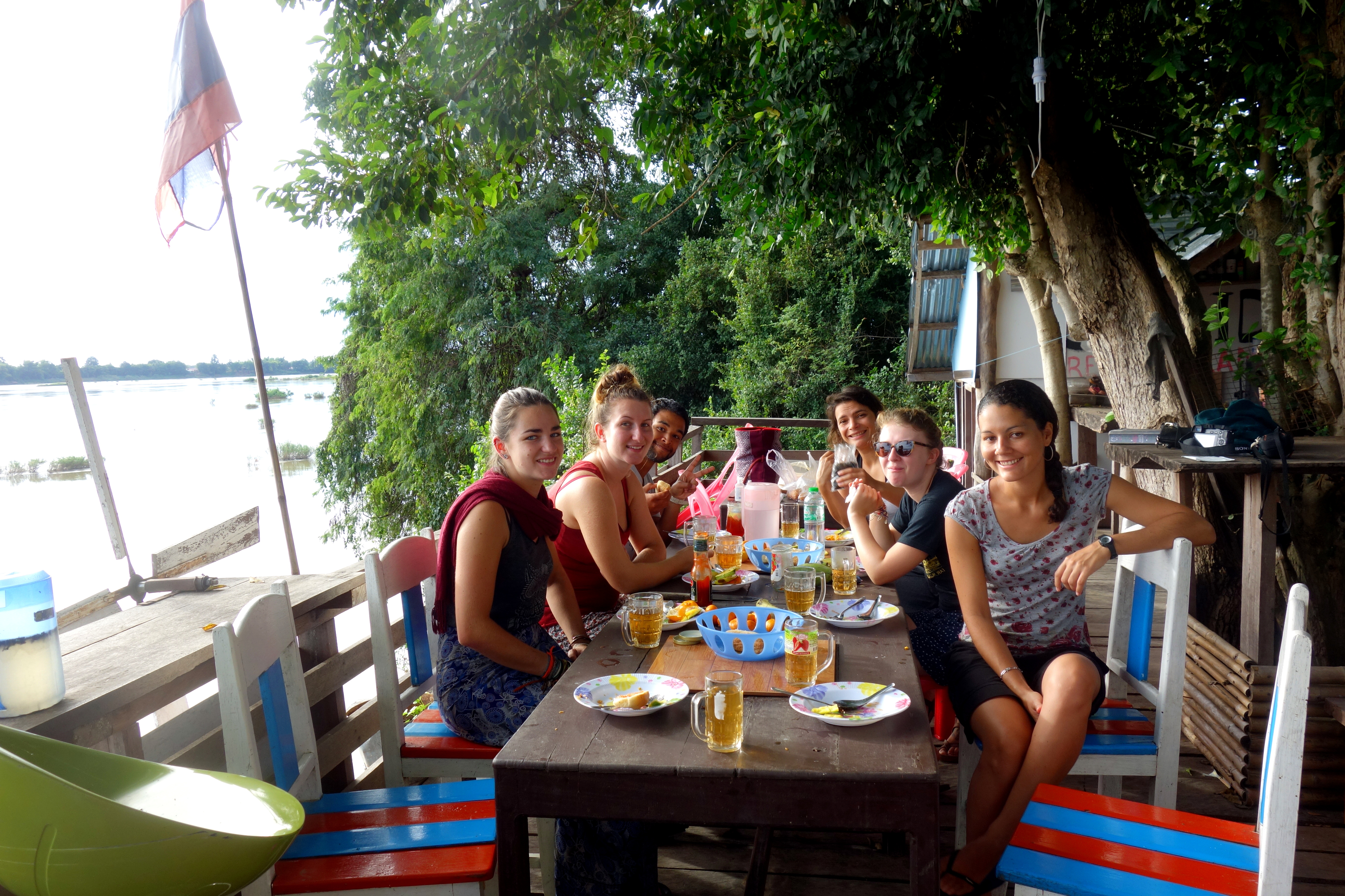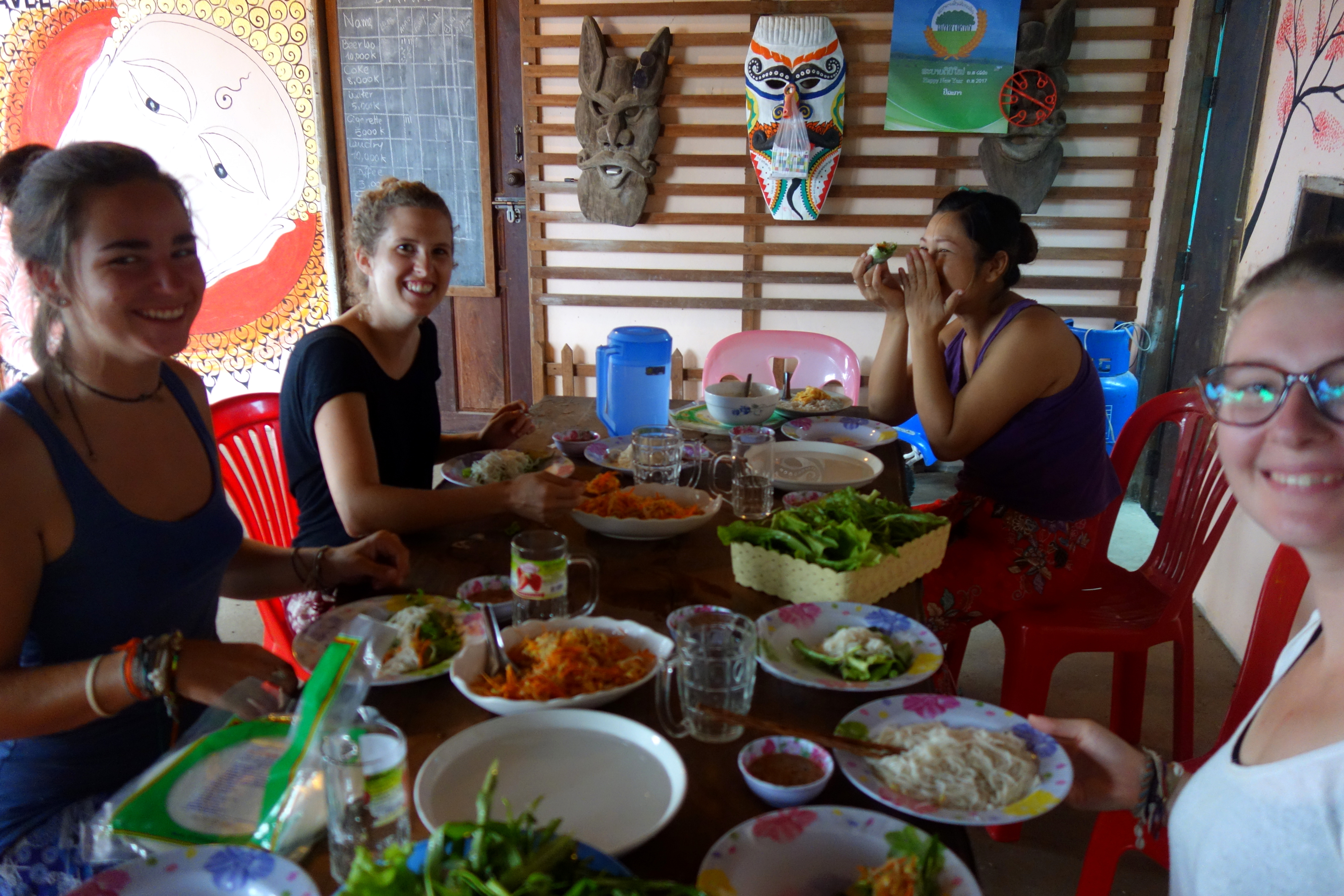 Ma première soirée sur l’île lance le ton de la semaine, bonne humeur et rire sont au rendez vous. Pour la petite anecdote, mon premier matin, lors de mon premier petit déjeuner à 7h, les amis de Khamla nous ont proposé de la bière et du Lao Lao !!! C’est la fête de l’année alors ils commencent tôt, très tôt … vous l’aurez deviné, on a gentiment refusé ! Malheureusement, je n’aurai pas l’occasion de bien connaître Marlies (hollandaise), Orian (vénézuélien) et Anais une française qui partent dès le lendemain. En revanche, le courant passe très rapidement avec Anna et Elisa, deux Françaises qui restent avec moi pour cette nouvelle semaine. Comme moi, elles voyagent en solo sur plusieurs mois en Asie. On a plein de bons plans à s’échanger et ça tombe bien, on va avoir du temps pour papoter !