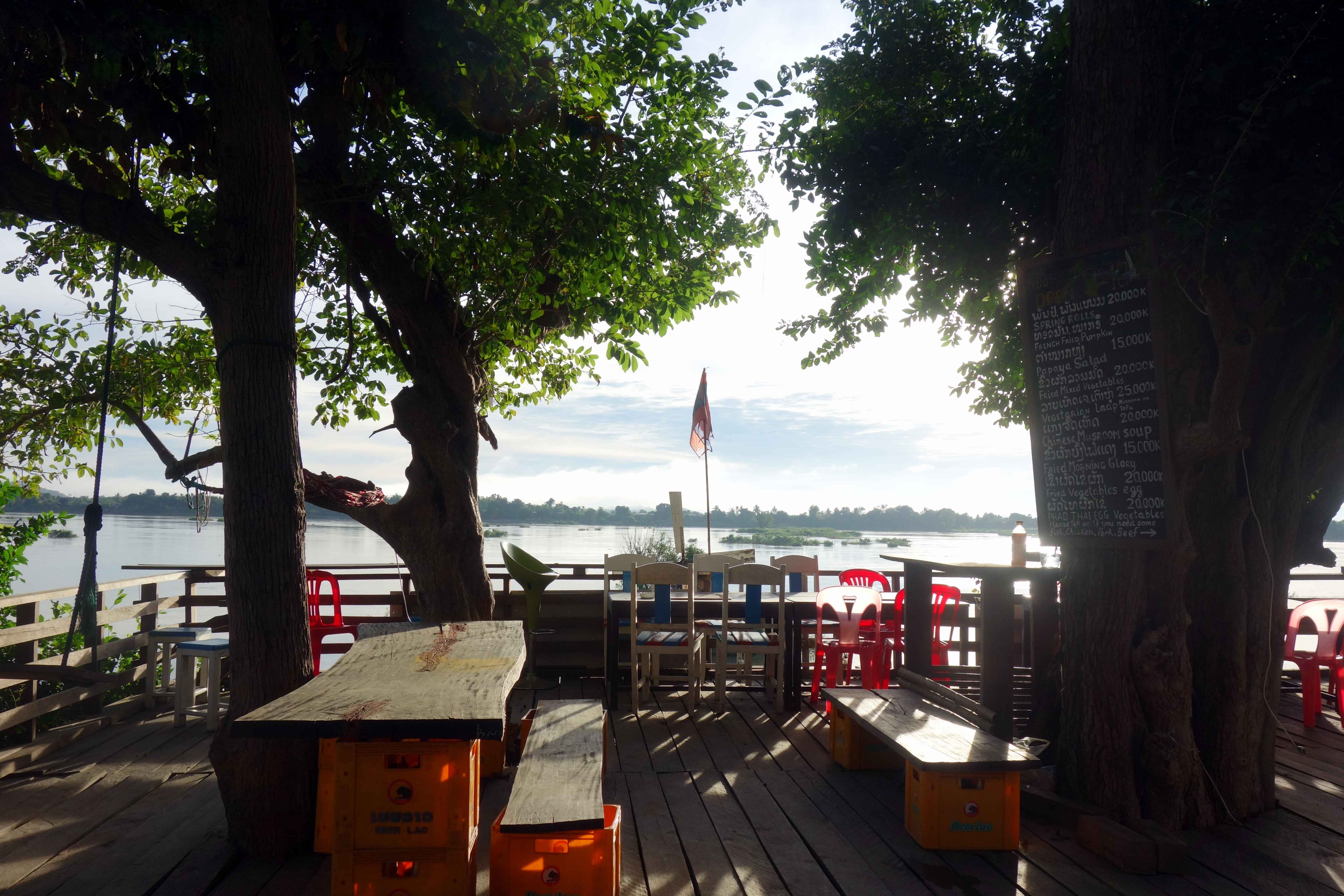 L’heure du déjeuner arrive vite, vers 11:30. Ensuite, c’est à nouveau hamac, lecture, repos… Ha oui !! J’ai oublié, on n’a pas la wifi chez Khamla, alors on redécouvre les contacts humains non interrompus et … ça fait du bien ! Bon forcément, du coup, on se fait des expéditions wifi dans les restaurants du village. (D’ailleurs on finira par se faire interdire de wifi les derniers jours car ils considèrent qu’un café ou qu’un fruit shake ce n’est pas assez pour utiliser la wifi !! Tant pis, on finira la semaine sans connexion et on ne le vit pas plus mal).