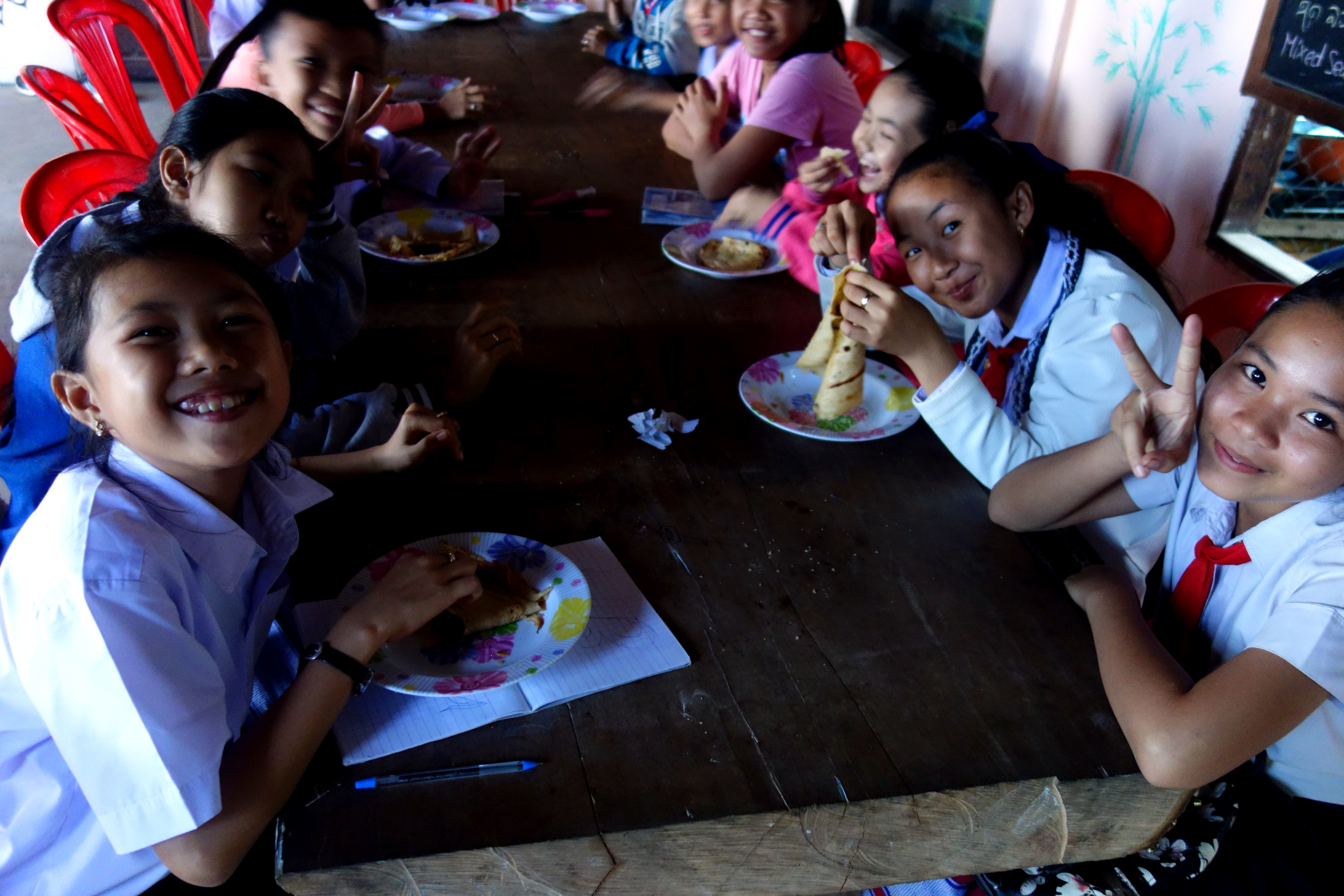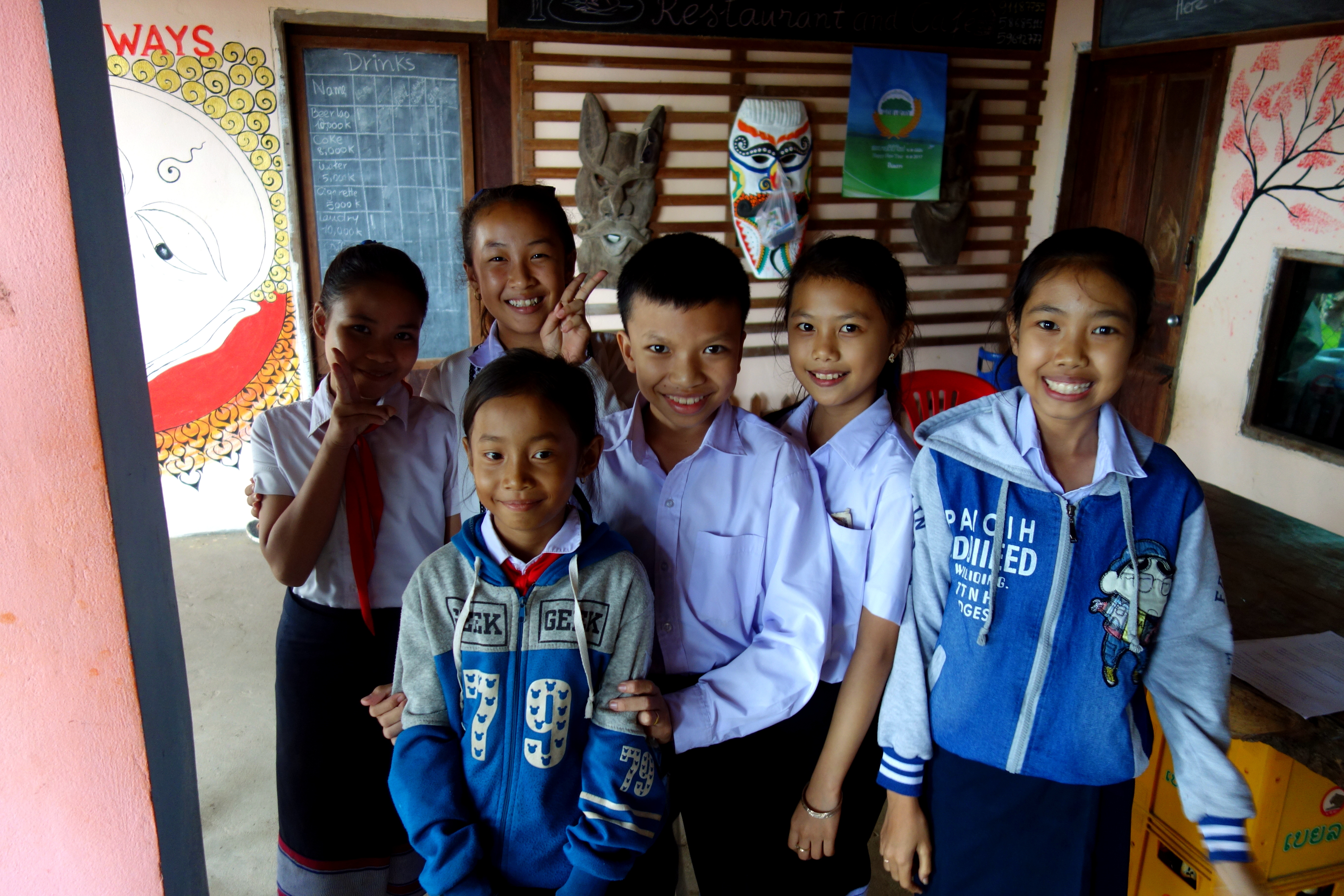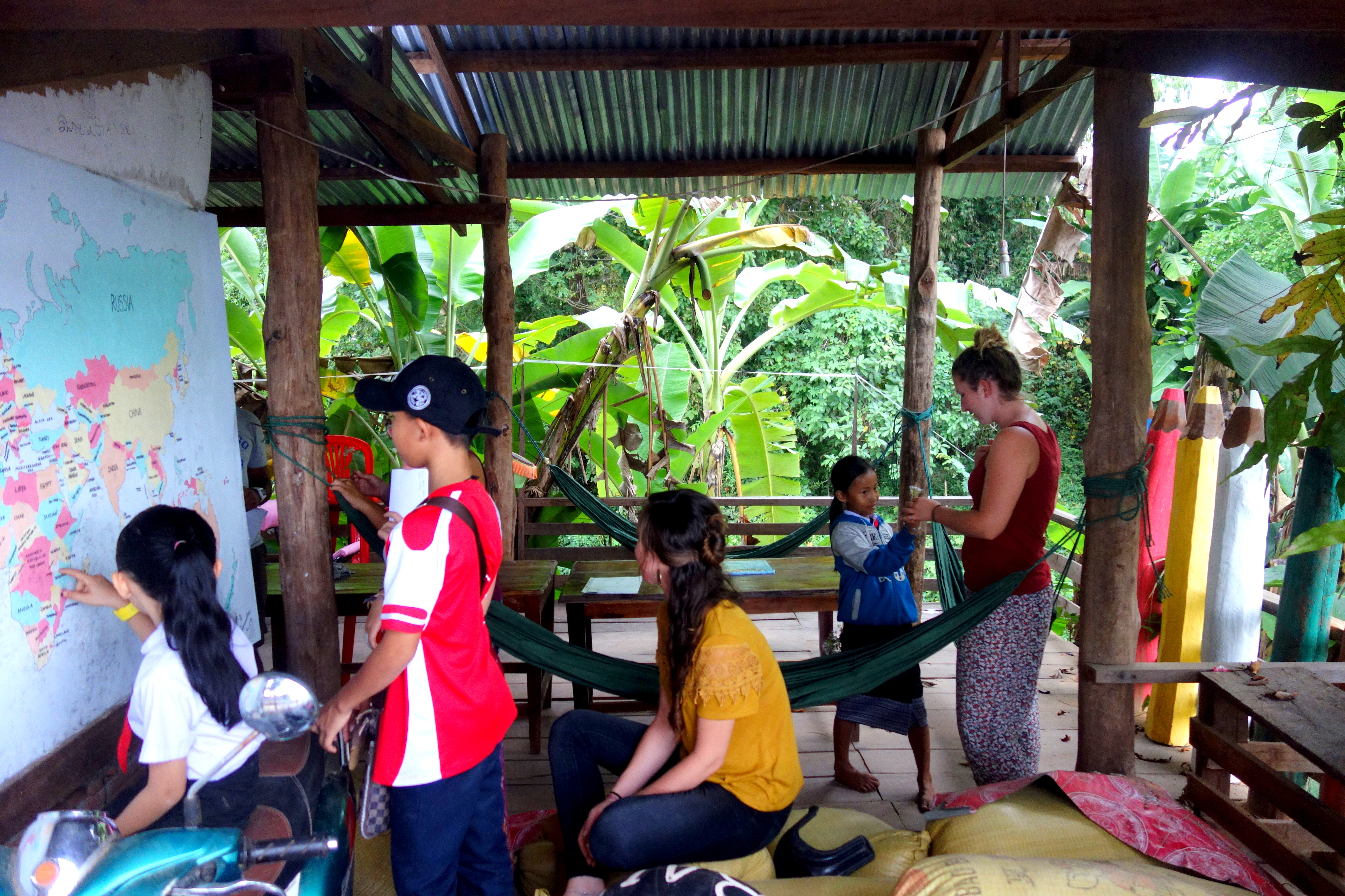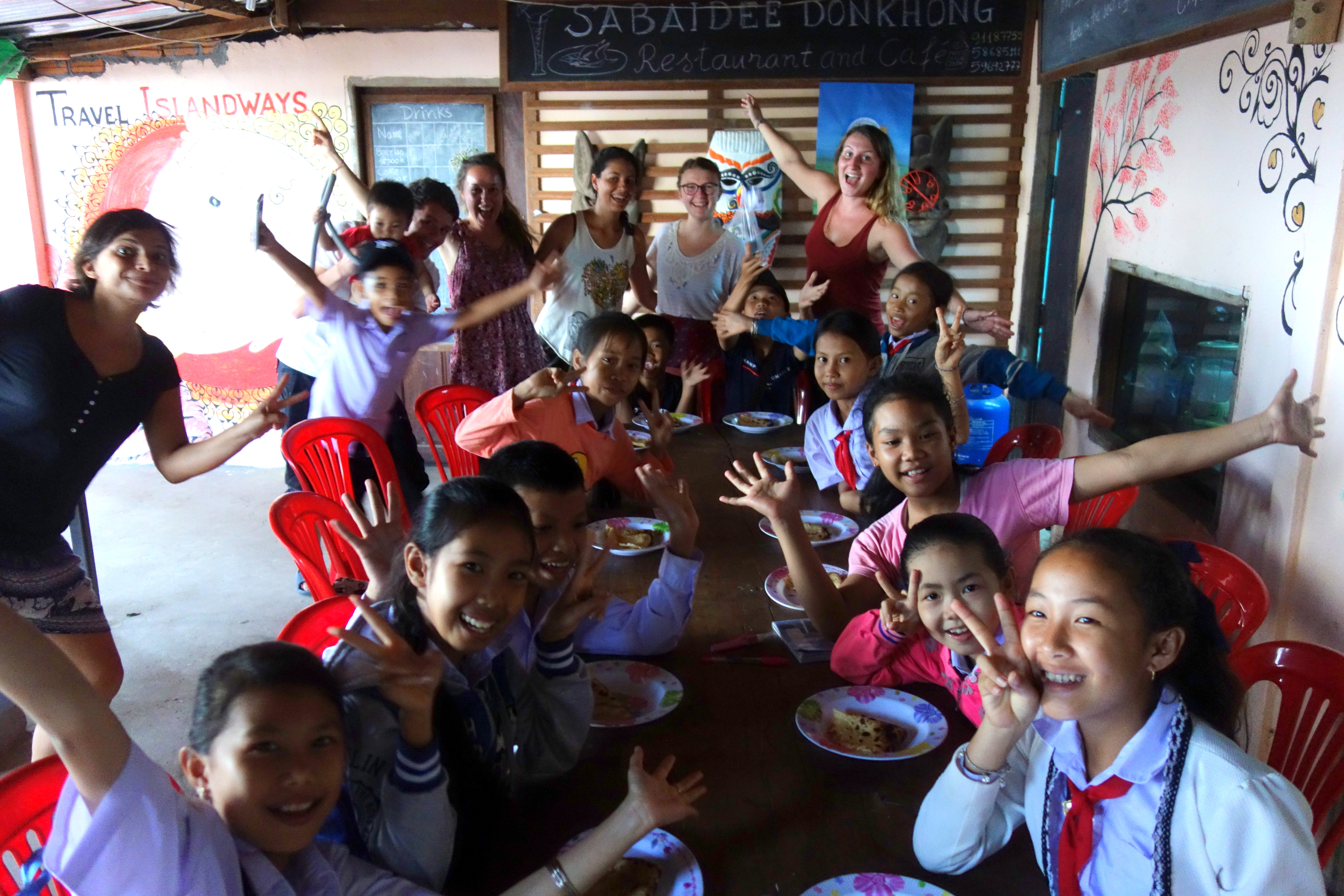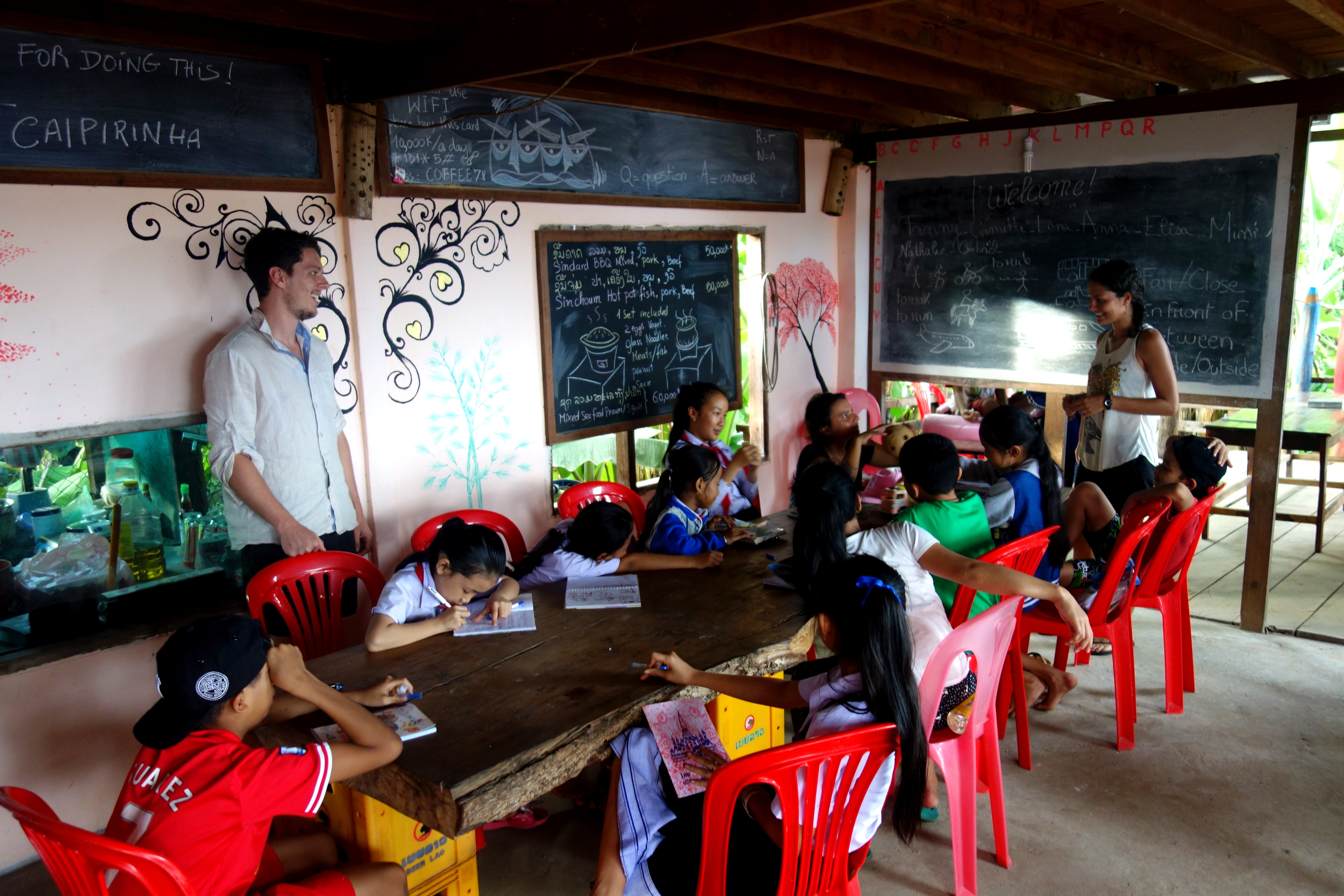 Le projet est simple, des volontaires du monde entier (bon ok, BEAUCOUP de Français, mais normal : on est au Laos !!) viennent pour au moins 1 semaine ou 10 jours enseigner l’anglais 1 à 2 heures par jour aux enfants du village. L’école se situe juste à côté du restaurant qui sert de lieu pour les cours du soir. En échange d’une petite contribution, on est logés et nourris. L’île de Don Khong n’est absolument pas touristique, donc dès qu’on se promène les locaux nous demandent “Khamla Khamla ?!” Euh oui oui, on reste chez Khamla… c’est une petite île et les nouvelles vont vite !