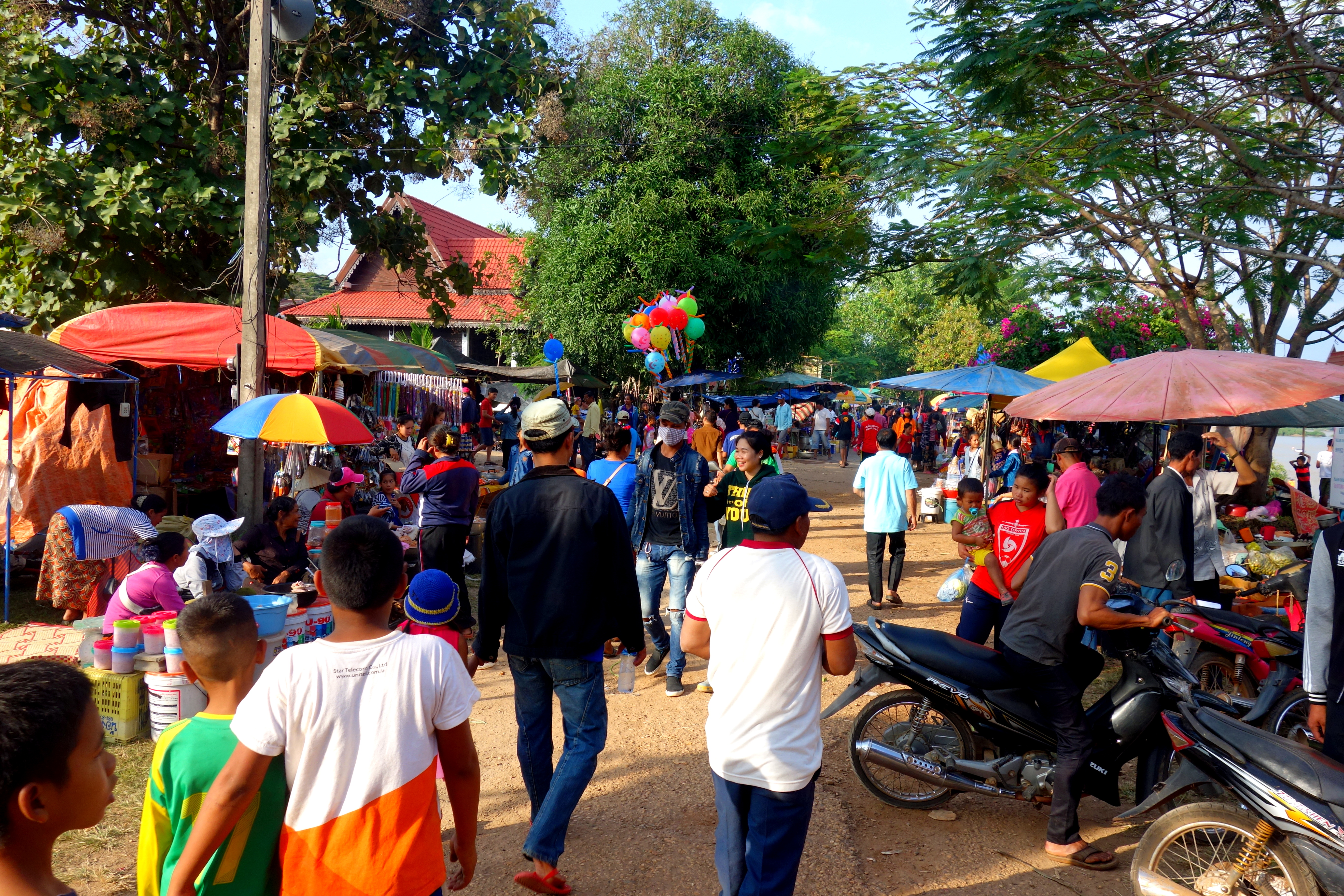 Pour l’occasion, une ÉNORME foire s’installe dans le petit village de Muang Khong. Il y a peut être 150 ou 200 exposants ! Quand je suis arrivée, je n’avais pas encore vu l’île “dans son état normal” et les volontaires présents me disent que c’est hallucinant de voir toute cette agitation alors qu’en tant normal il n’y a RIEN. J’ai dû mal à y croire…