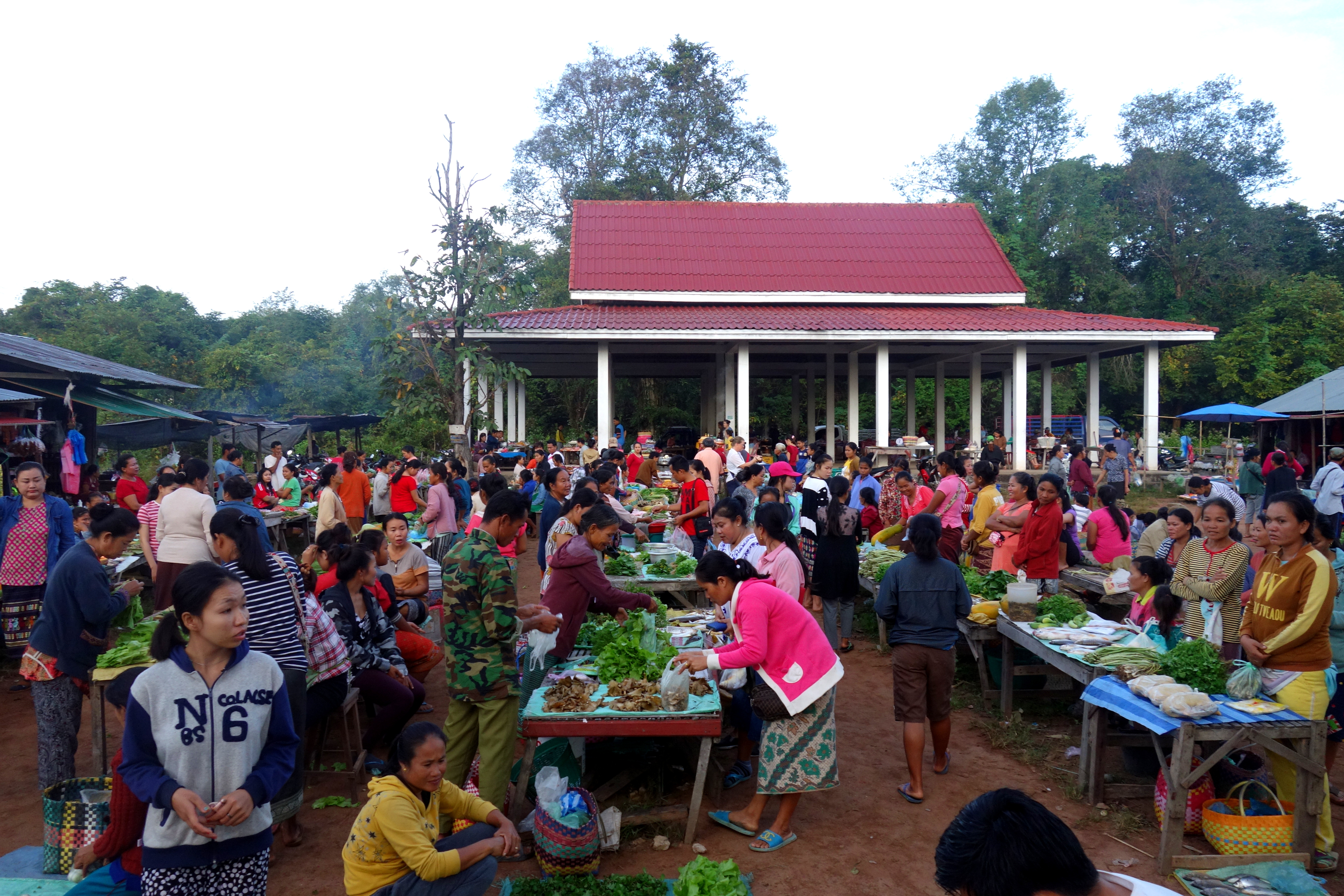 Un matin, avec Anna, on se motive à aller au marché qui a lieu de 5h à 7h. On veut absolument acheter des fruits !! Avant de partir, on demande à Vien si elle a besoin de quelque chose, elle nous demande 1kg de porc, ok pas de soucis ! On décide de partir à 6h, il y a 2km à faire. On demande à tout le monde sur la route par quelles routes passer, tous les panneaux sont écrits en Lao. On finit par arriver, le marché est plus grand que ce à quoi on s’attendait ! Il y a un seul stand de fruits, donc bon, on est un peu frustrées. Vient le moment d’acheter la viande, personne ne parle anglais, c’est pas gagné !!! Et là, un vieux monsieur s’approche de nous et demande “vous êtes françaises ?”. Il nous avoue ne pas avoir parler français depuis 20 ans et pourtant, il parle couramment ! Il est très gentil, nous pose plein de questions et propose de nous aider à faire nos courses, PAR-FAIT !