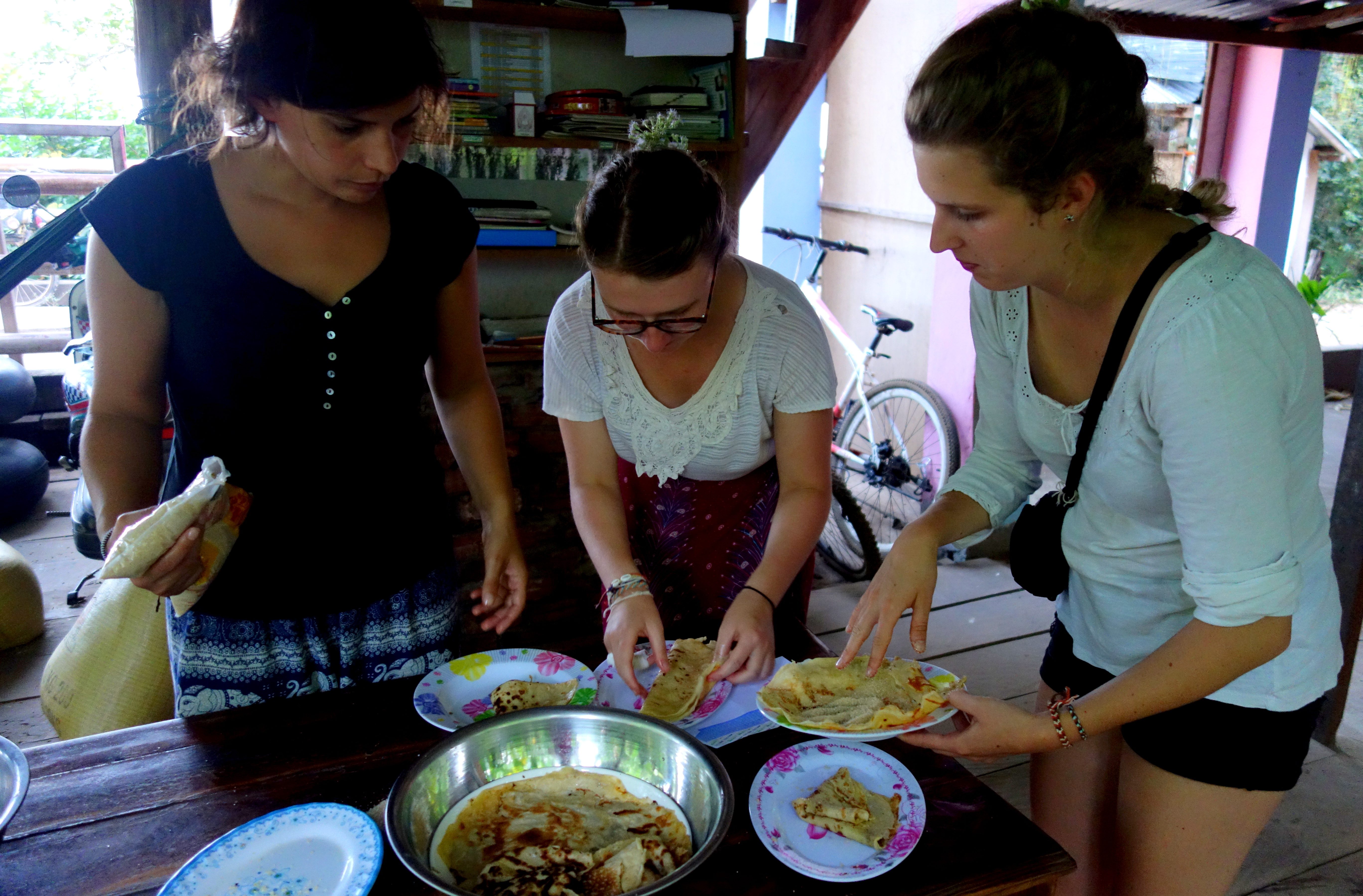 Enfin, le dernier jour, avec Noémie on se porte volontaires pour faire les crêpes. Faire la pâte, ça va ! Laisser poser, pas de soucis. Puis vient le moment de faire cuire la première crêpe, Noémie n’était pas prête ! J’en avais déjà parlé lors de mes crêpes au Vietnam : ici pas de poêle Tefal, des feux qui ne chauffent pas de tous les côtés à la même puissance, un coup ça crame, un coup ça ne cuit pas, parfois ça fume ! Je retrouve assez vite le coup de main et je vous livre même le secret ….. faire de l’huile aux crêpes ! C’est la seule solution que j’ai trouvée !! 45 crêpes et 2 h plus tard, on a chaud, extrêmement chaud dans cette petite cuisine et on est épuisées mais fières d’avoir accompli notre mission ! Plus qu’à attendre les enfants pour démarrer la chasse au trésor 😉