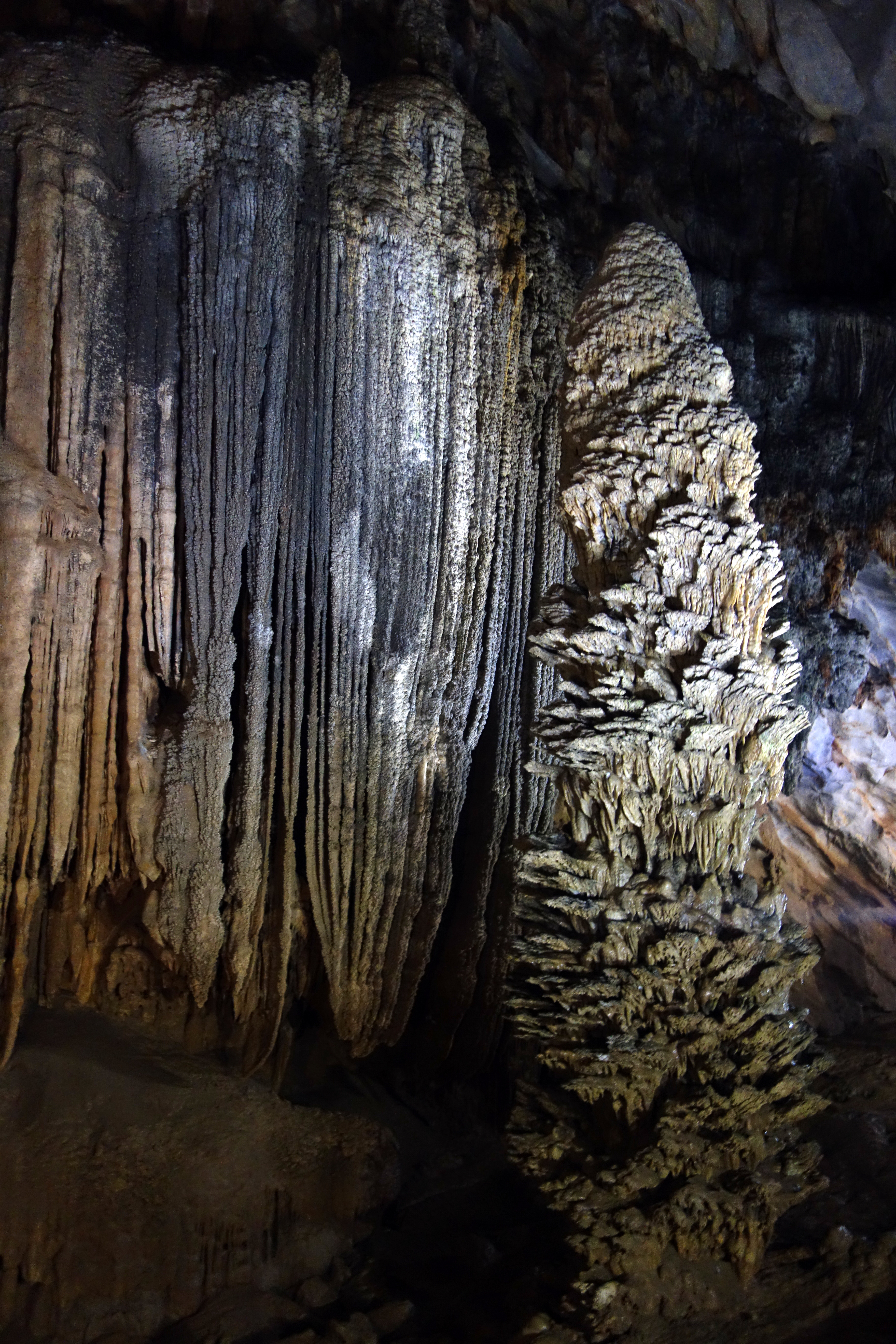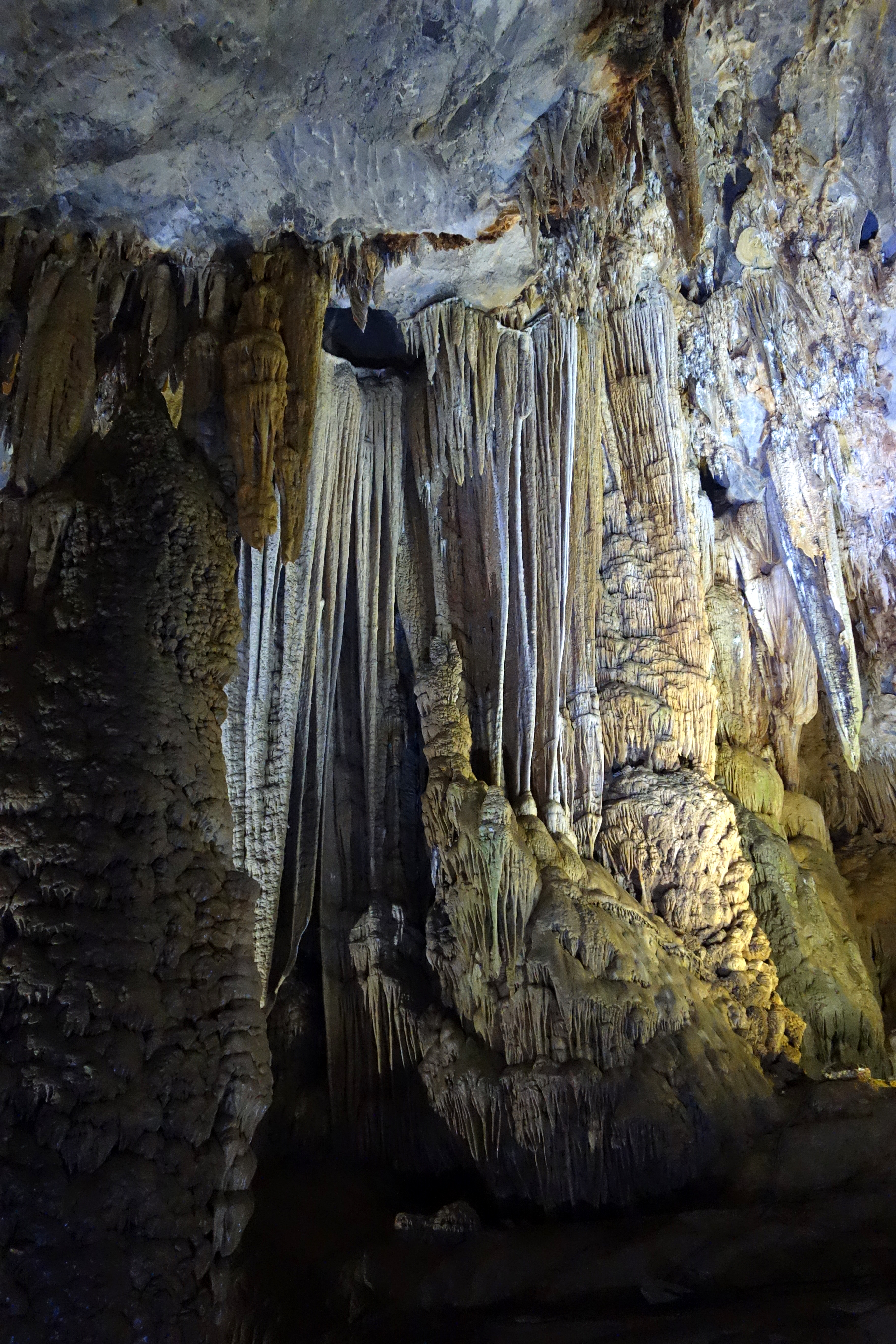 C’est très très impressionnant. À peine rentré par le petit trou de la grotte on surplombe la première “pièce”. C’est immense, gigantesque, indescriptible. A l’intérieur, il fait frais. On se promène tous la tête en l’air ne sachant où regarder tellement il y a de stalactites et stalagmites. Ça rend forcément moins bien en photo mais voici un petit aperçu :
