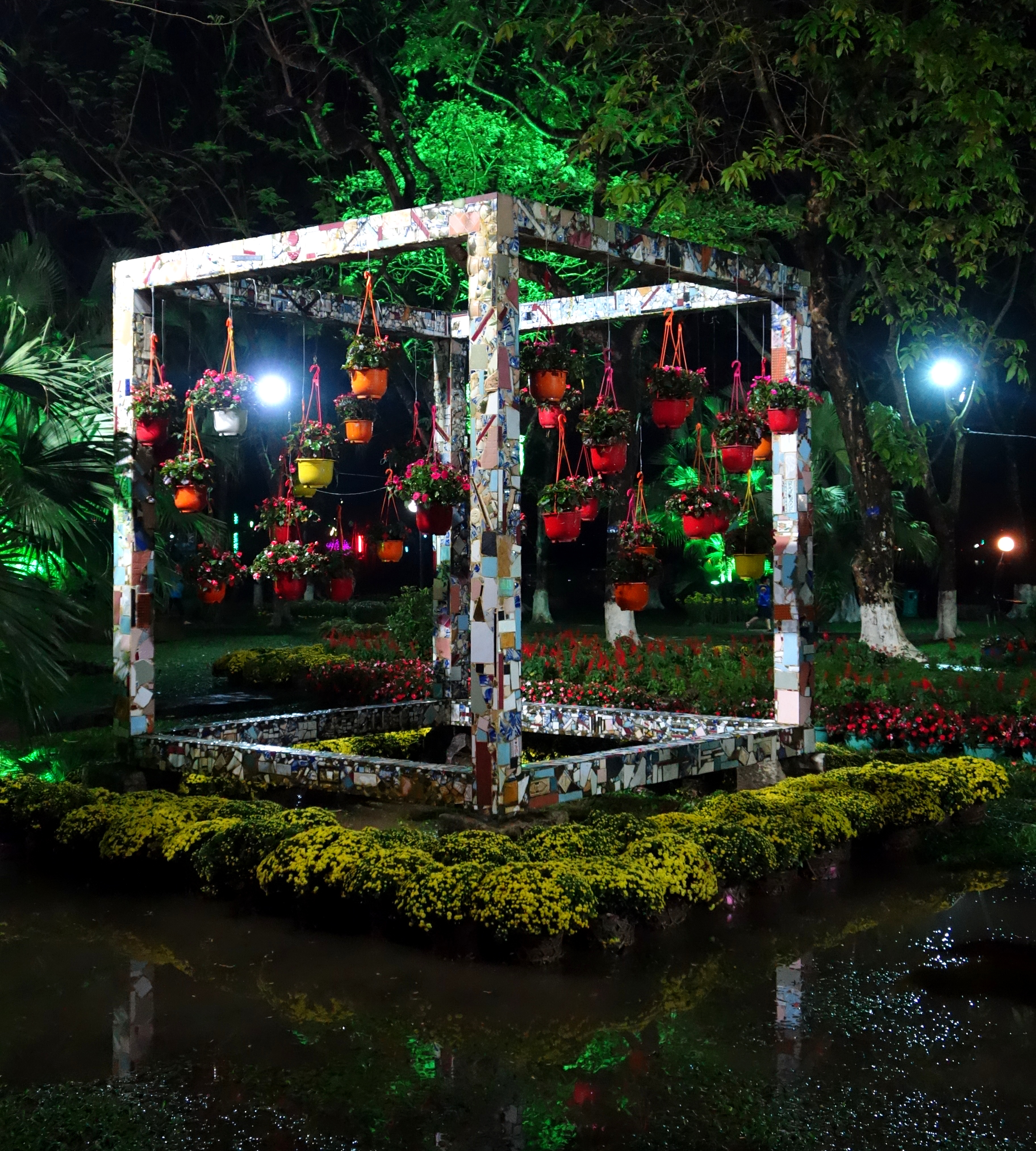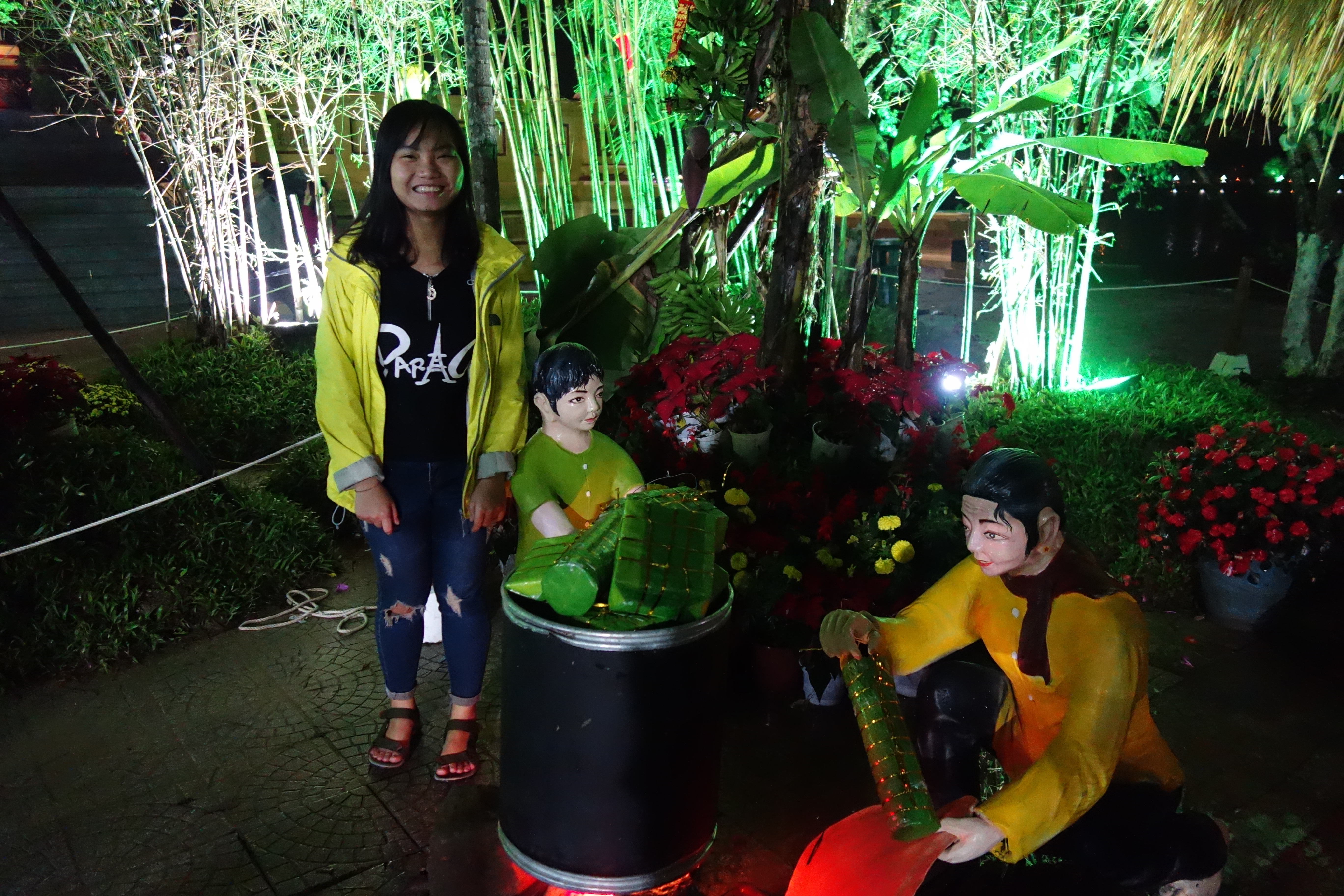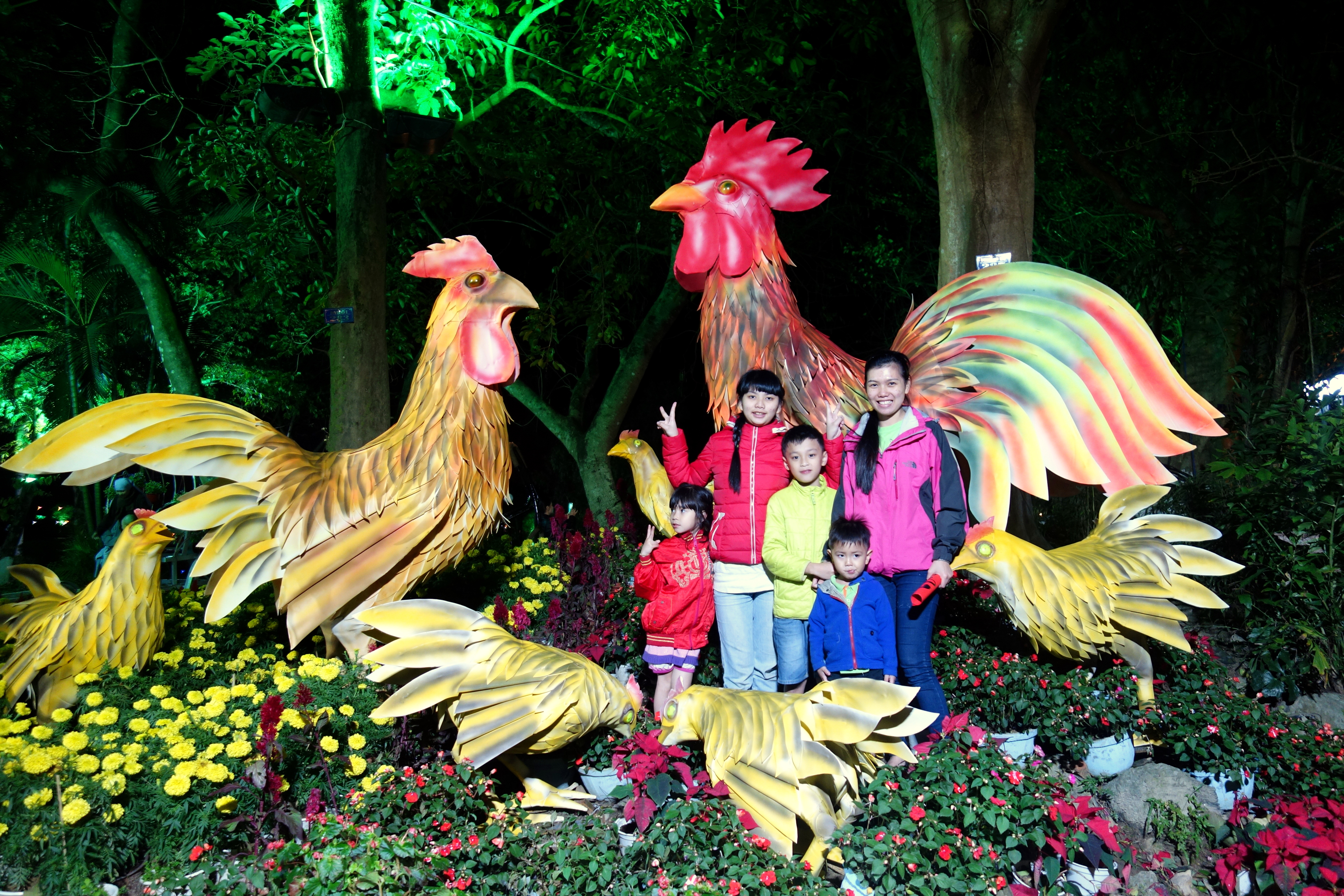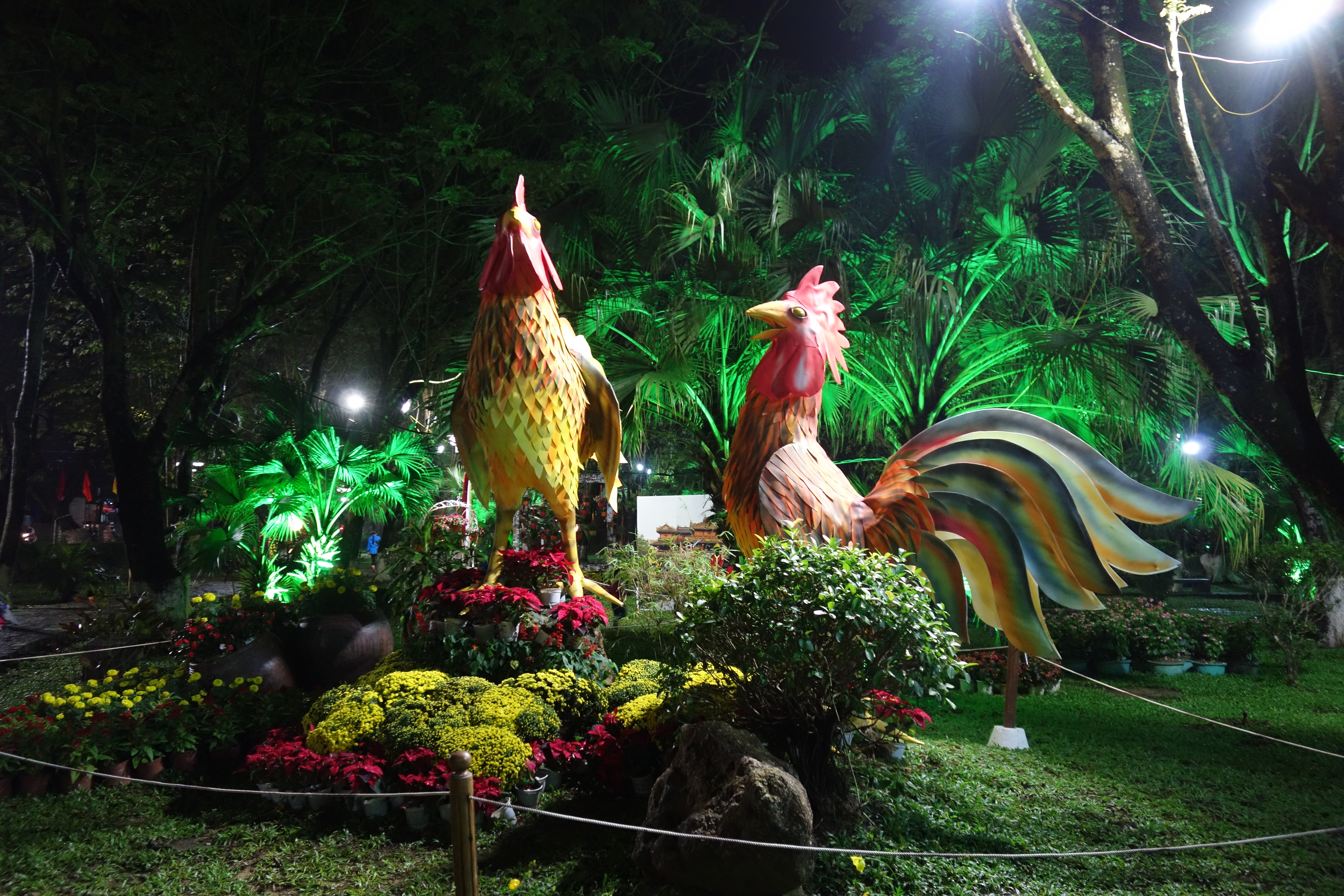 Un soir, Han, une étudiante d’anglais me propose d’aller au marché aux fleurs. J’accepte bien volontiers et suis ravie de cette petite expédition. Les fleurs sont majoritairement jaune et rouge (couleur du drapeau Viet !) et c’est une véritable attraction pour tous les vietnamiens, c’est génial de me mêler à eux et de pouvoir les observer faire leurs achats. Merci Han ! On déguste un petit dessert sucré à la coco, je ne connaissais pas mais c’est très bon ! Ensuite, on se balade dans les parcs de la ville, très décorés pour l’occasion. Des coqs géants ont été installés pour la nouvelle année … du coq !