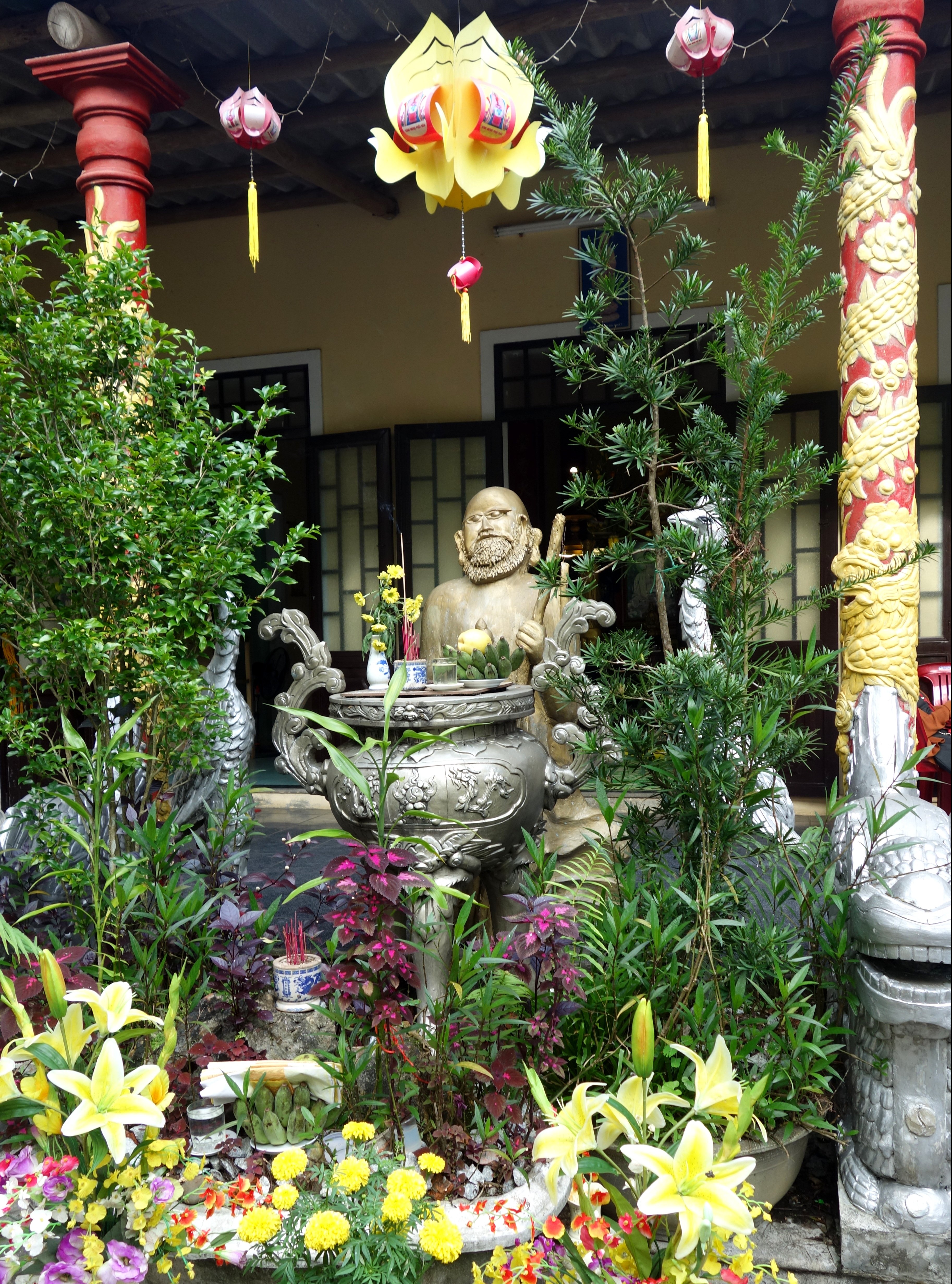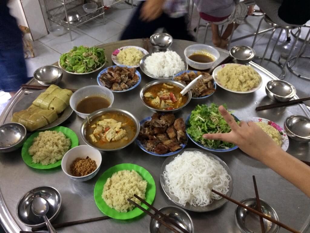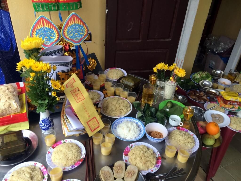 Lorsque l’on rentre chez elle, ses oncles et des amis de son père sont présents, puis, avec Giang nous partons rendre visite à son autre oncle. Tradition du Tết oblige, on fait le tour de la famille ! Nous sommes invités à rester manger et je suis gênée car ils ne me connaissent pas du tout … mais ils ont l’air ravis que je sois là. Giang sert toujours d’interprète et quand sa tante me demande quelle est ma religion, je réponds que ma famille est catholique, un sourire illumine son visage et elle me dit qu’elle aussi.