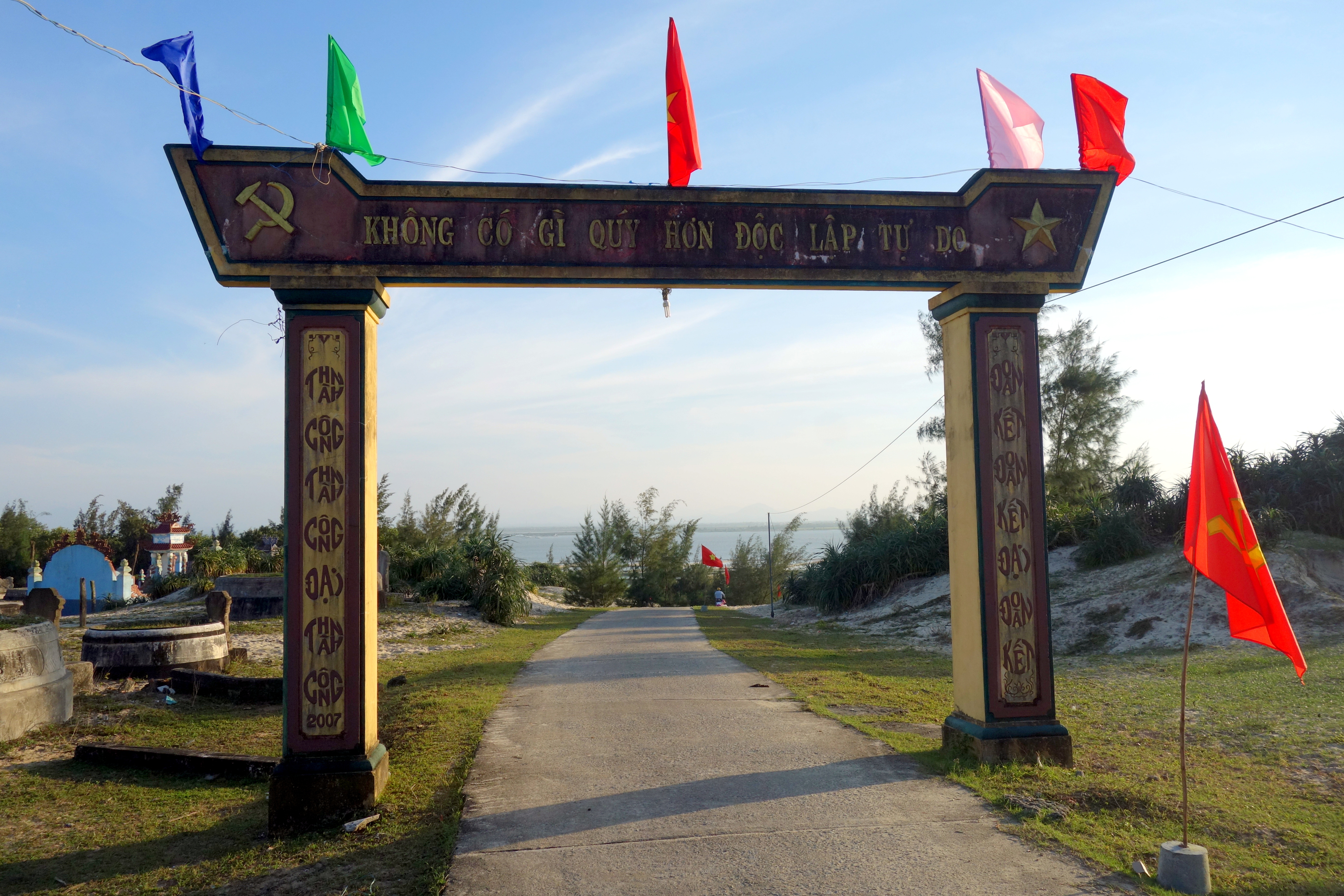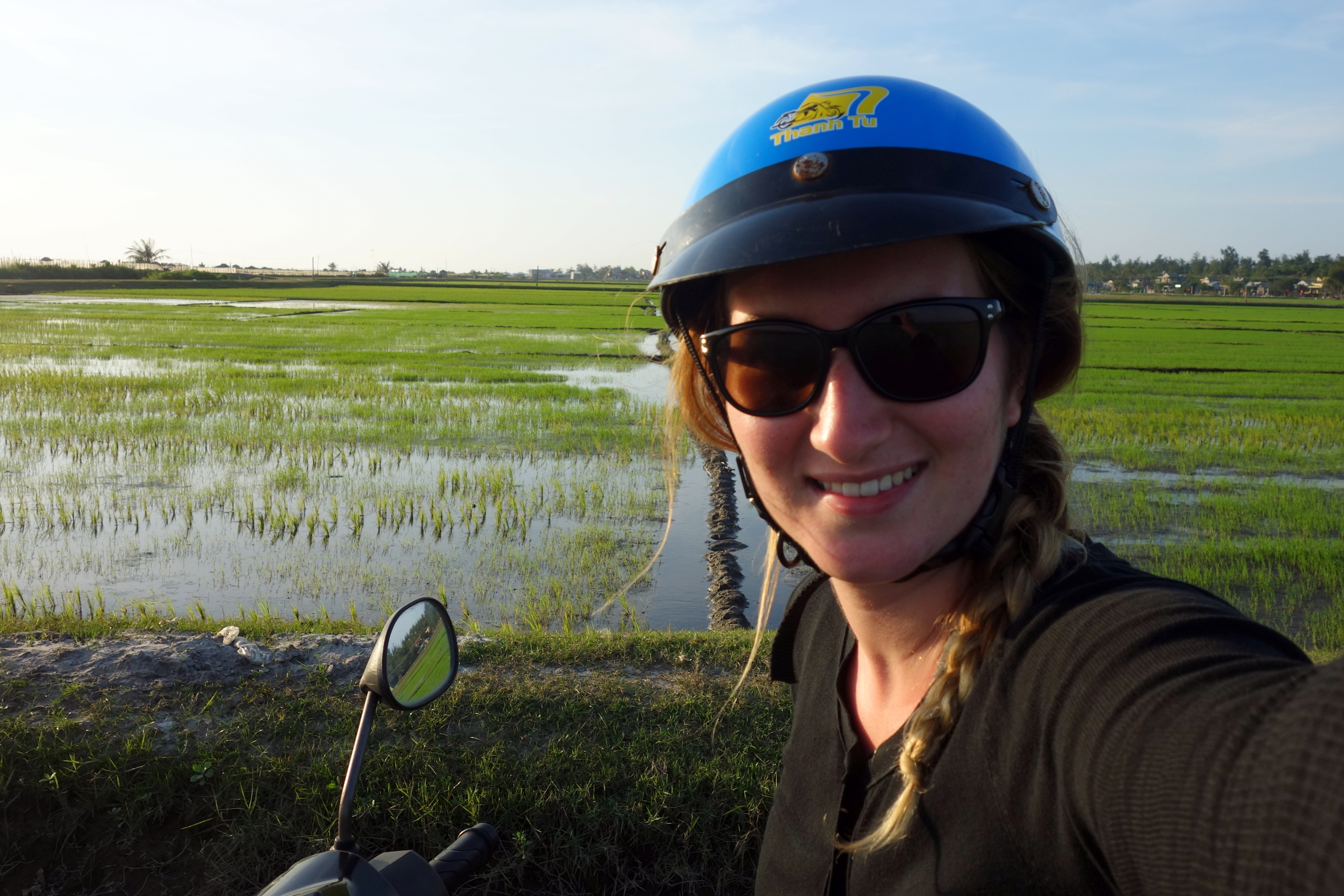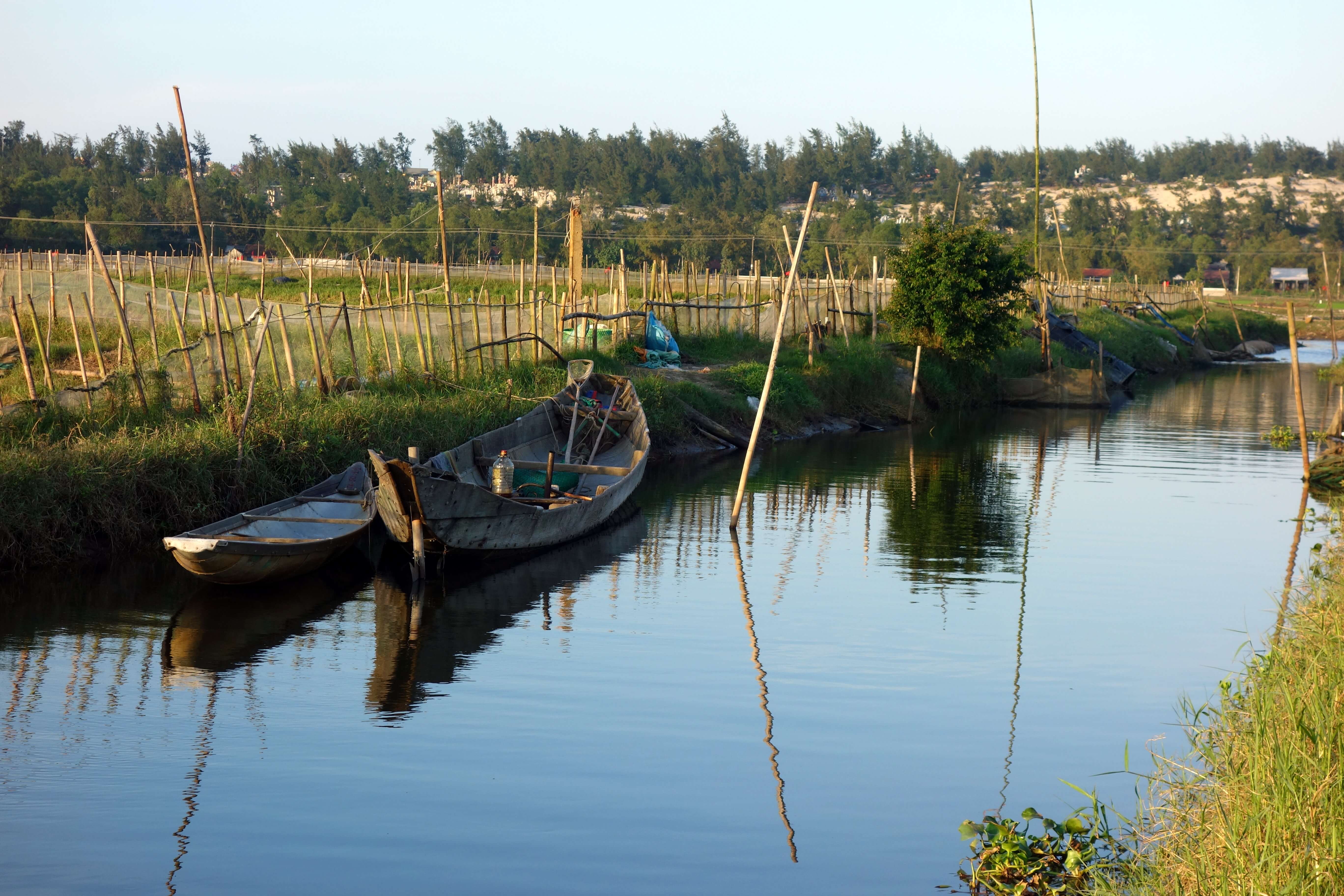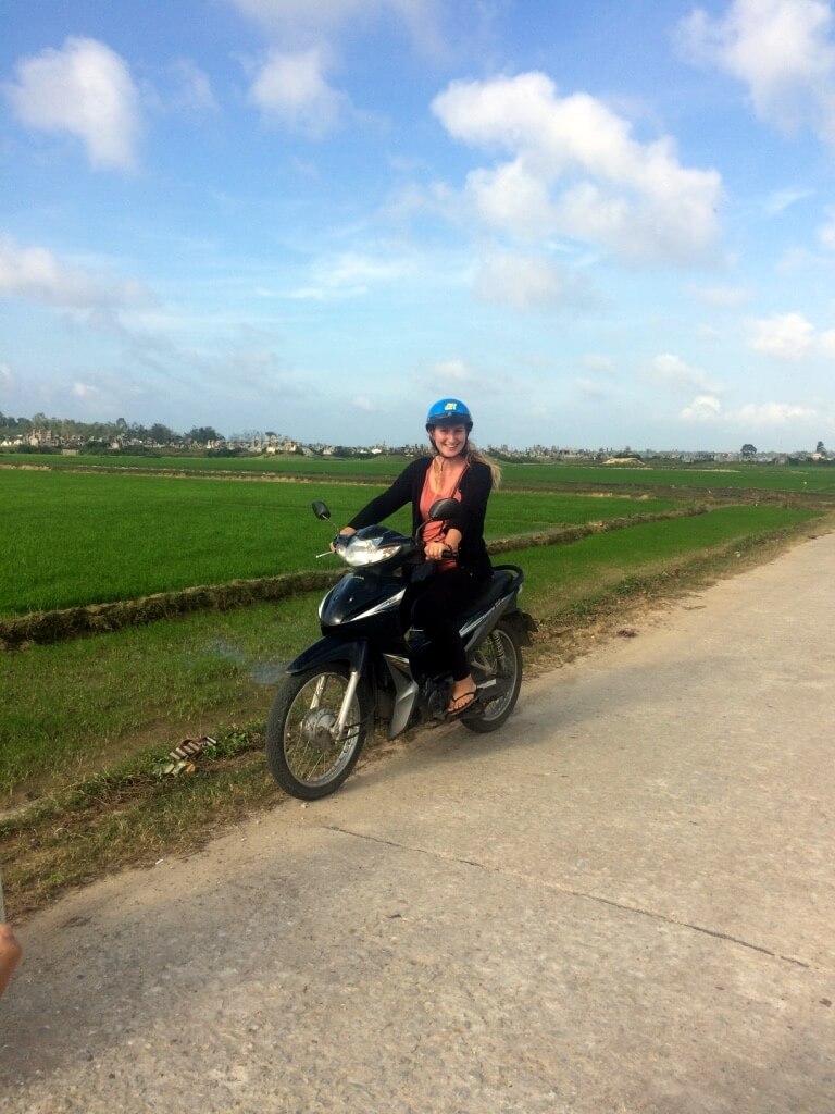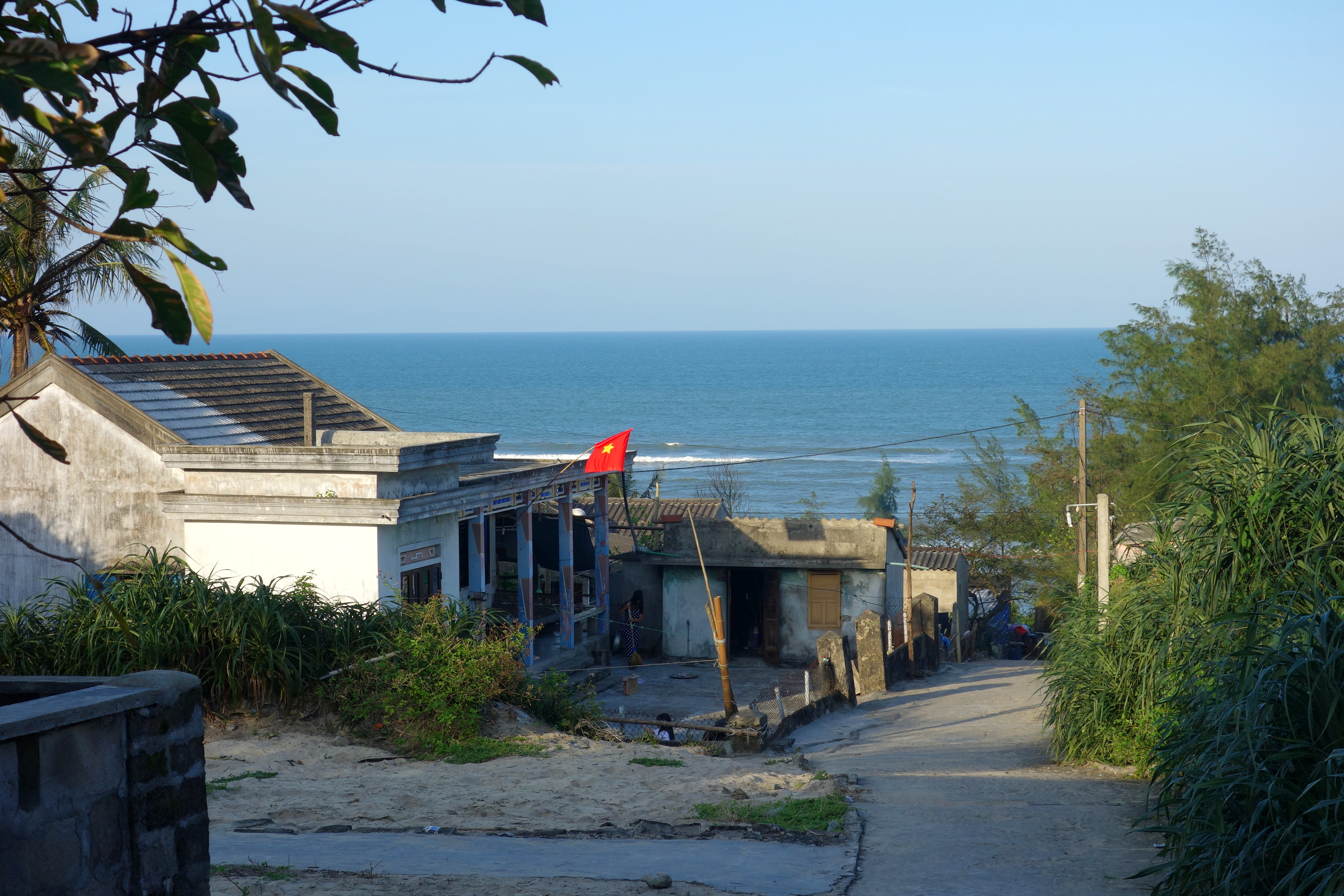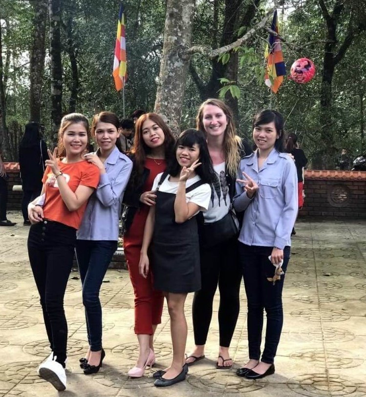 Quand les enfants rentrent dans leur famille (parents, grand parents, oncle/tante…), j’en profite pour visiter les quelques endroits restants aux alentours de Hue que je n’ai pas encore visités. Direction le lagon de Tam Giang au coucher du soleil. Je pars en scooter et admire les rizières toutes vertes. J’aperçois un chemin qui monte sur la droite et je sais que de l’autre côté de la dune se trouve la mer. Je décide d’aller voir. Arrivée en haut, il y a un petit village, je pose mon scooter et me dirige à pied vers ce qu’il me semble être la plage. Sur le chemin, un groupe d’une vingtaine de jeunes me fait coucou et crie “hello”. Je réponds pas un petit signe de la main et des sourires mais je suis vite rattrapée par un jeune homme qui m’invite à me joindre à eux. Pourquoi pas ! Je me retrouve au centre de la fête ! Le karaoké bat son plein, l’alcool coule à flot et des éclats de rire éclatent de toute part. On m’offre de la bière et à manger. Les garçons prennent des selfies et trinquent sans arrêt, je vois du coin de l’œil que les filles présentes n’apprécient pas tellement ma présence … je reprends ma route quelques instants plus tard, un sourire figé aux lèvres de cette belle expérience !