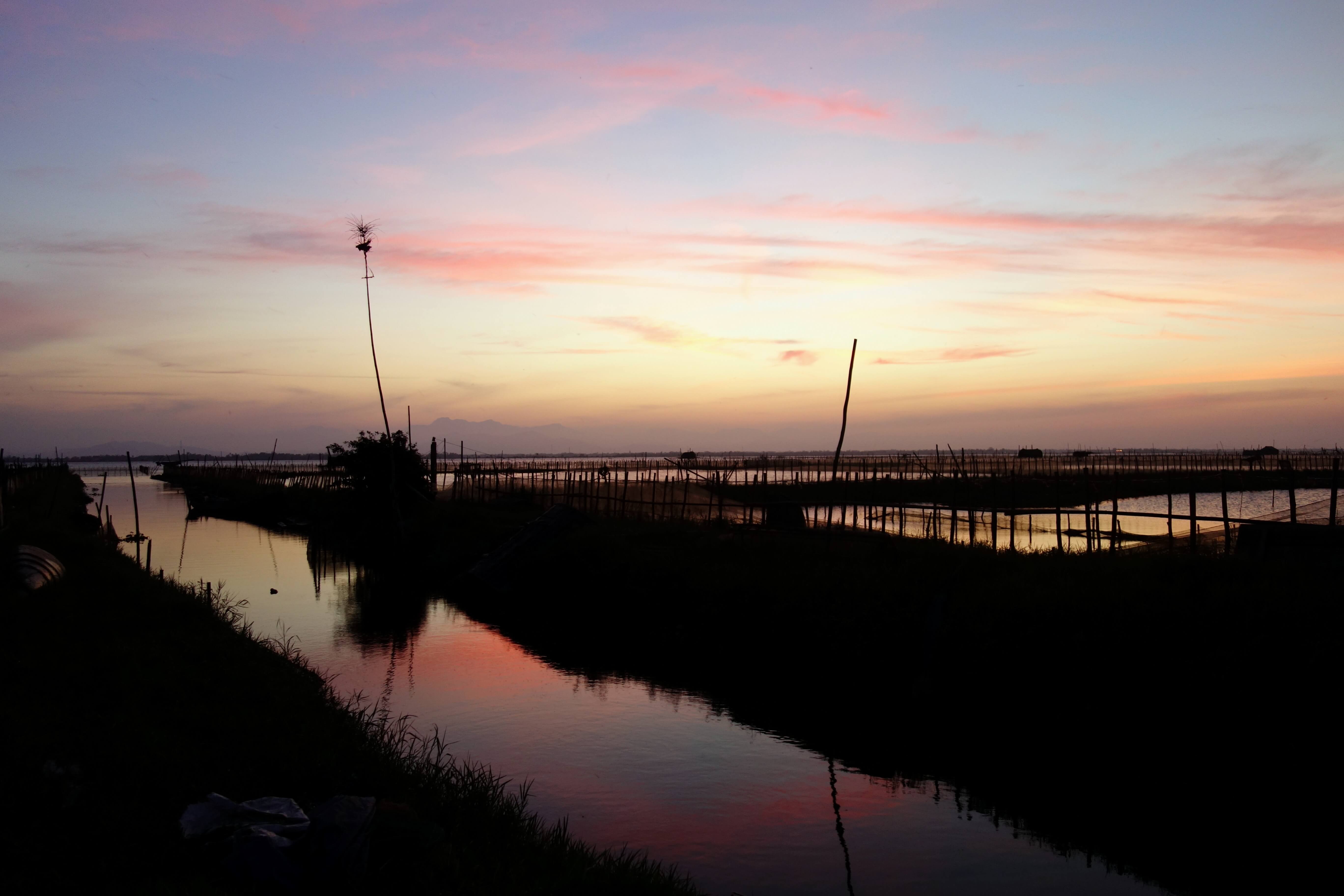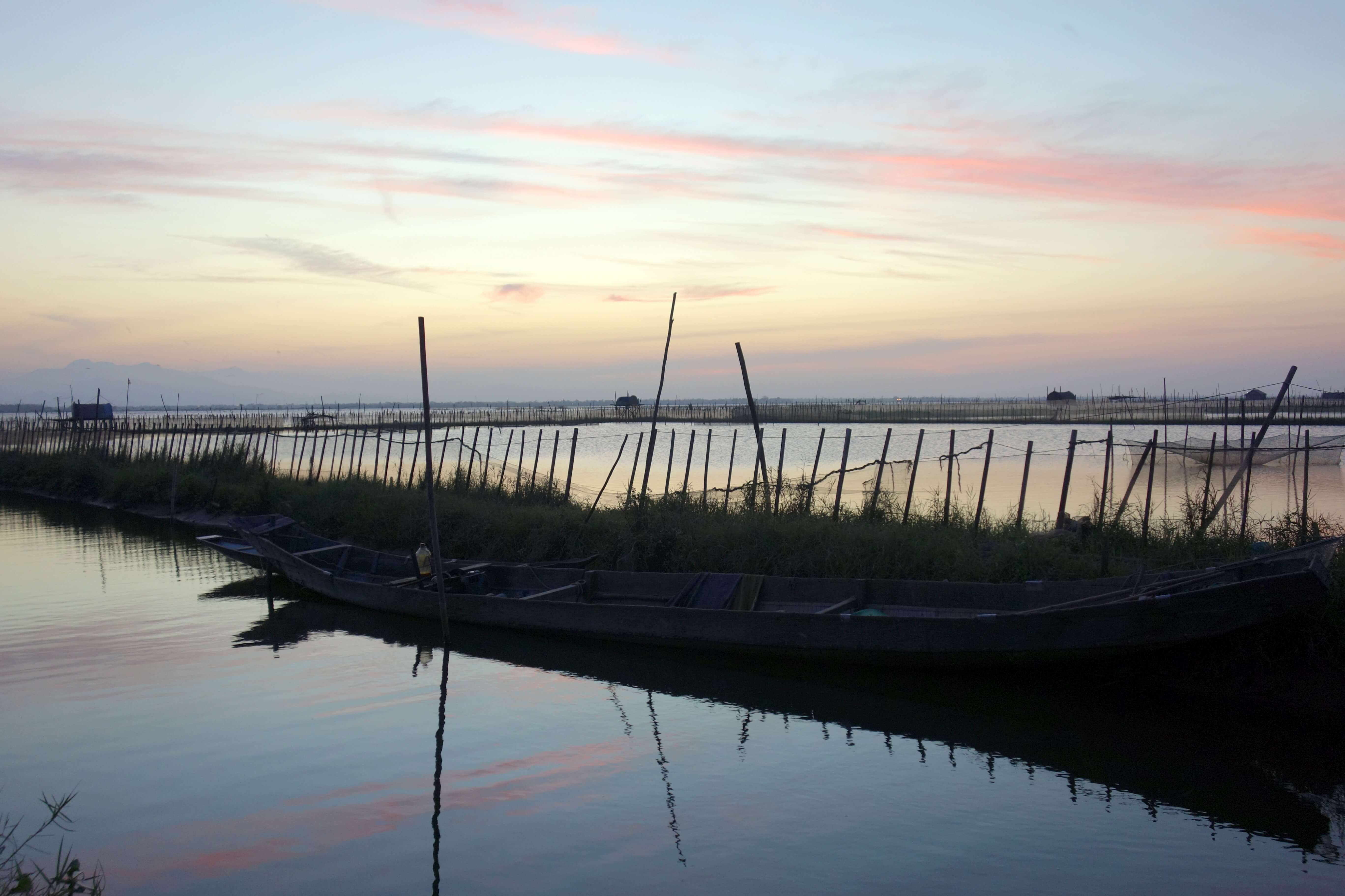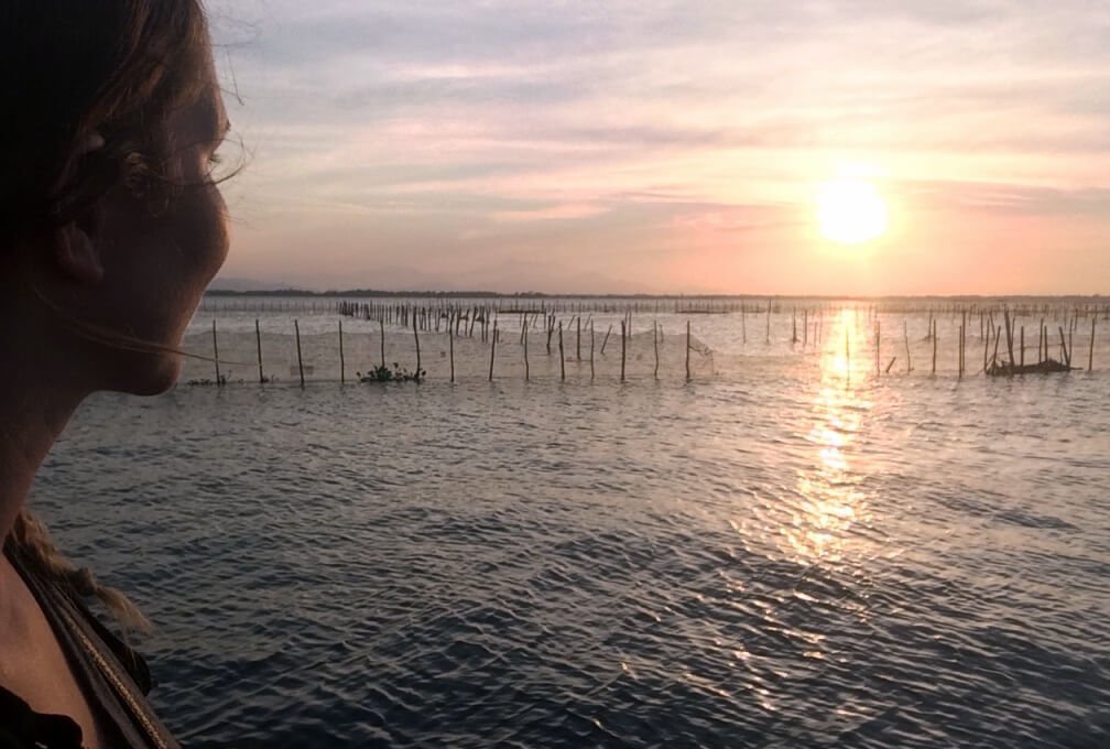 Je vais ensuite au milieu des rizières pour m’approcher de l’eau au coucher de soleil. Je roule sur un mini sentier, il y a de l’eau tout le tour, c’est pas le moment de se rater ! Au bout d’un moment, le sentier s’arrête, pour aller plus loin il y a des bateaux ou un petit pont en bambou qui enjambe un bras de rivière. Après avoir demandé l’autorisation à un pêcheur, je traverse ce petit pont et avance jusqu’au lagon. Il me reste 45 minutes avant le coucher du soleil et le sol est trop cracra pour que je puisse m’asseoir … je patiente … le coucher de soleil est beau mais je pense qu’il aurait pu être encore mieux ! Presque déçue, c’est que je deviens exigeante ! Je rentre en scoot, j’ai passé une trop bonne journée !