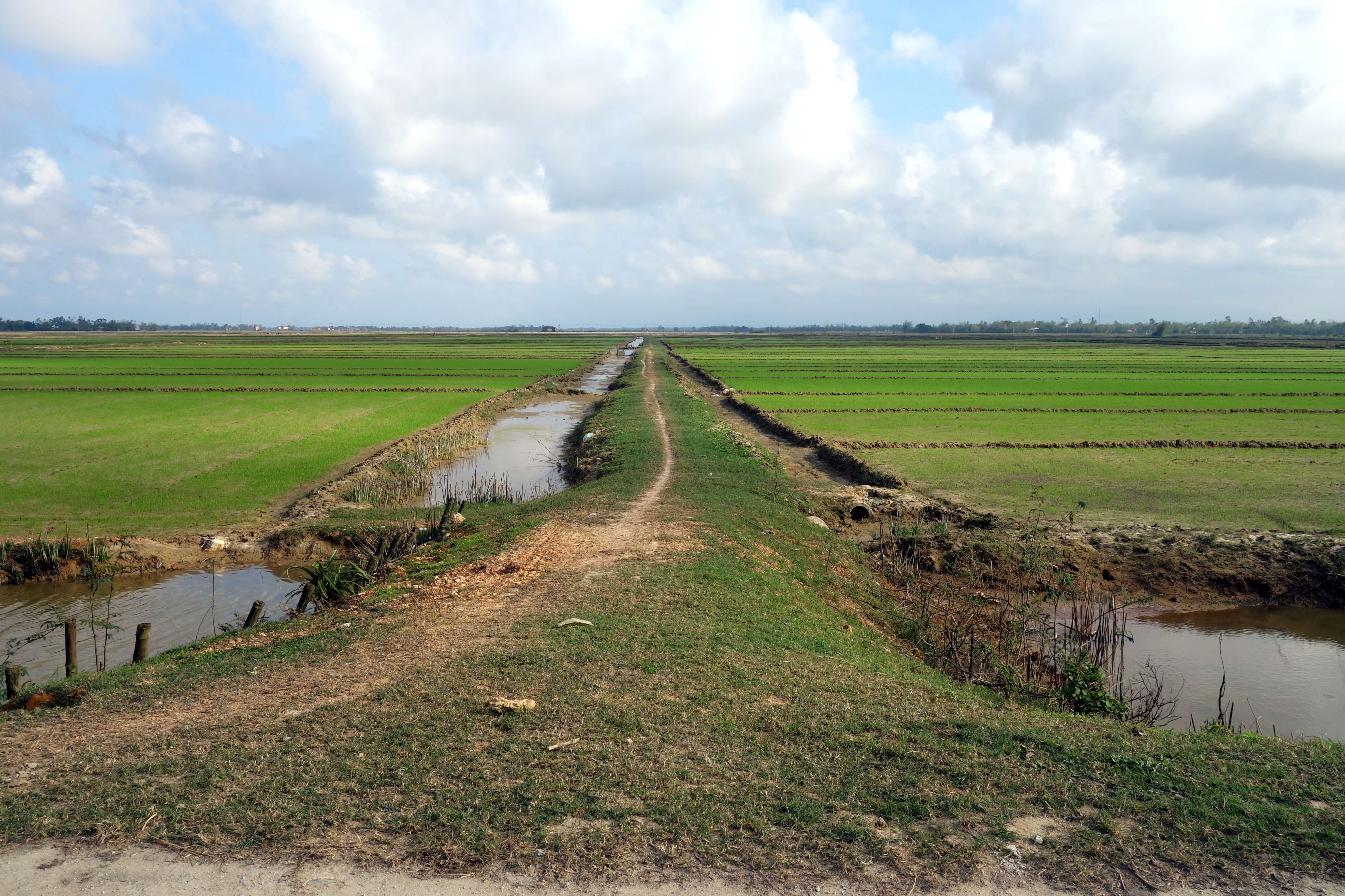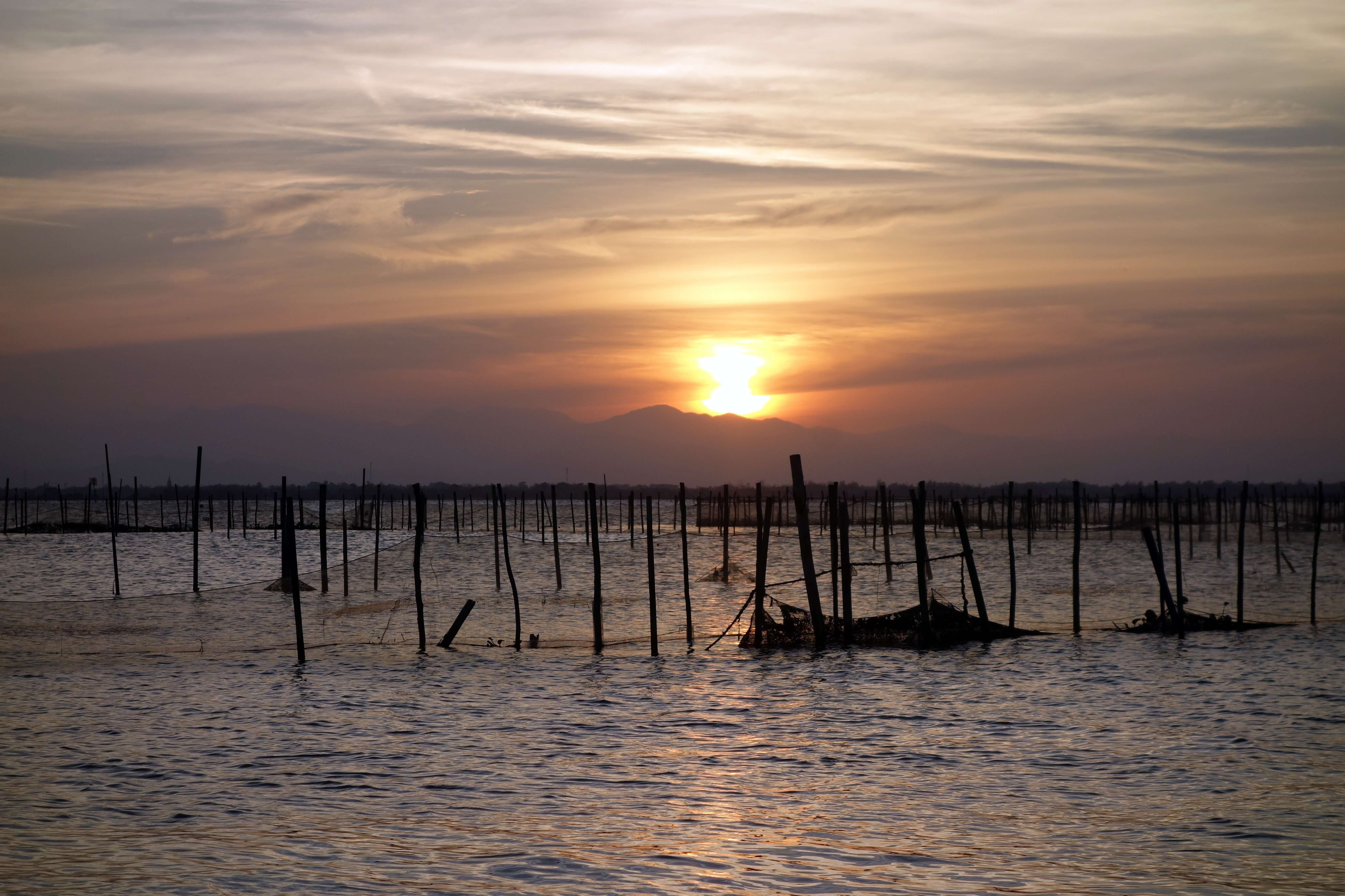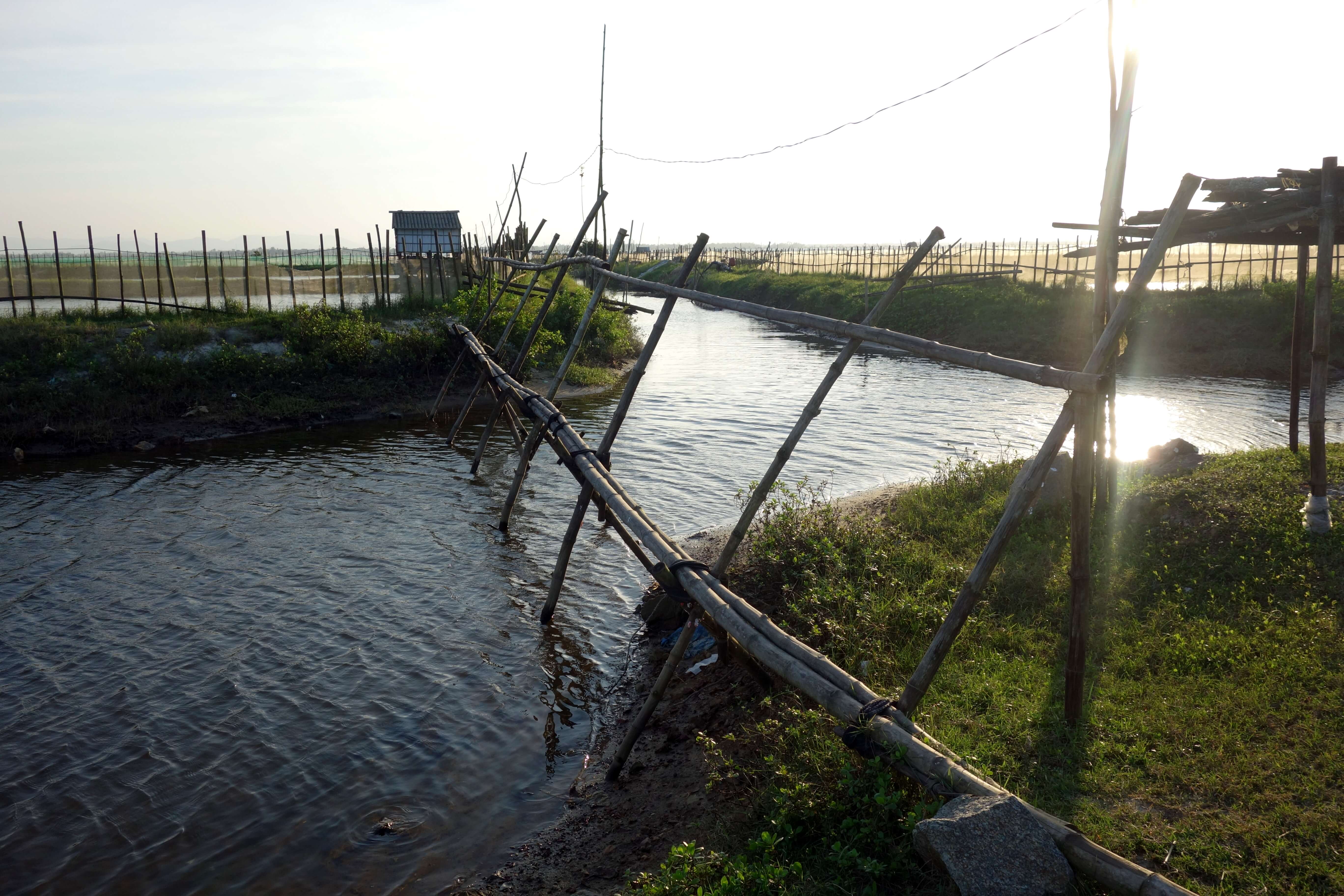 Je vais ensuite au milieu des rizières pour m’approcher de l’eau au coucher de soleil. Je roule sur un mini sentier, il y a de l’eau tout le tour, c’est pas le moment de se rater ! Au bout d’un moment, le sentier s’arrête, pour aller plus loin il y a des bateaux ou un petit pont en bambou qui enjambe un bras de rivière. Après avoir demandé l’autorisation à un pêcheur, je traverse ce petit pont et avance jusqu’au lagon. Il me reste 45 minutes avant le coucher du soleil et le sol est trop cracra pour que je puisse m’asseoir … je patiente … le coucher de soleil est beau mais je pense qu’il aurait pu être encore mieux ! Presque déçue, c’est que je deviens exigeante ! Je rentre en scoot, j’ai passé une trop bonne journée !