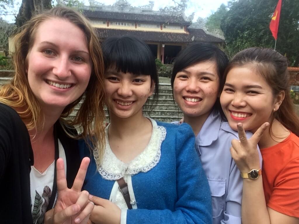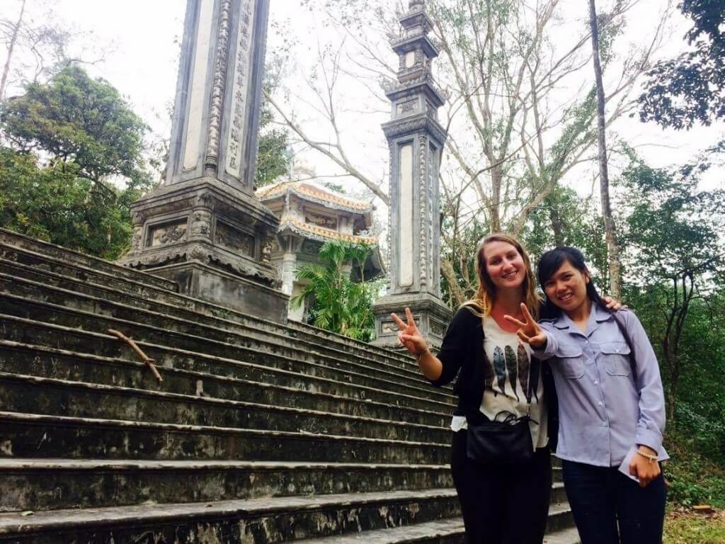 Ma prochaine destination est Dong Hoi pour rendre visite à Trin avec qui je dois travailler au Homestay. C’est à 2 heures de Dong Ha. La maman de Giang décide de m’arrêter un bus. Elle se met au bord du trottoir, face à la 2×2 voies sous son parapluie et arrête tous les bus qui passent. Certains ne vont pas au bon endroit, d’autres arrivent trop vite et doivent faire une marche arrière pour revenir à notre hauteur, certains sont déjà pleins, certains sont trop chers, pas assez bien…. à un moment donné, il y a 3 bus arrêtés en même temps ! On prend toute la largeur de la route ! (Enfin on, vous comprendrez bien que je n’avais pas mon mot à dire…). Puis, la maman me dit : celui-ci c’est bon, monte ! À peine le temps de crier un merci et un au revoir que le bus repartait sur les chapeaux de roues … Après 1 heure de route, le chauffeur s’approche de moi et me tend son portable, je ne comprends pas. Il me dit “your friend” je ne comprends toujours pas… Je dis un “allo ?” un peu sceptique. C’est Giang ! Sa maman voulait s’assurer que tout se passait bien et que j’étais dans la bonne direction. “Euuuh oui tout va bien, merci, il ne faut pas s’inquiéter j’arrive dans 1h !” Une famille adorable ! Je suis invitée à revenir quand je veux …