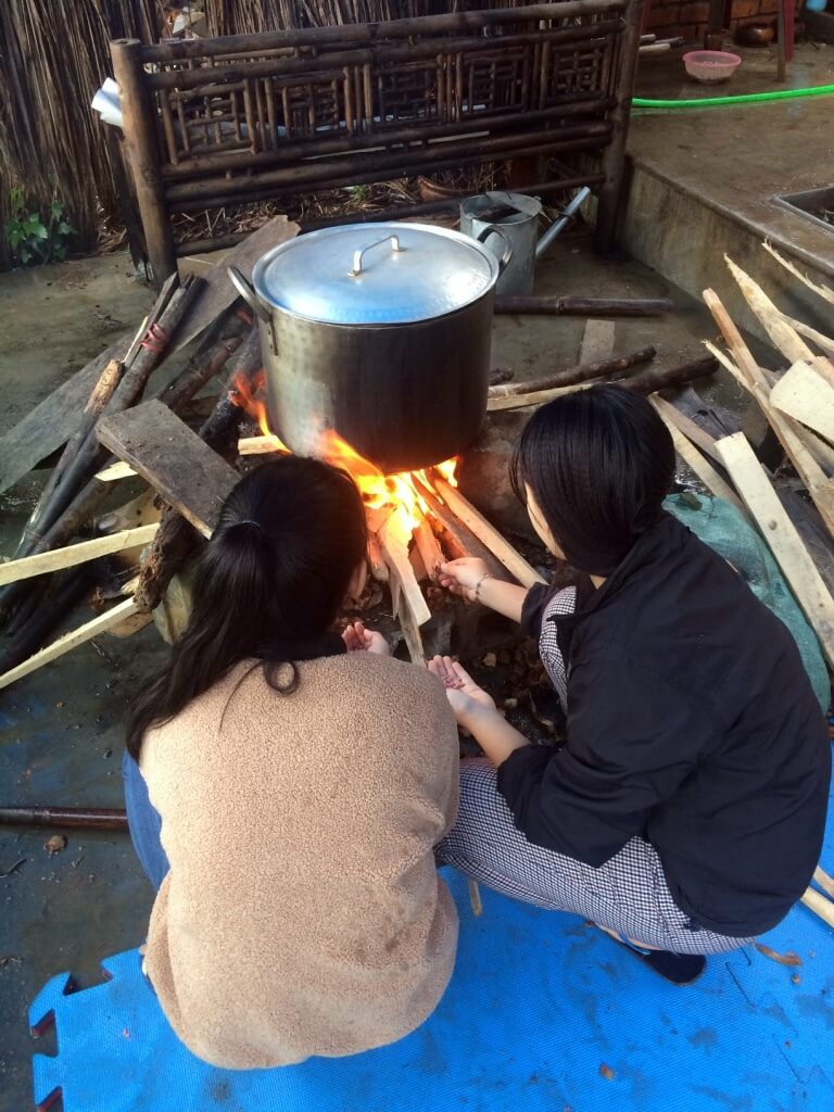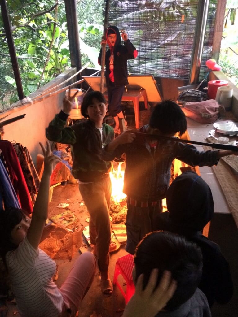 Je retrouve ensuite ma chambre à la ludothèque et les enfants à la maison des affections ! Comme toujours, c’est un grand moment de bonheur et d’émotions… Avec eux, je prépare les banh chung. De la viande enroulée dans du riz collant que l’on maintient avec des feuilles de bananiers pendant les 10h de cuisson ! Chacun se relaie au bord du feu pour surveiller qu’il ne s’éteigne pas. J’assiste également à la cérémonie du “feu”. Ils font brûler de faux-vêtements pour honorer les morts qui n’ont pas de famille. J’observe avec émerveillement l’effervescence et la bonne humeur de tout le monde, les vacances arrivent, ils vont revoir leur famille et profiter de quelques jours de repos. Chacun espère avoir des “li xi” des petites enveloppes avec de l’argent censé porter bonheur pour la nouvelle année.