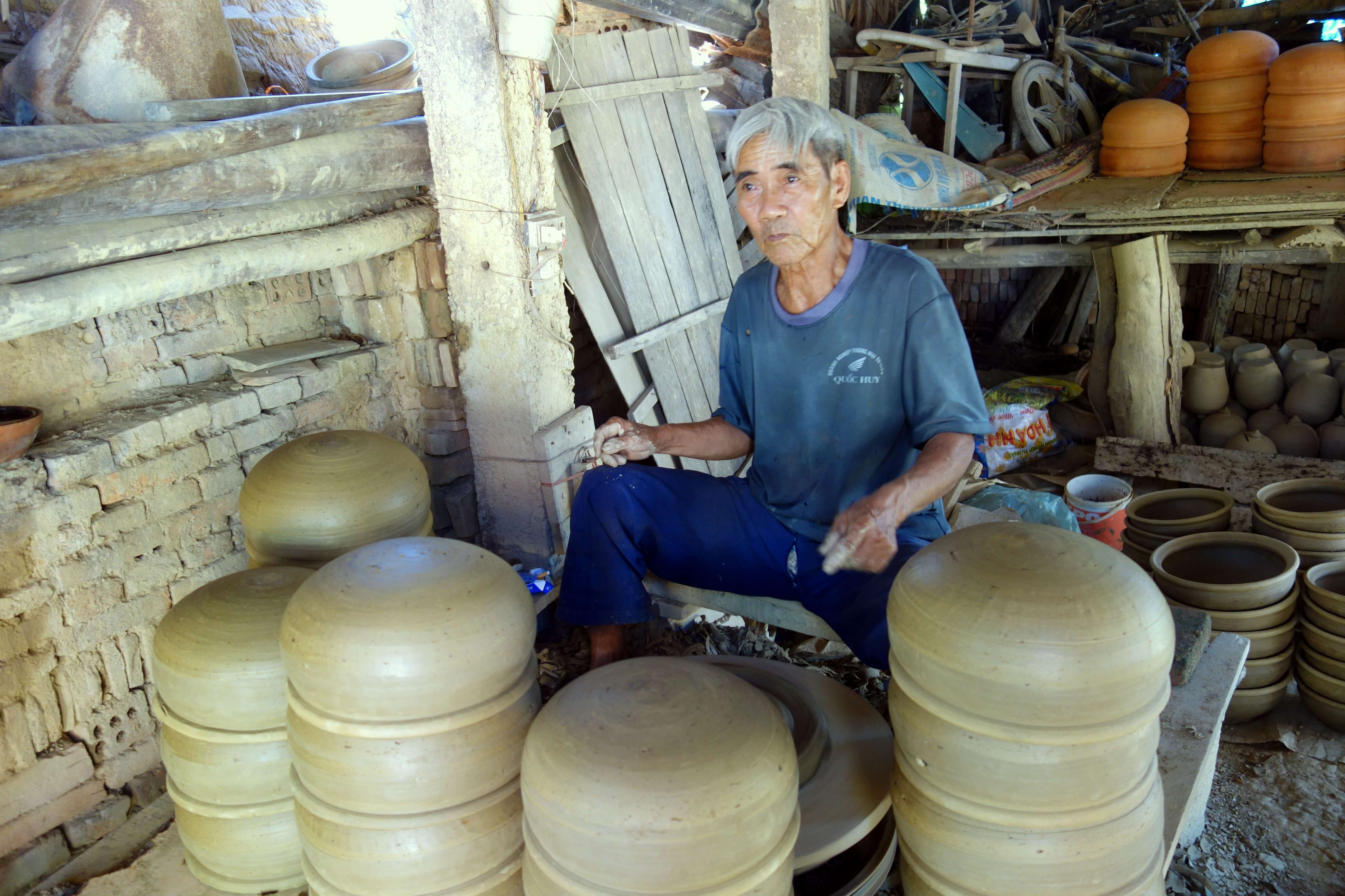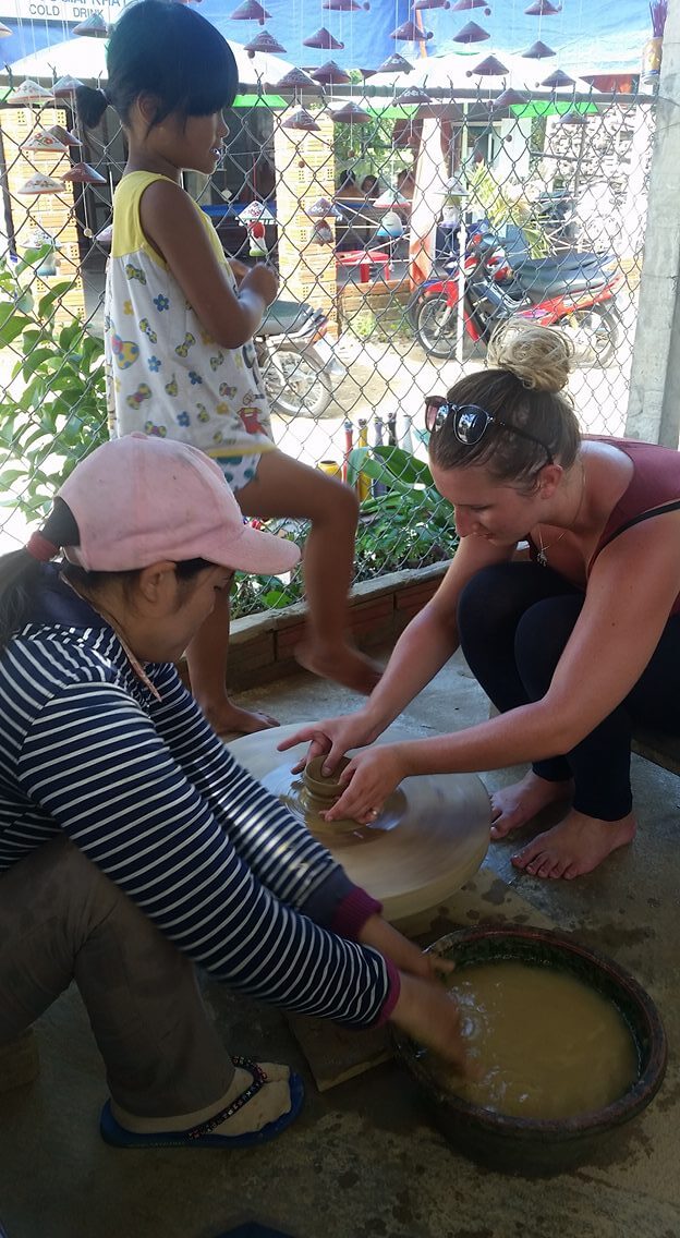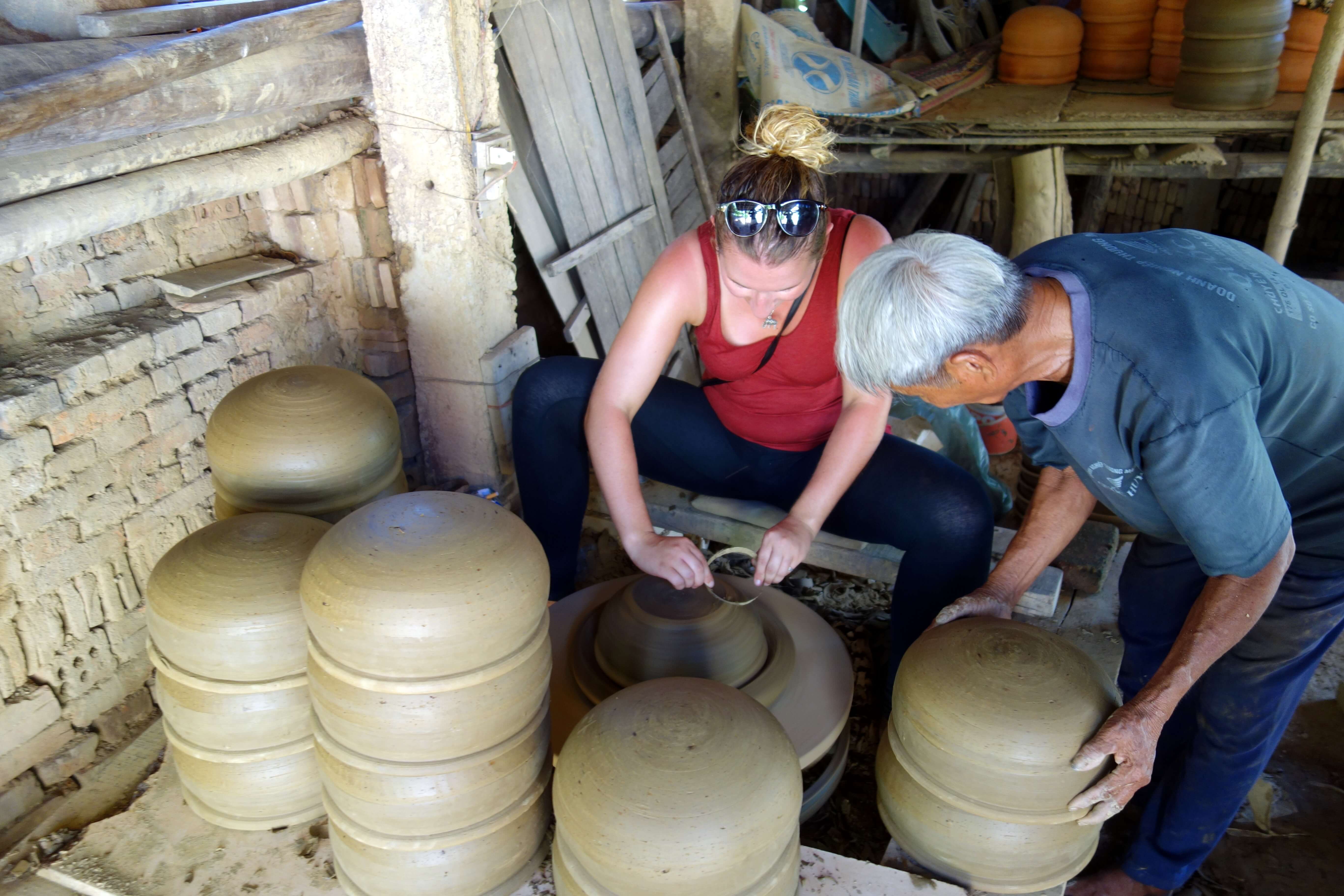 En revanche, l’entrée du village est payante, ainsi que le parking et bien sûr le musée est en plus. On ne le fera pas par manque de temps (je dois me rendre à Da Nang). Un groupe de touristes asiatiques (chinois pour ne pas les citer) nous précède. On bifurque alors vers les petites ruelles pour les devancer. On a bien fait. Ici, plus de boutiques aux superbes poteries (artisanales bien sûres, on y croit!), plus de femmes aux sourires commerciales prêtes à nous initier à la poterie et nous laisser graver notre nom, en échange d’un discours bien insistant sur ce que l’on pourrait lui acheter. (Ok, je dis ça mais on s’est prêtées au jeu haha).