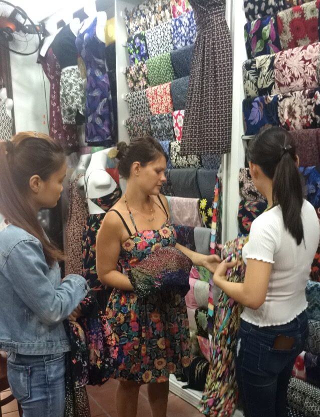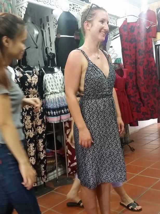 On s’entend très bien, on a la même façon de visiter et notre promenade dans la ville nous conduit donc tout naturellement, d’un temple, à un jardin, au marché local, aux fameuses boutiques de vêtements sur mesure ! Après avoir comparé plusieurs modèles, plusieurs boutiques, on finit par craquer chez Helen Tailor. Ce sera donc une robe pour moi, j’ai flashé sur un modèle de combi short en devanture et Helen va me la faire en robe au dessus du genou. Anais choisit 2 modèles de robe. Nous voici donc parties à faire les essayages de robe, regarder les tissus, prendre les mesures… Des vraies princesses !