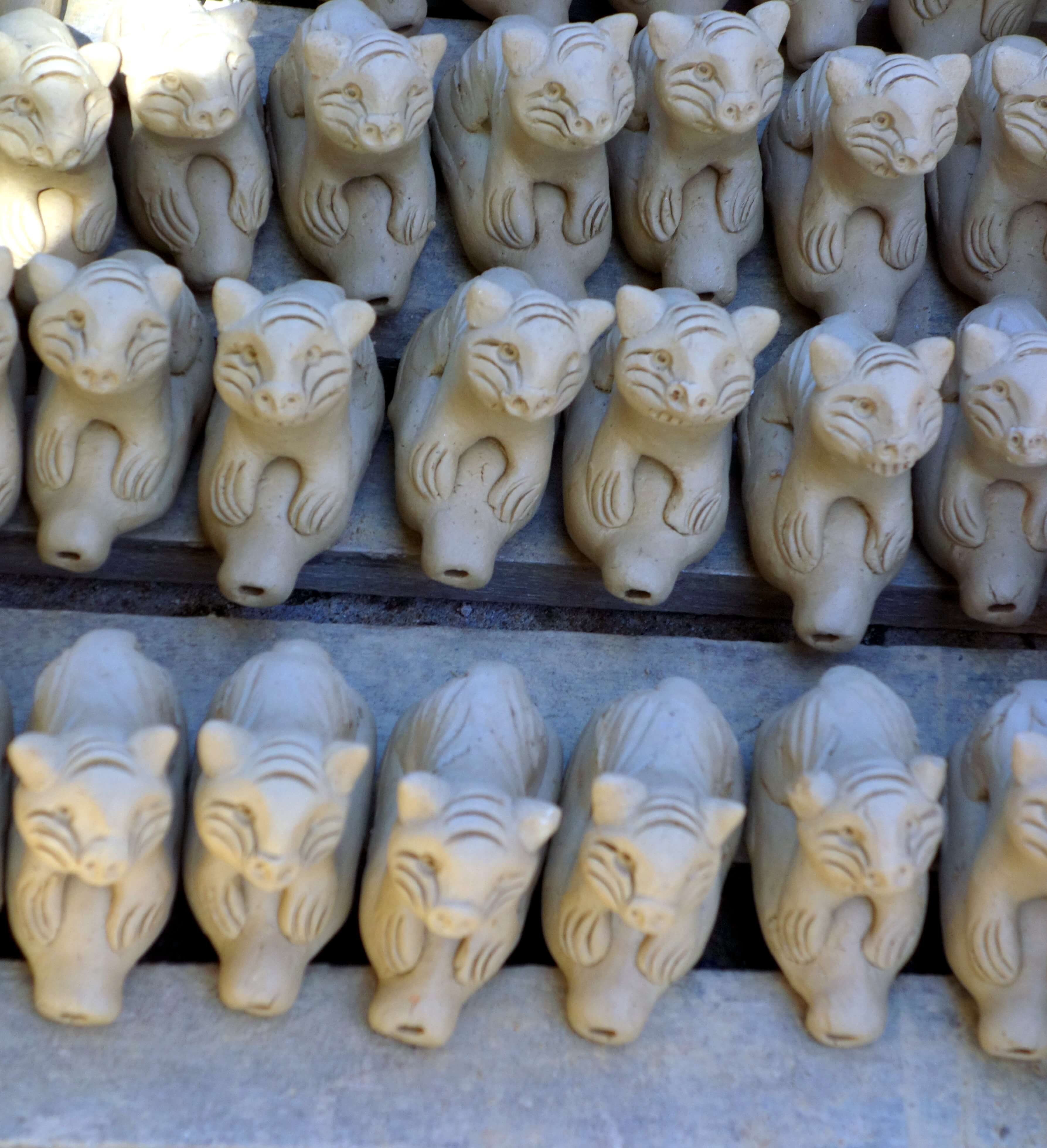 Ce qu’on découvre dans les petites ruelles n’a donc rien à voir. Les hommes travaillent l’argile, fabrique en masse des bols, saladiers, figurines,… Production qui sèche au soleil avant de recevoir les finitions. Nous observons leur travail, attentive à leurs gestes répétitifs, à leur concentration. L’un deux lève la tête et nous adresse un grand sourire. Il nous laissera son poste de travail pour s’accorder une petite pause cigarette ! Nous aurait-on exploitées ?! On se prête bien volontiers au jeu, tentant de lisser du mieux possible ces grands plats rugueux. On est loin d’être des pros !!!