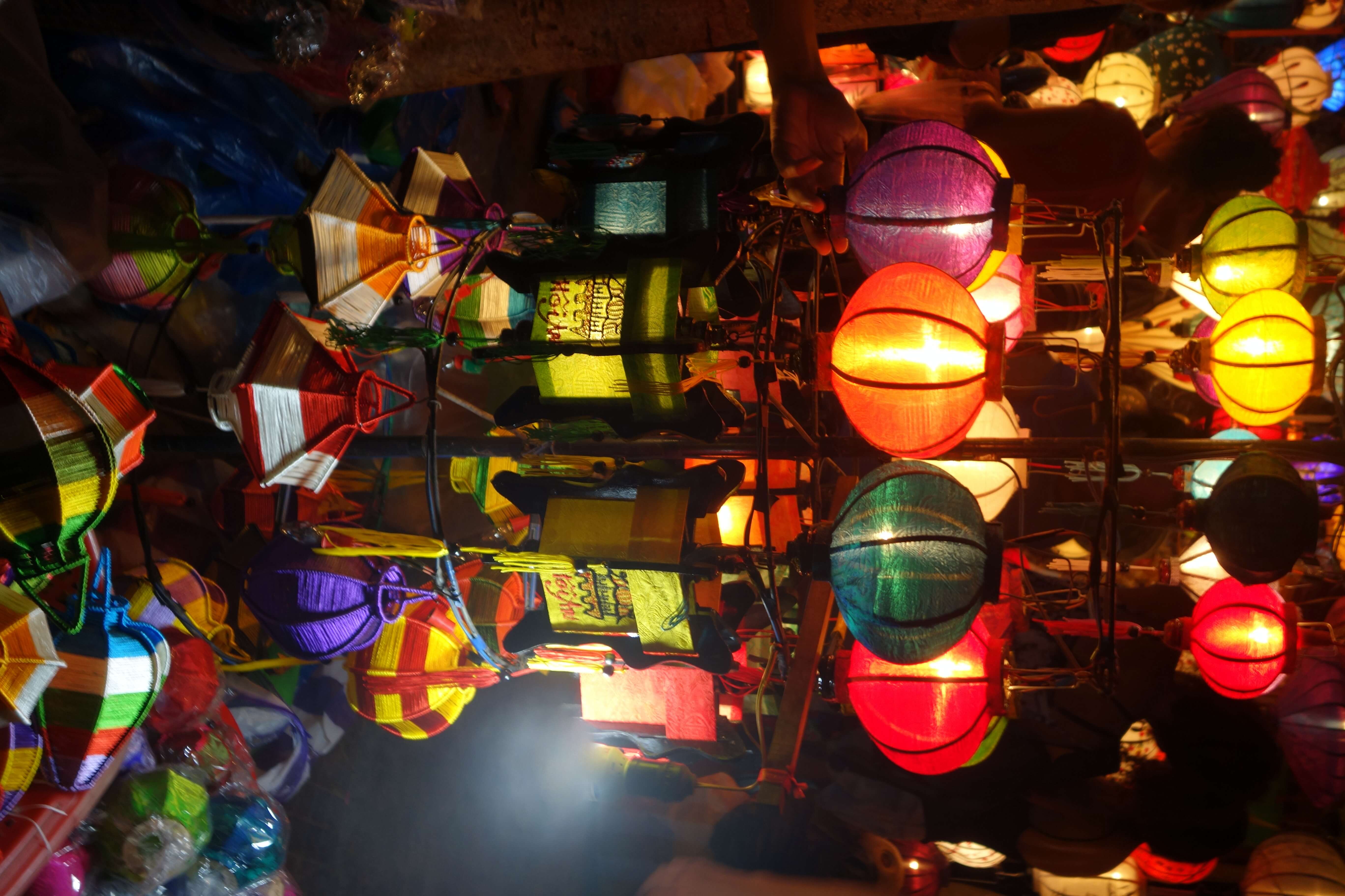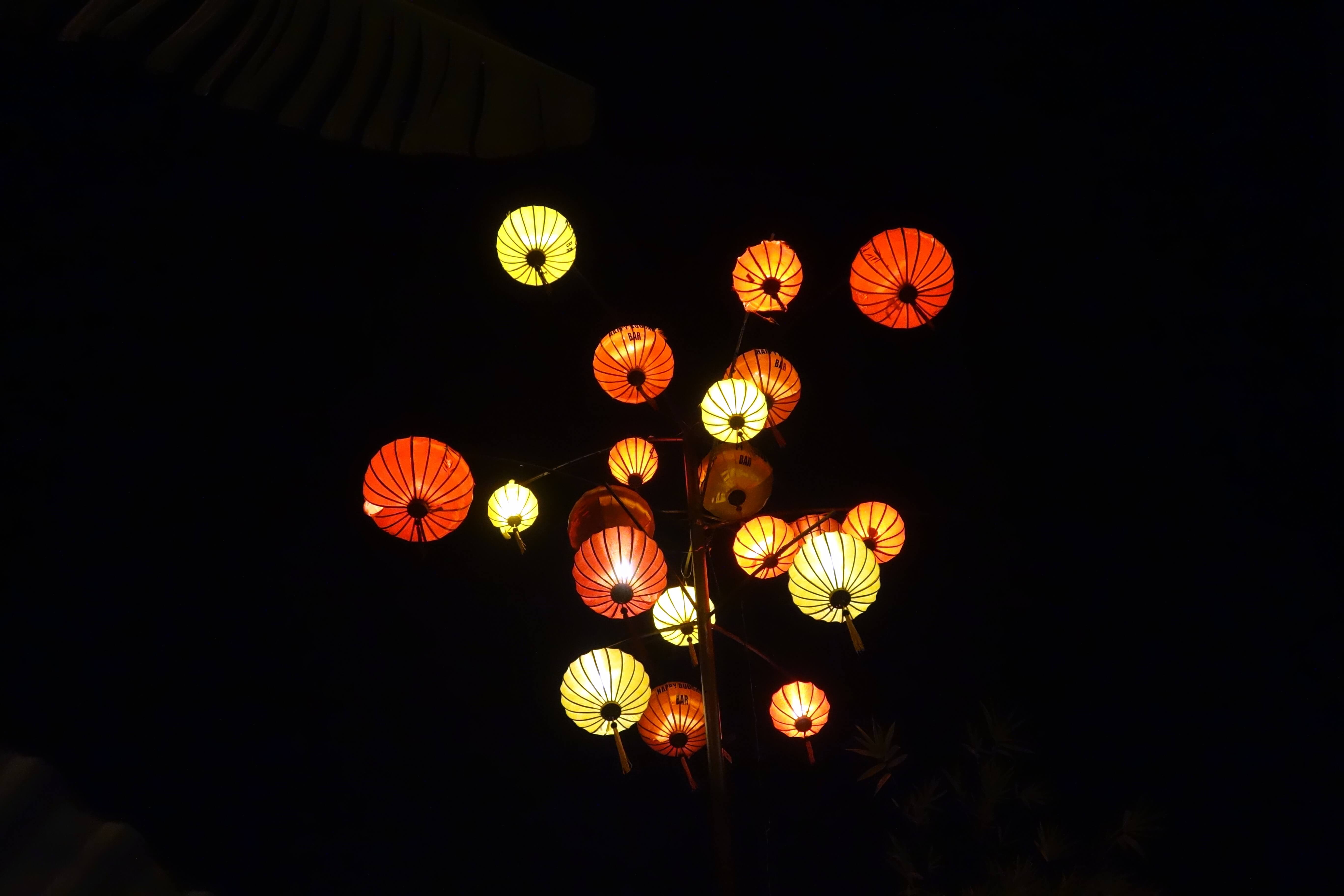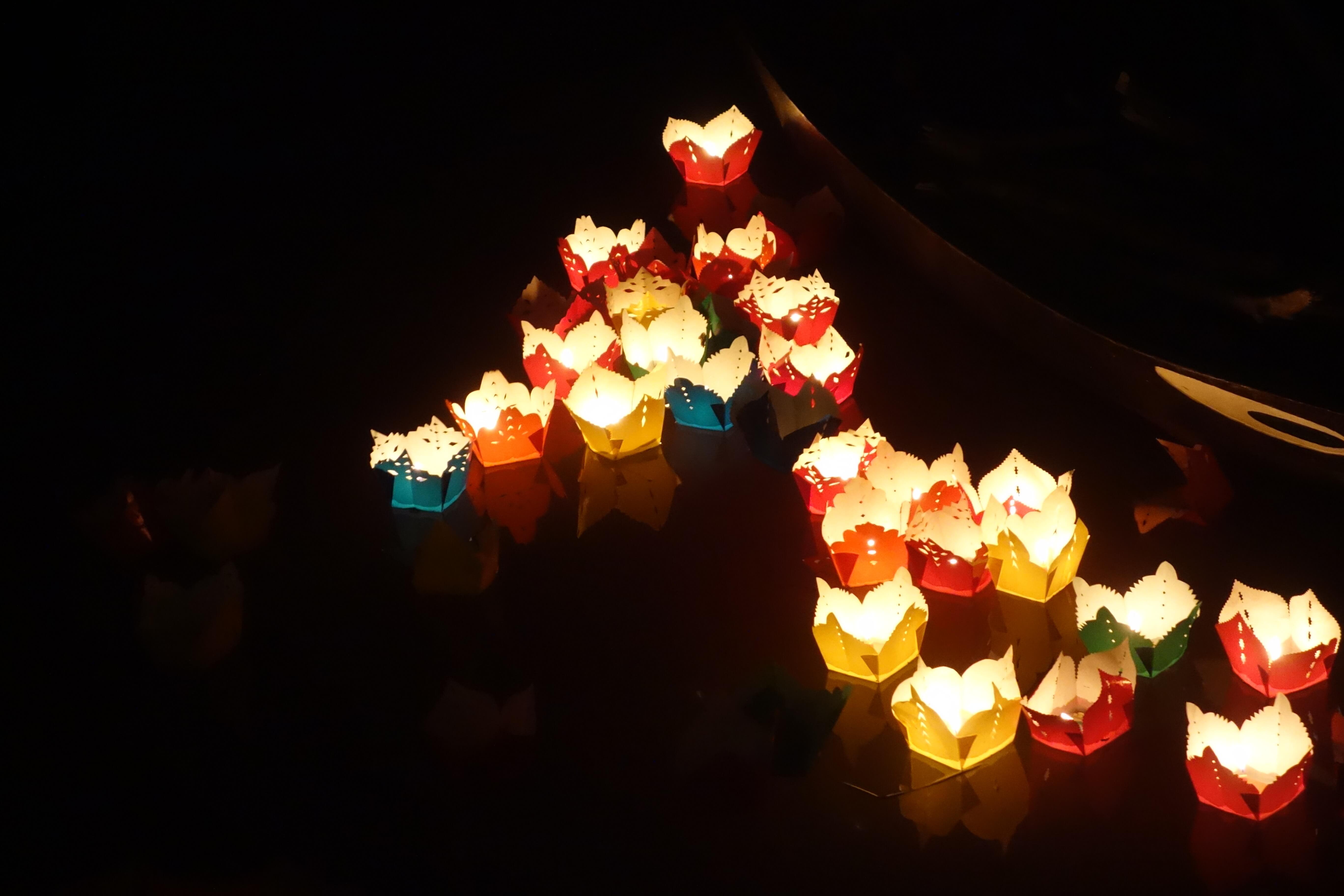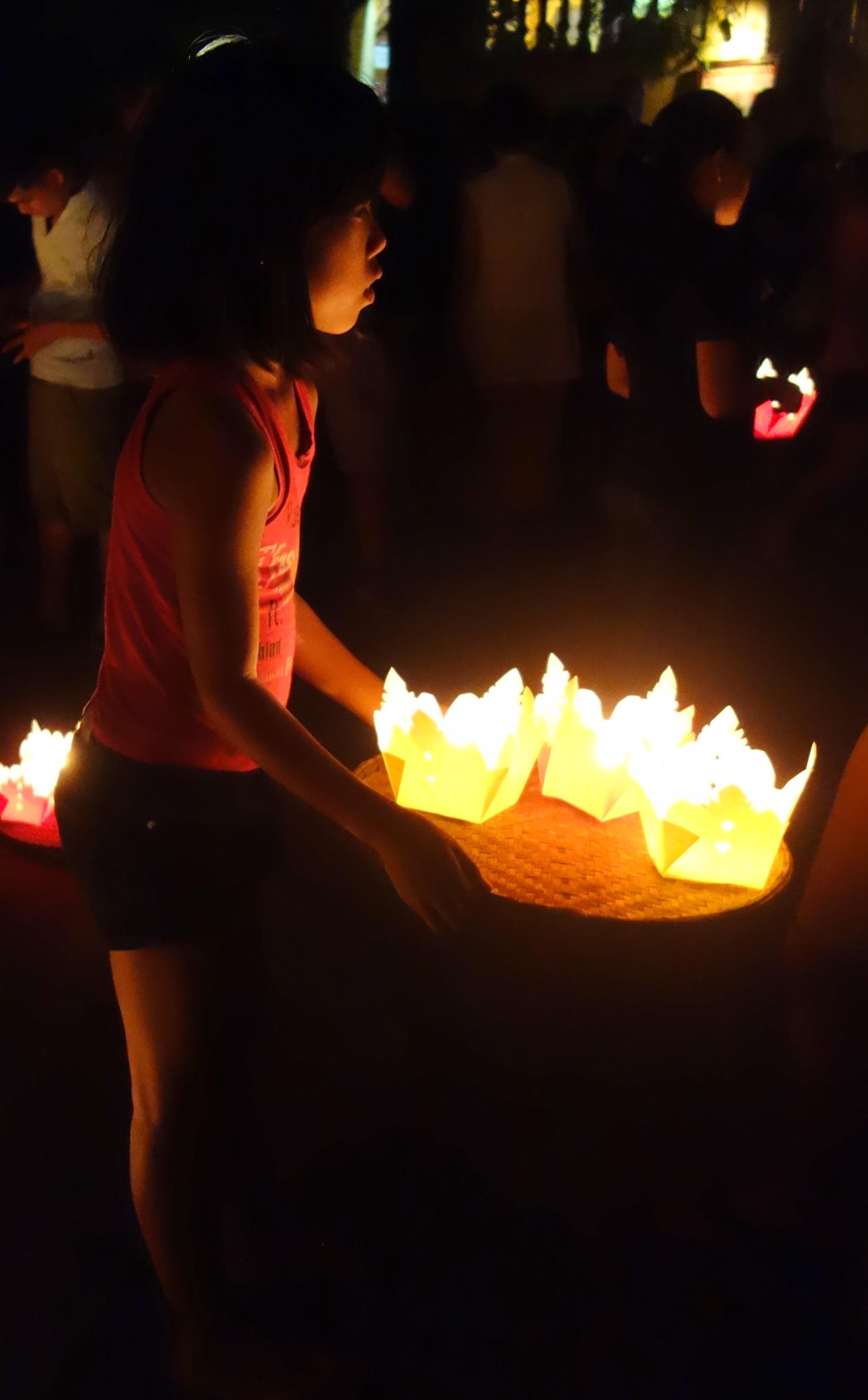 La ville est remplie, une véritable marée humaine. Tout est sombre et seules les lanternes illuminent les rues de toutes les couleurs. Le marché de nuit est toujours aussi beau, je pourrai rester des heures devant chaque stand à contempler les lampions, les motifs… On mange des fruits coupés, des beignets sucrés, on regarde les enfants danser dans leur costumes de dragons à l’entrée de chaque boutique, on écoute un groupe de jeunes qui chante pour la lutte contre le cancer, on observe les enfants vendre les petites bougies à déposer sur la rivière, on prend des photos de toutes ces illuminations !