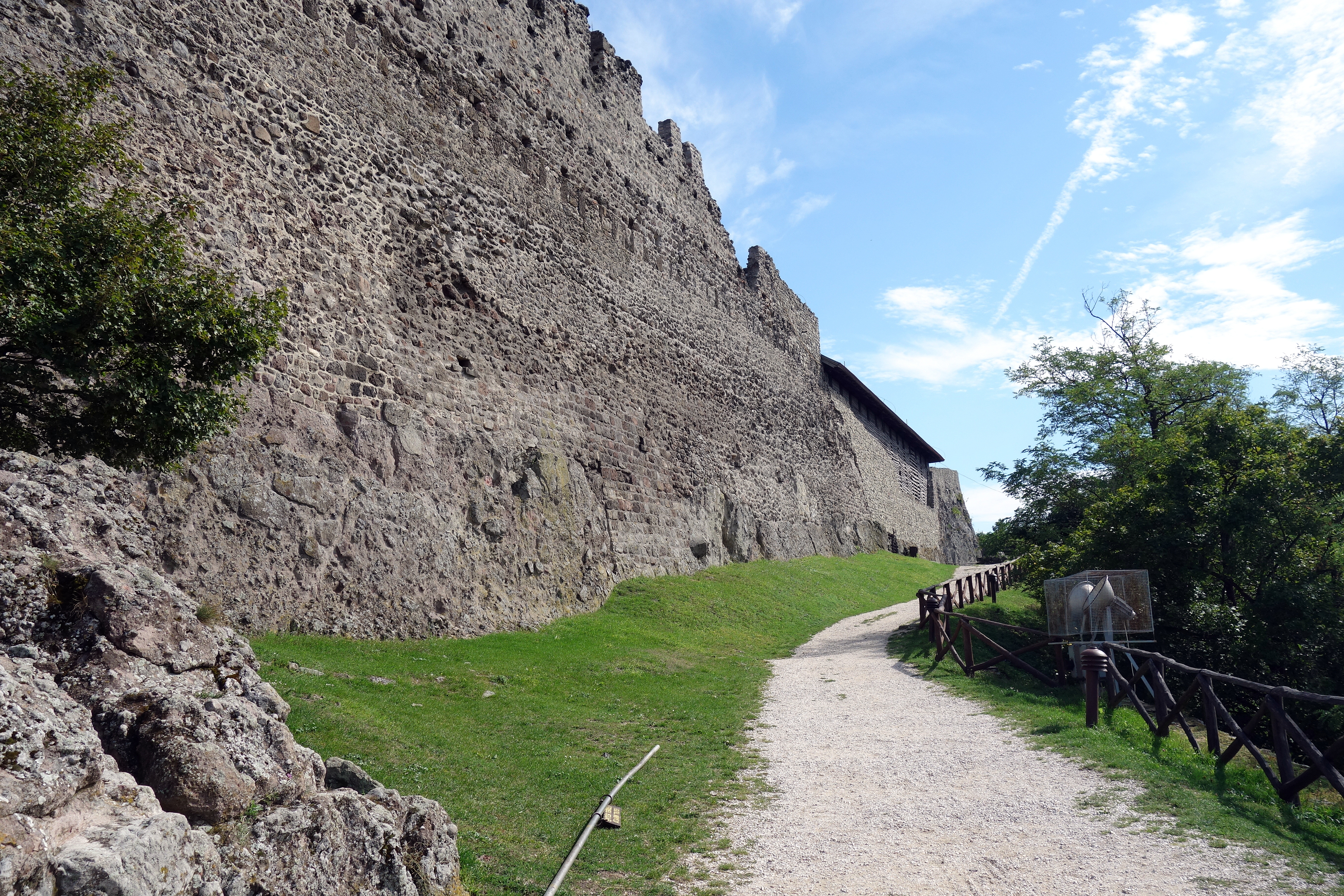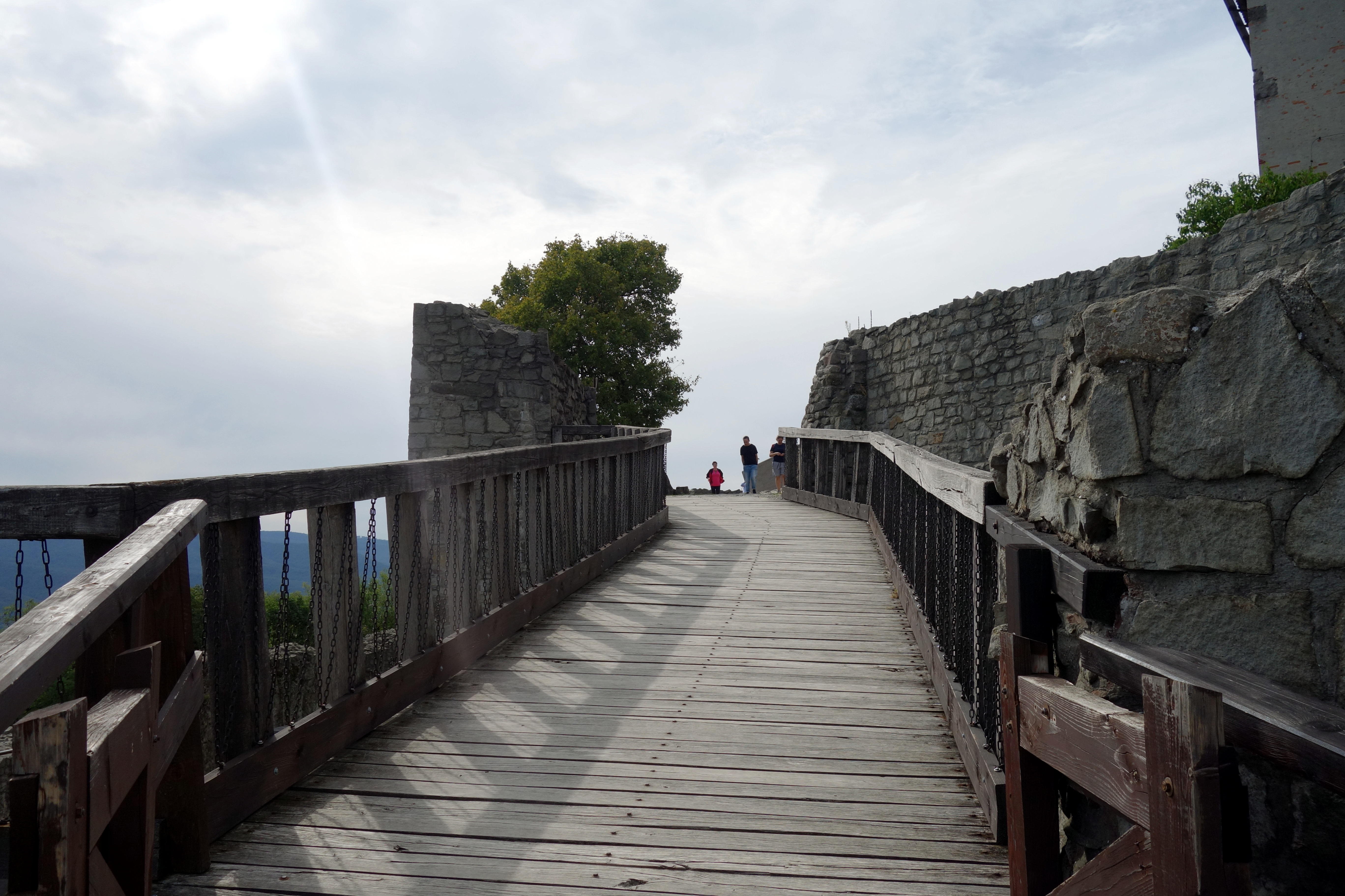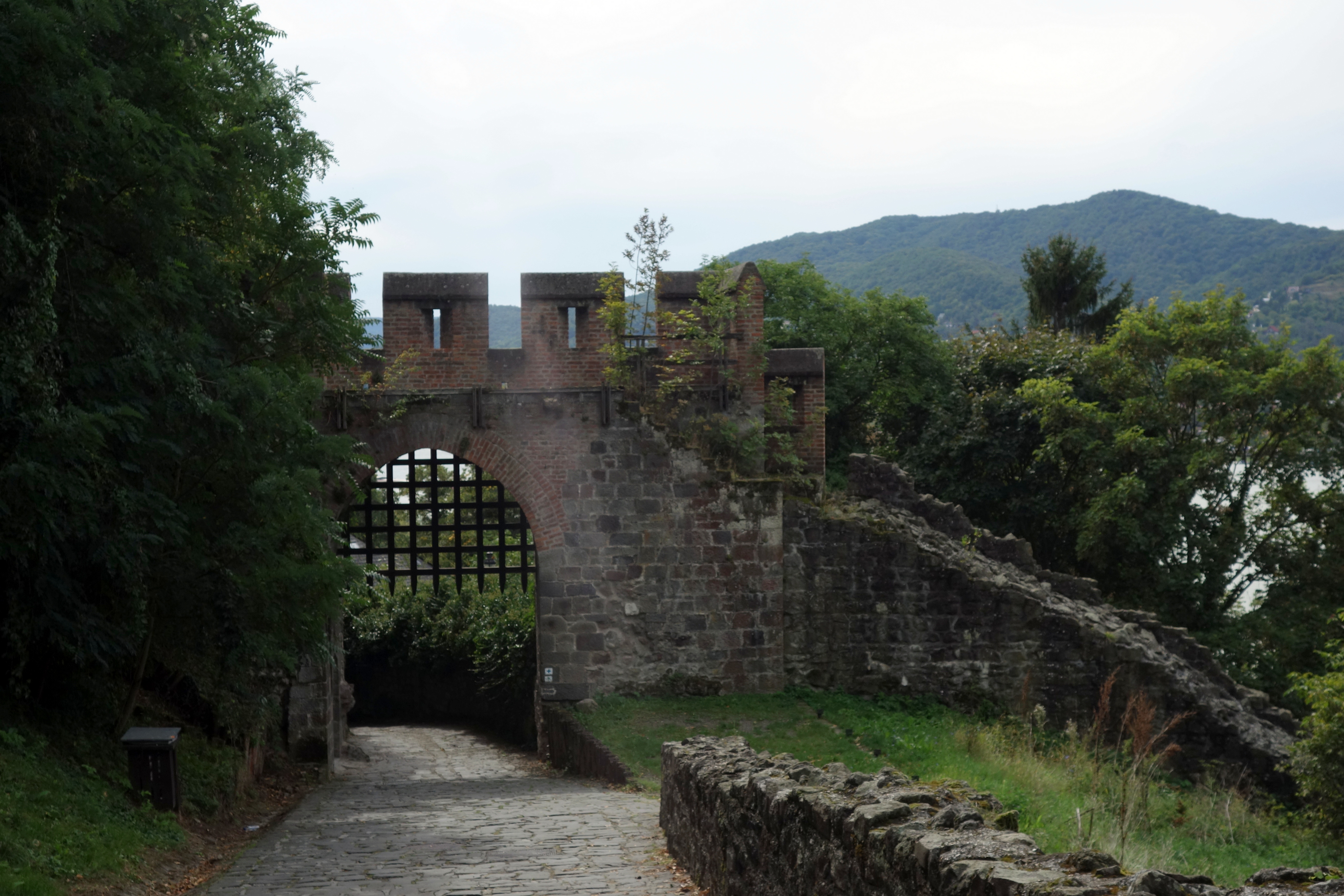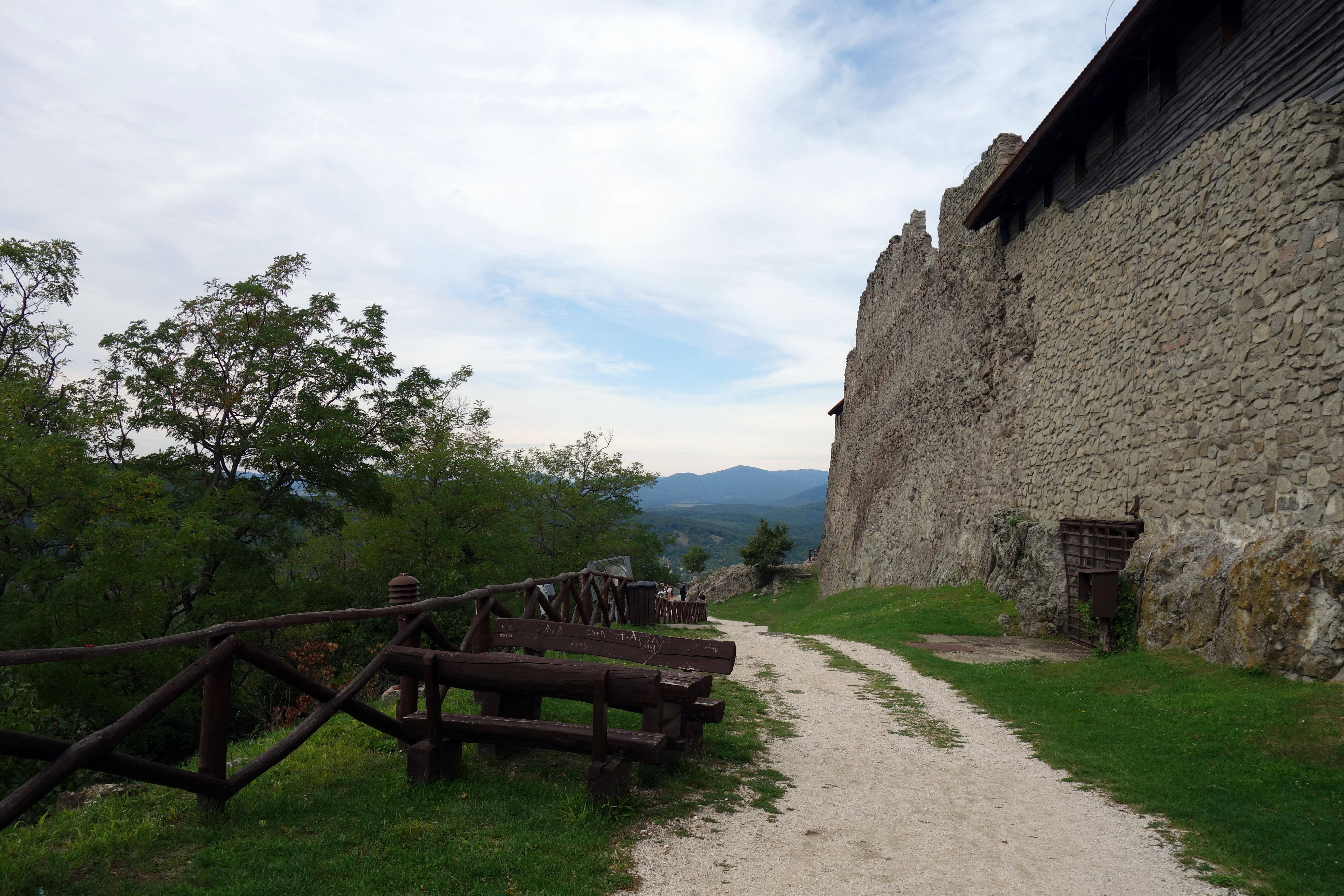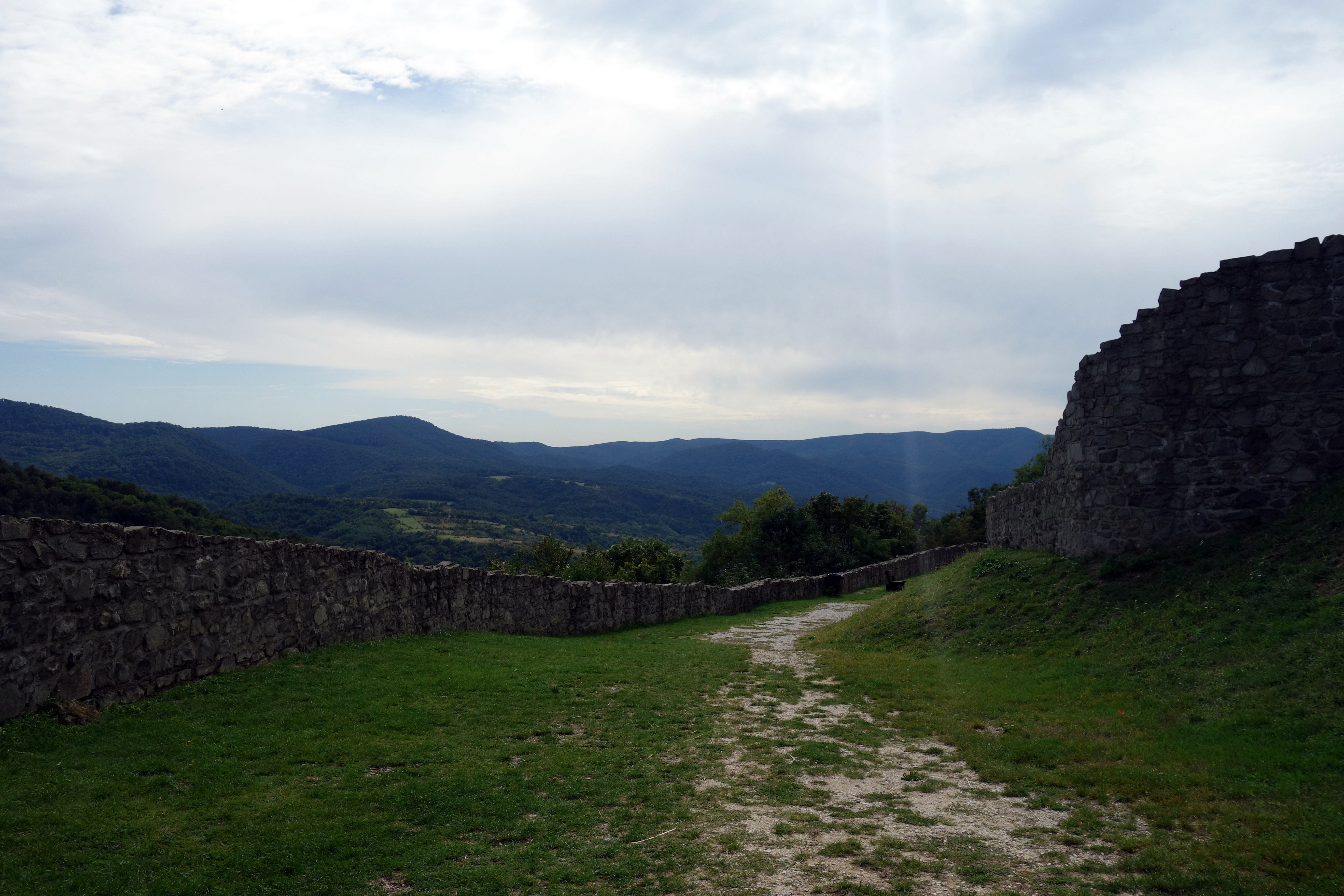 En arrivant à Visegrad, je réalise que le château que je souhaite aller voir est très haut sur la colline. Direction l’office de tourisme pour leur demander de garder mon gros sac car ce n’est pas dans cette ville que j’ai prévu de dormir ce soir. La conseillère de l’office accepte très gentiment et me montre sur le plan comment rejoindre le château, il y en a pour 40 minutes apparemment. Je commence la grimpette et rencontre un petit chat adorable qui vient se frotter à moi et ronronner, trop adorable !!! Je suis pleine de poils, moins adorable… la montée ne rigole pas, on coupe à travers la forêt, le sol est glissant, mais les petits bouts de paysage que j’arrive à apercevoir entre les arbres me motivent. J’arrive finalement en haut et paye l’entrée du château (1400 ft, 3€, un peu cher pour l’endroit mais seul moyen de profiter du panorama).