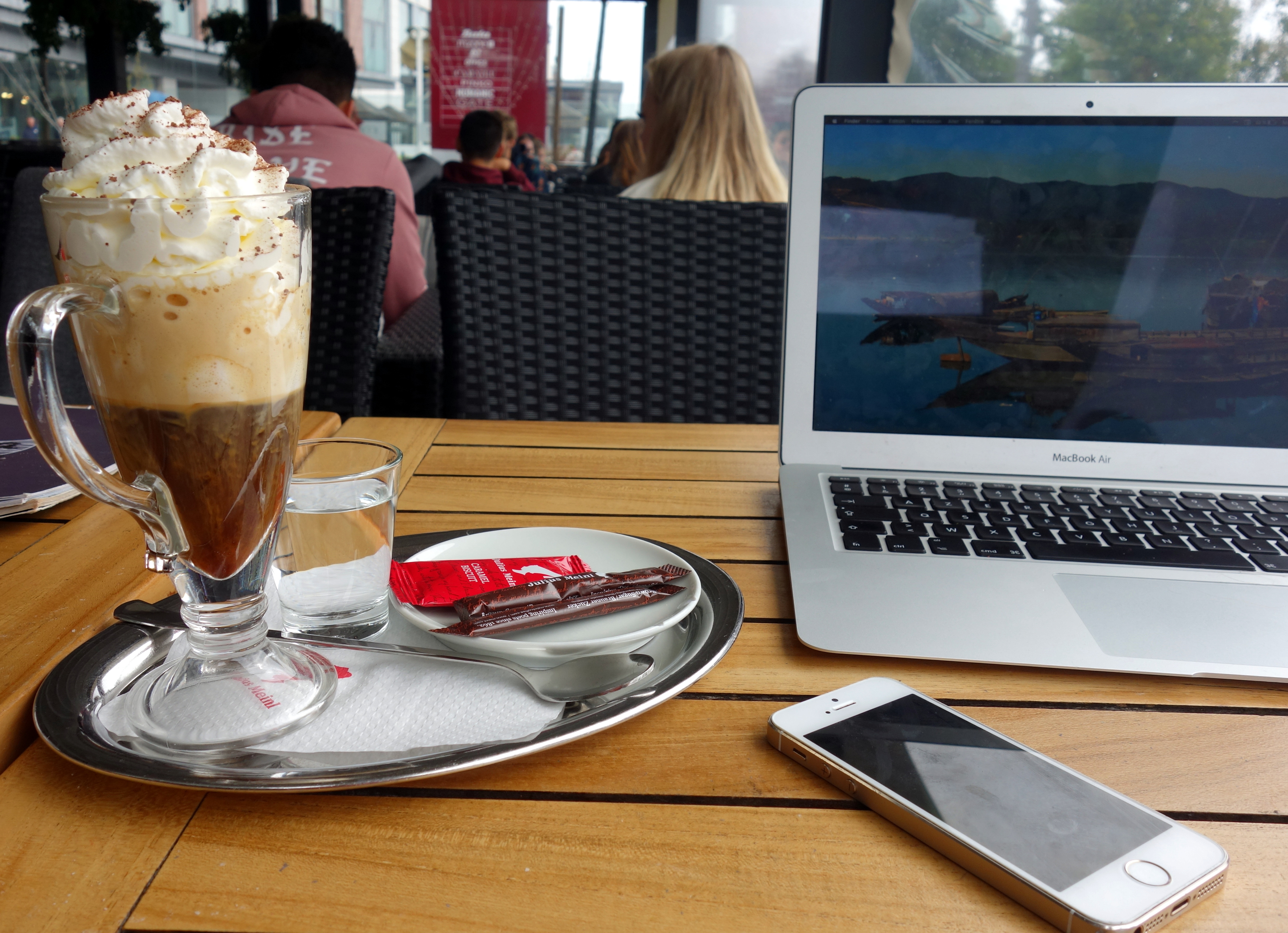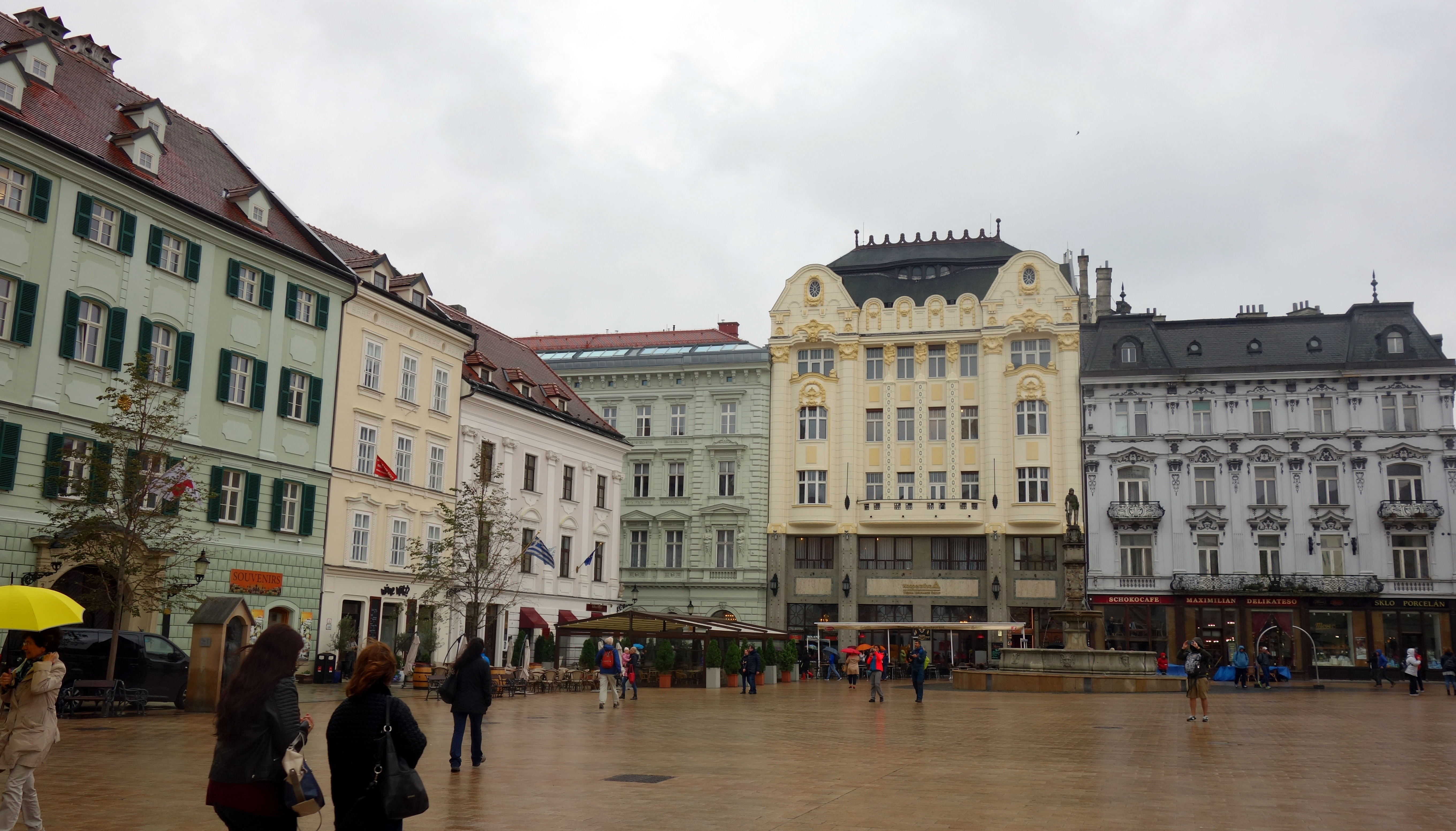 Arrivés à Bratislava, ils me proposent de me déposer dans un grand centre commercial, Eurovea, au bord de la rivière. Ça me va ! Je me pose en terrasse couverte (il pleut encore et toujours … !) et commande un café viennois, eh oui, il serait bête d’être aussi près de Vienne et de ne pas en profiter 😉