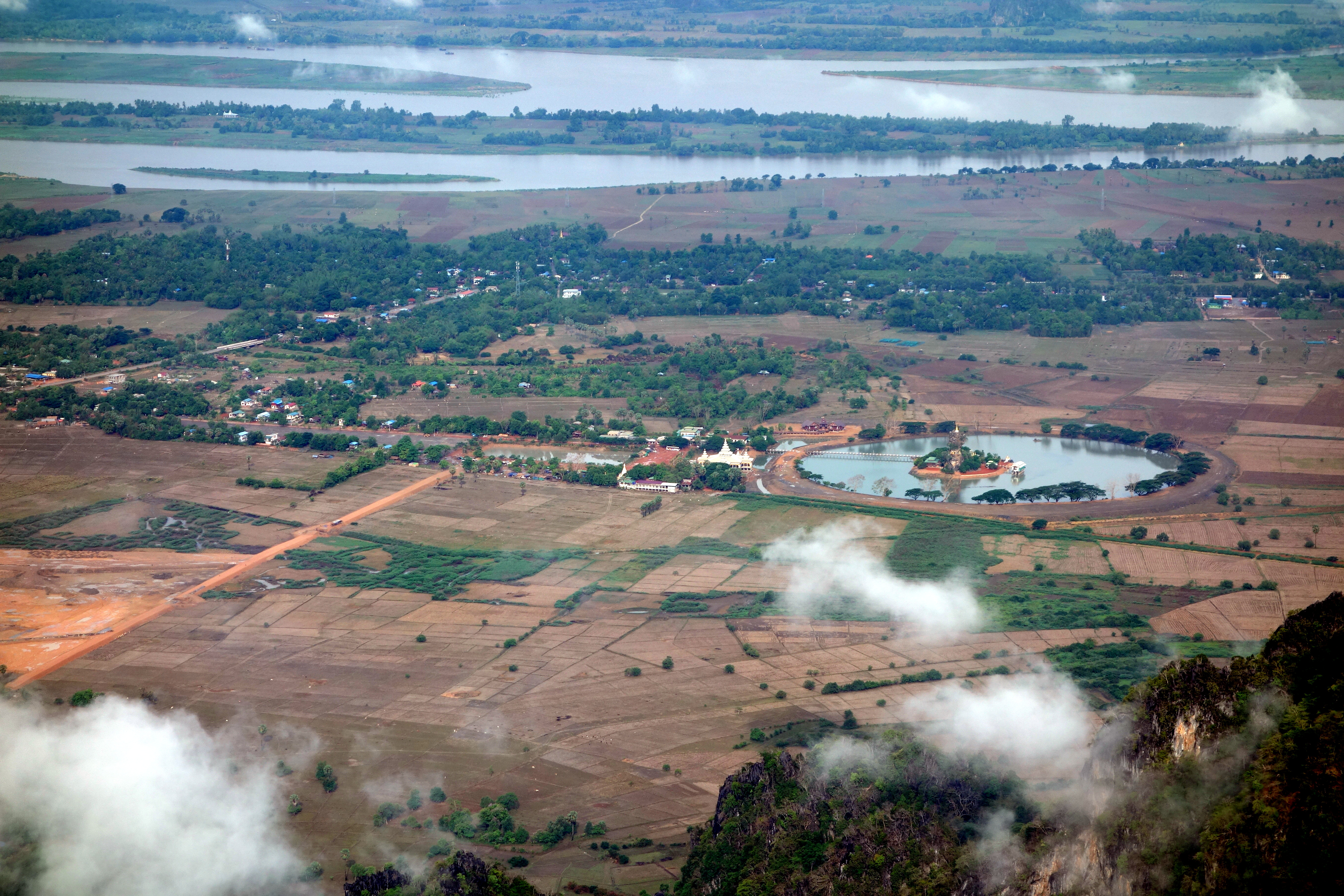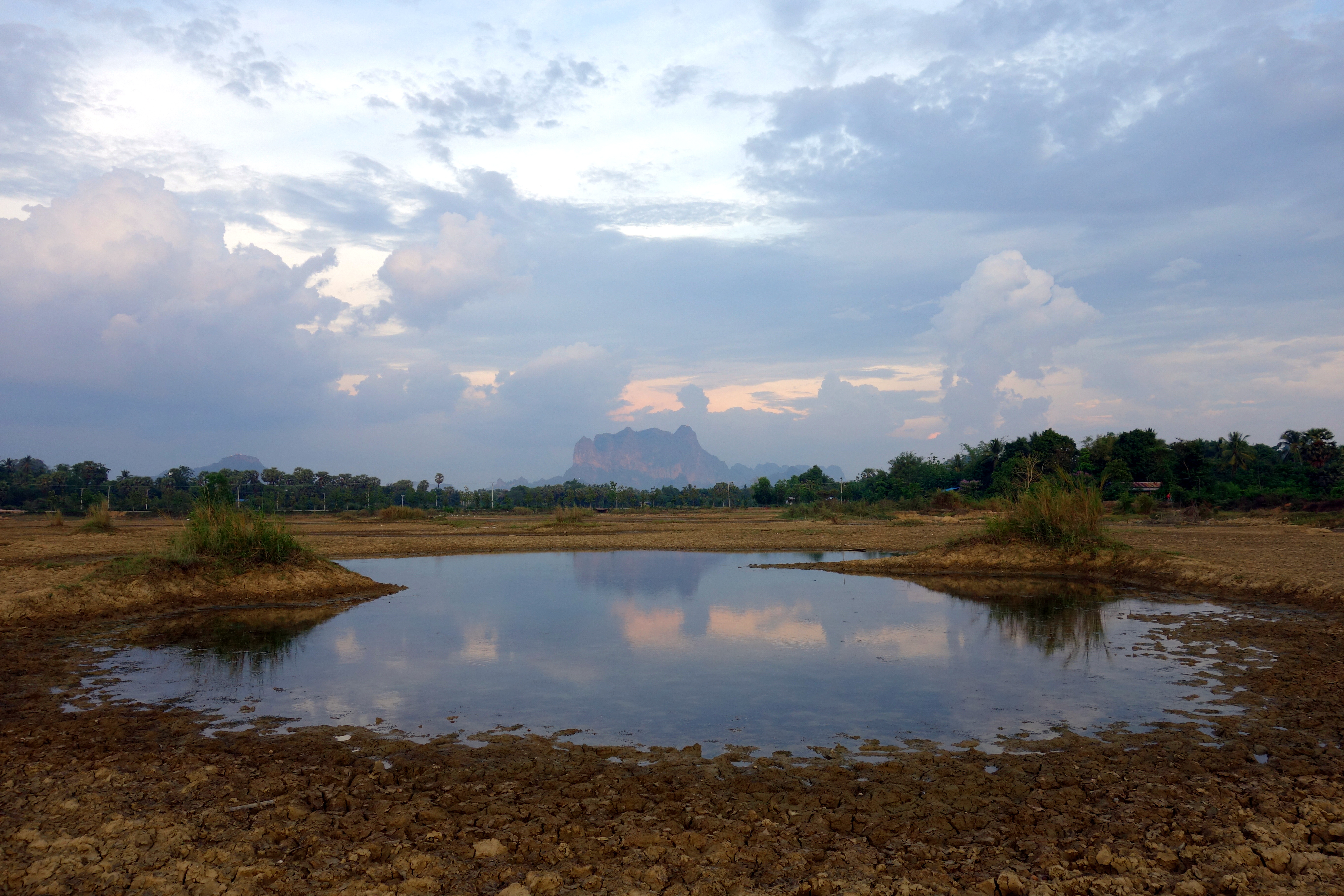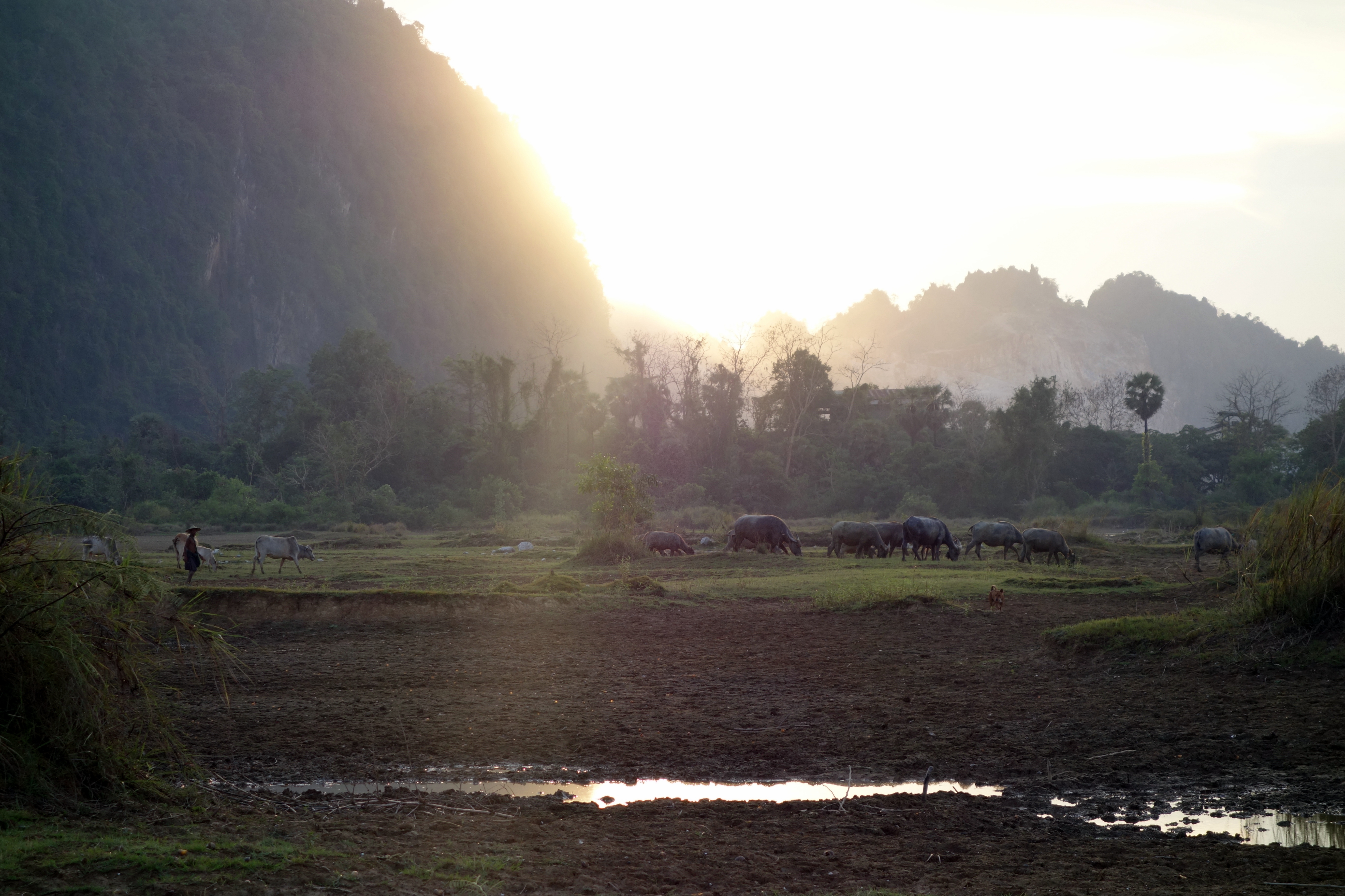 On continue à conduire et on se retrouve face à une scène hors du temps. Le soleil commence à sa coucher derrière les montagnes. Une carrière fait de la poussière et rend la scène mystique .. On se gare au bord de la route et décidons de traverser un champ pour se rendre au petit temple que l’on aperçoit en face. On croise un fermier avec ses buffles, un pêcheur enfoncé jusqu’à la taille dans des marécages… La terre est pourtant très sèche tout autour, elle est toute craquée, on se croirait dans le désert.