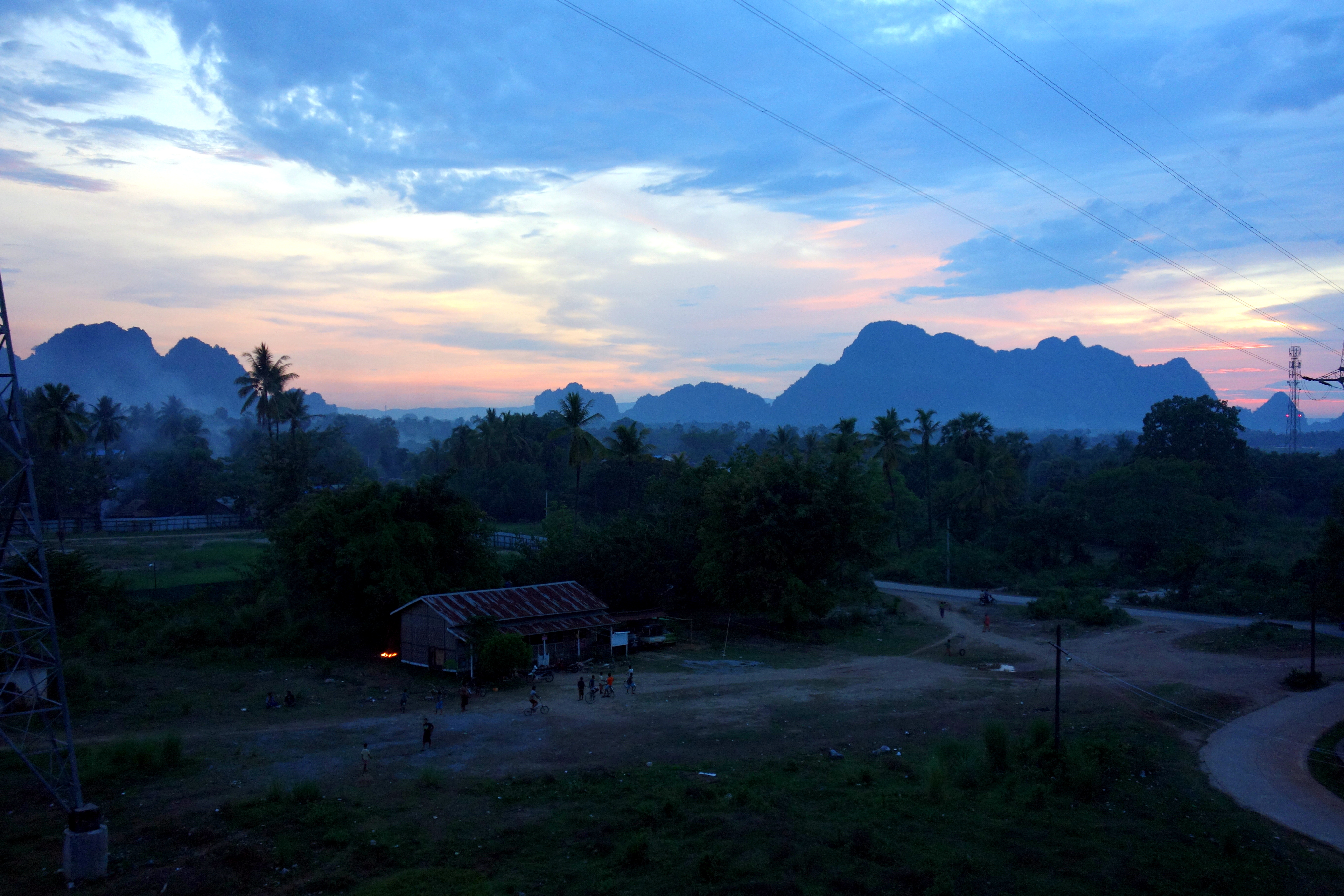 Felicia m’a rejoint et on décide de retenter l’escalade de la montagne la nuit suivante ! Pour ce qui concerne la fin de notre journée, on va aller se promener dans les petits villages. Et alors là, c’est émotions puissance 10 000 ! On passe dans des endroits incroyables. Les enfants jouent au ballon dans la rue et nous font de grands signes. On voit les personnes âgées assises dans la cour des jardins nous faire de grands sourires, les parents qui nous font coucou ou appellent leurs enfants pour qu’ils nous « voient » et nous fassent un signe de la main. Ce sont des endroits extrêmement pauvres, le salaire moyen en Birmanie est de 50€/mois… Les maisons sont faites en bois, en feuilles séchées, en terre. Il y a souvent un puits dans le village où les jeunes hommes pompent laissant apparaître tous les muscles de leurs frêles corps. Les femmes portent toujours un bébé sur le dos. les enfants aident les parents dans les champs, à pêcher, à cuisiner .. Ici, ils ne doivent pas être scolarisés. Je n’avais jamais vu autant d’enfants travailler depuis le début de mon voyage. Dès 3 ans, ils apprennent à porter les charges sur leurs têtes et font des aller-retours avec des sac de sables sur leur petite tête. Mais en parallèle, ça ne fait pas misère, une telle générosité et de si beaux sourires s’échappent de leurs visages que je ne ressens pas de pitié. Mais çà me fait de la peine oui…