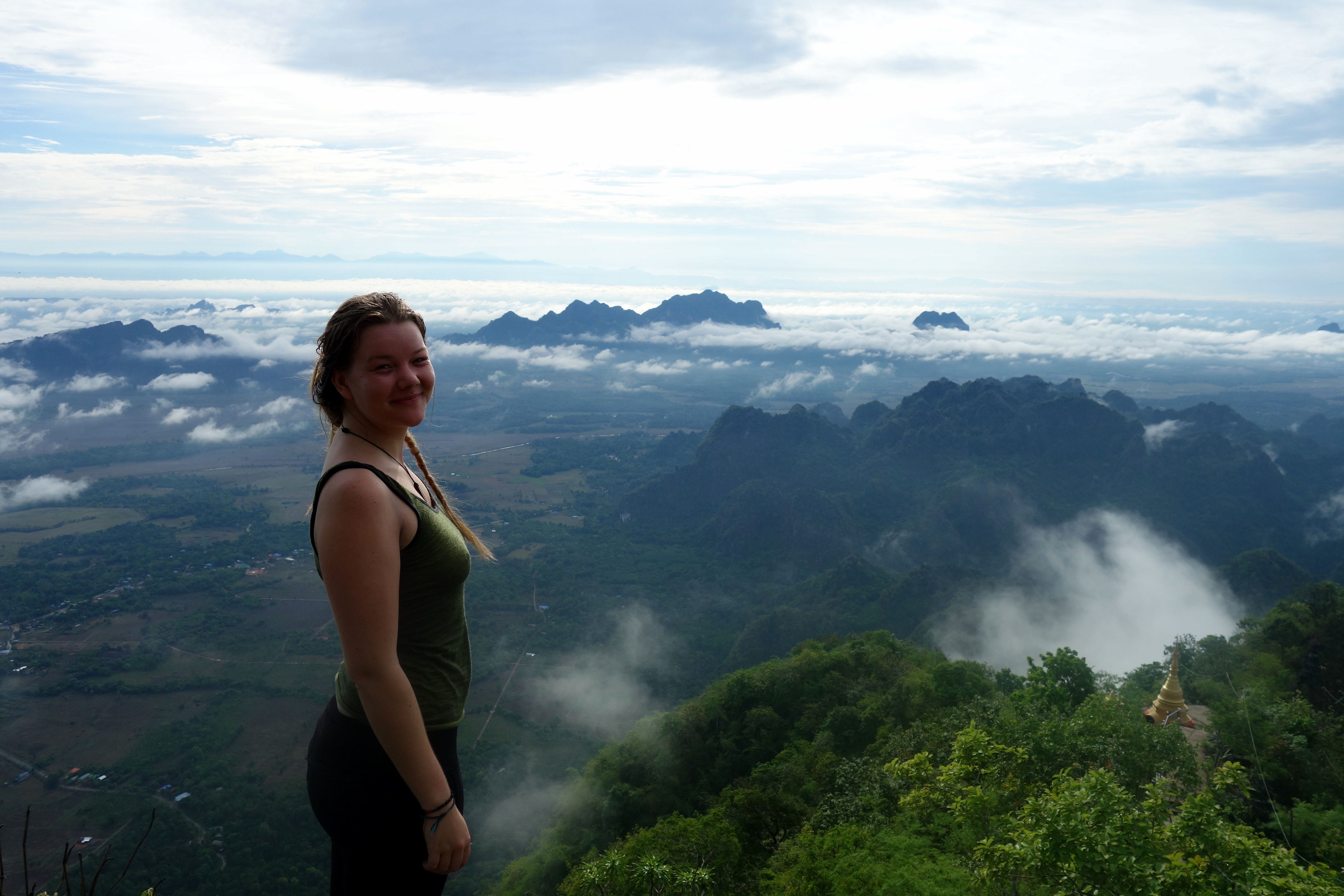 Elisa m’avait vantée le Mont Zwegabin ! Elle m’avait dit que c’était plus dur qu’Adams Peak alors je suis curieuse !! On décide de s’y rendre à 2h45 du matin pour y être au lever du soleil. Accompagnée de Felicia et d’une amie suisse à elle. On se met en route, cerveau embrumé mais motivées ! Après 15 minutes de route, alors qu’on est à mi-chemin du point de départ, une énorme averse se déclenche. On s’arrête sous un abri sur le trottoir en se disant que ça va passer. Malheureusement, la pluie fait des bulles sur le sol, c’est mauvais signe ! Et effectivement, 1h30 plus tard, on est toujours assises sur le trottoir. La pluie ne ralentit pas. La route est complètement inondée, on est juste dégoutées. On pourrait être dans nos lits, au lieu de ça on est assises par terre dans le noir et on a … froid !